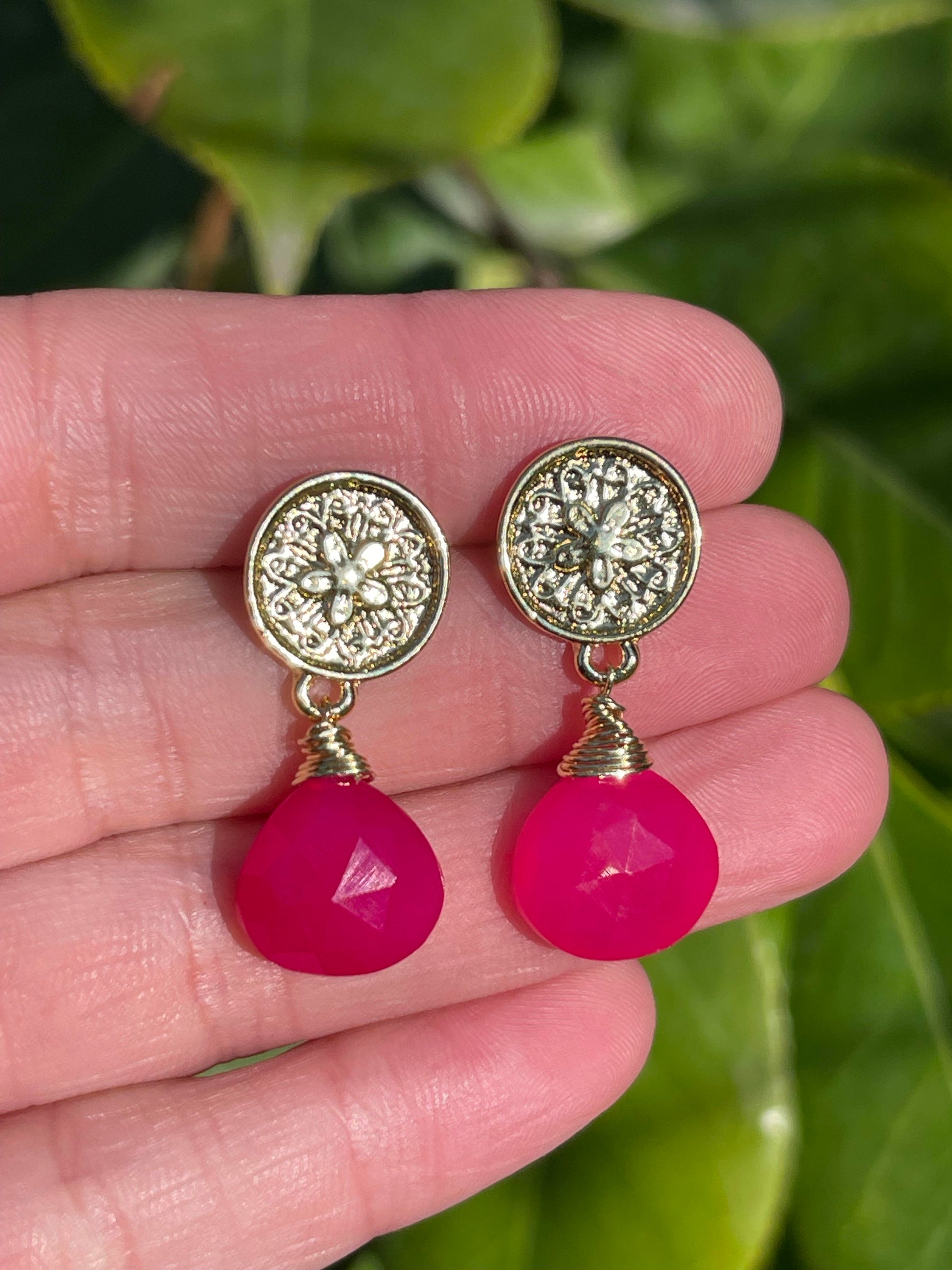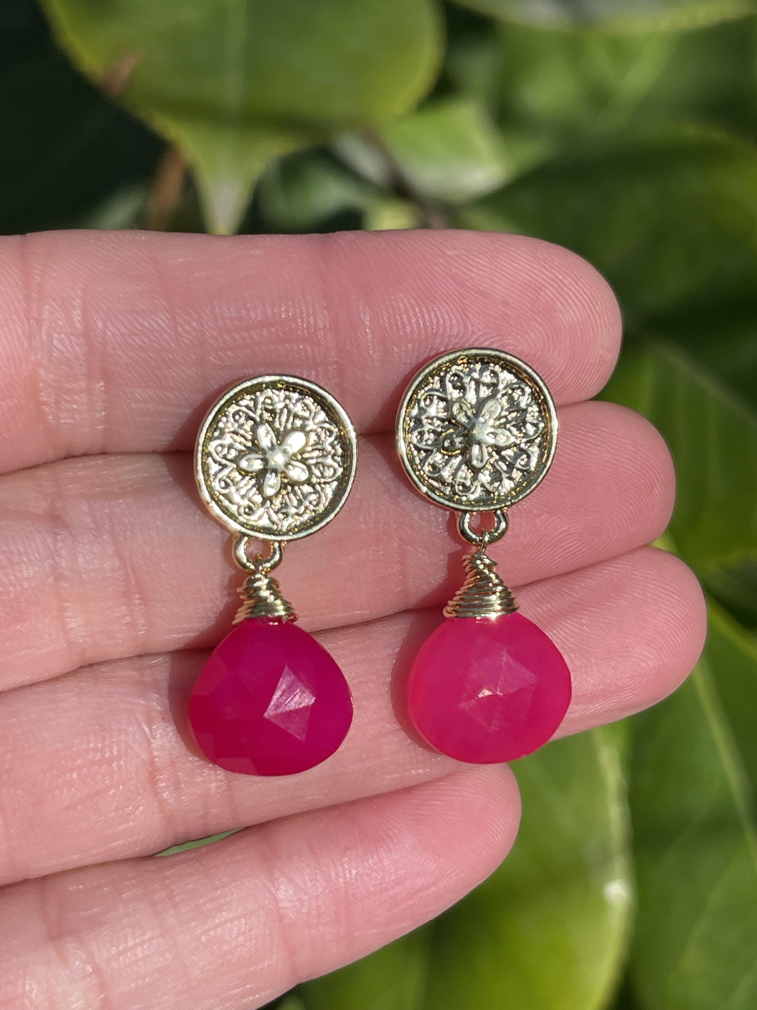 Aros Hippie Chic bañados en oro con alegre piedra natural Calcedonia fucsia facetada y embarrilada con hilo de oro.. Largo 3 cm.
