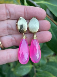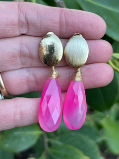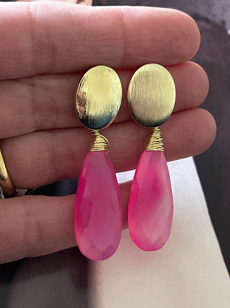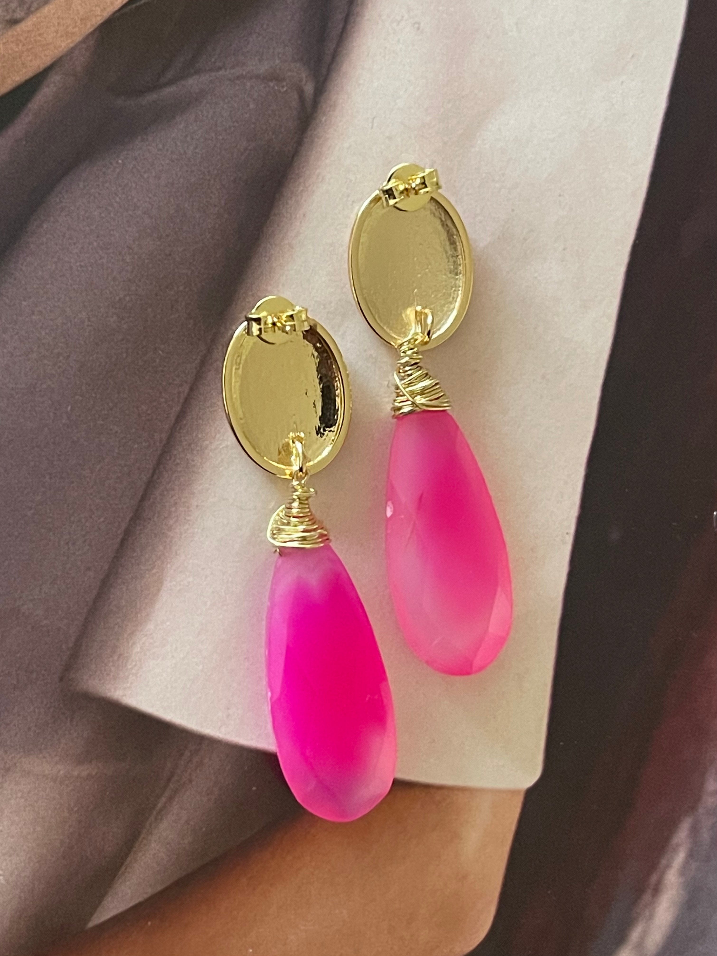 Aros Hippie Chic bañados en oro con alegre piedra natural Calcedonia fucsia. Largo 5 cm.