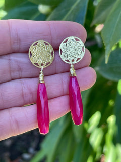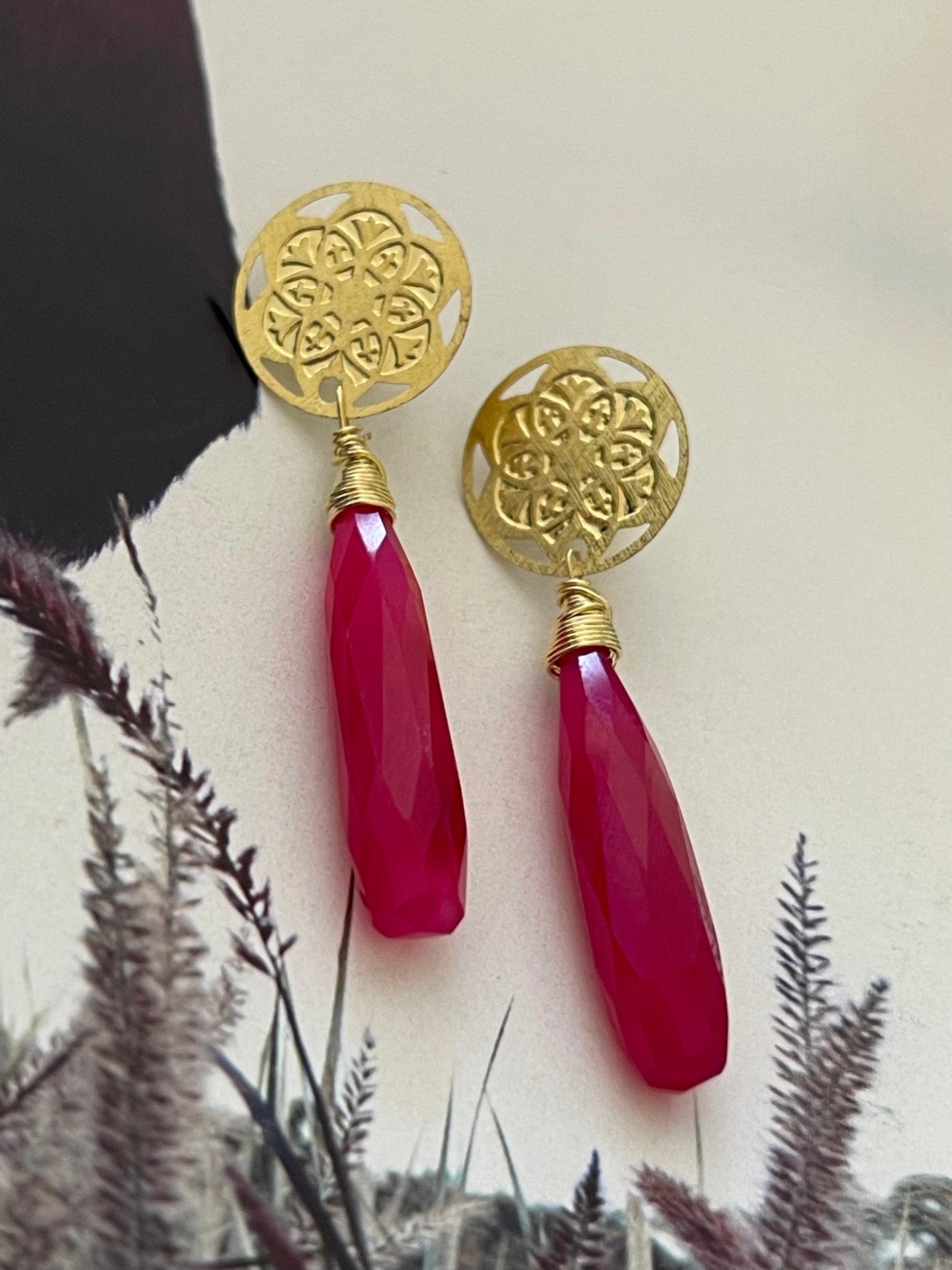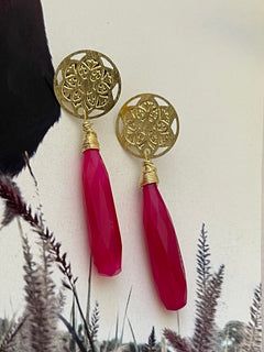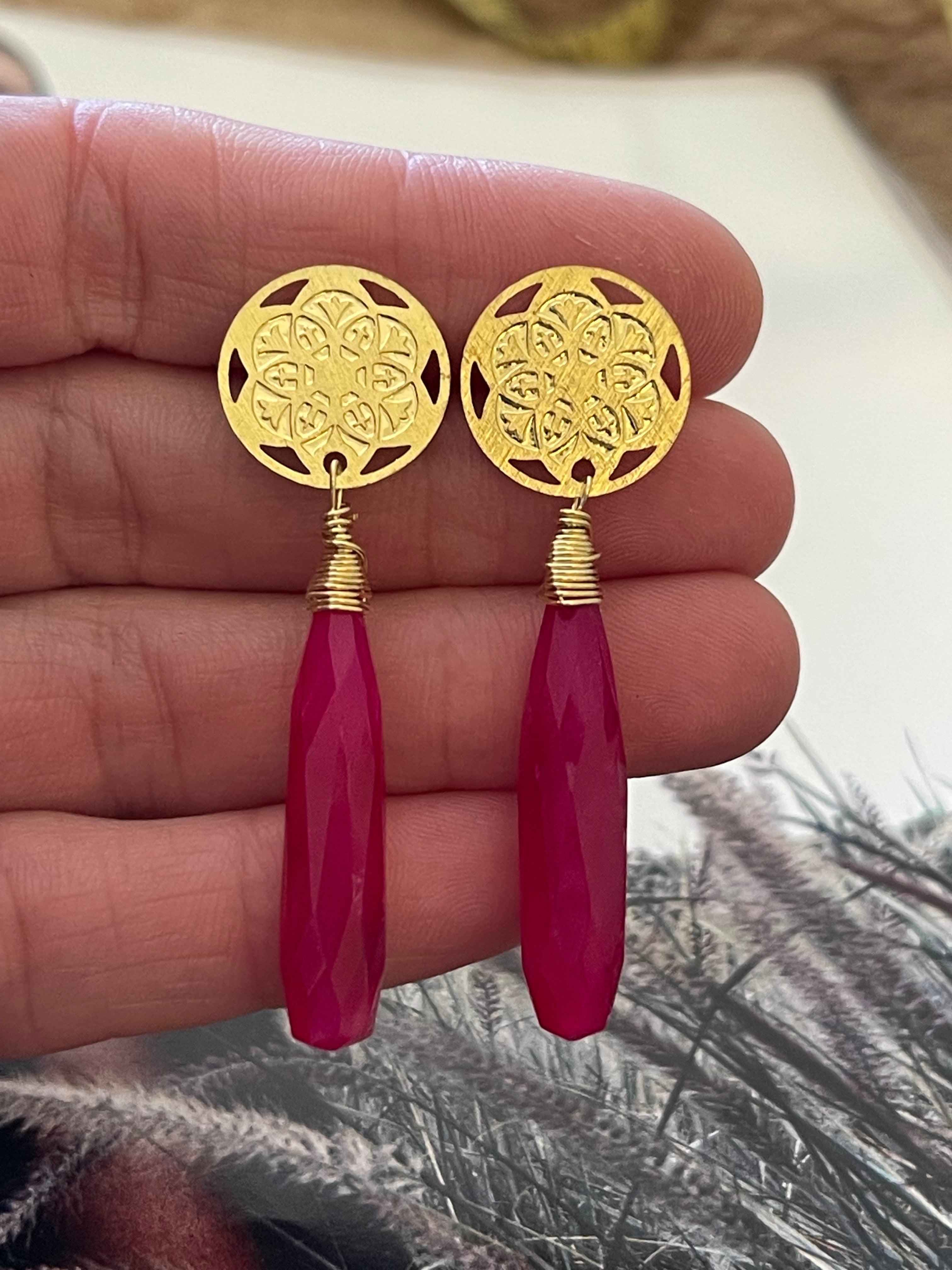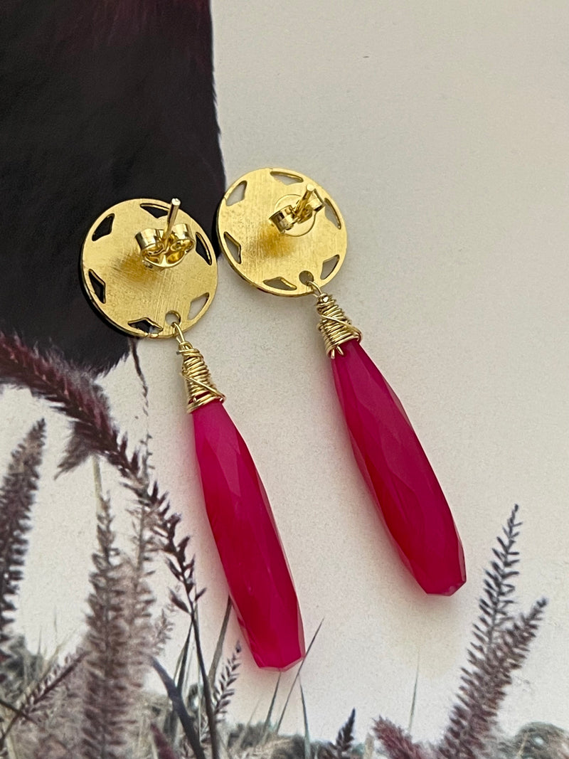 Aros Hippie Chic bañados en oro con elegante Calcedonia fucsia facetada y embarrilada con hilo de oro. Largo 5 cm.