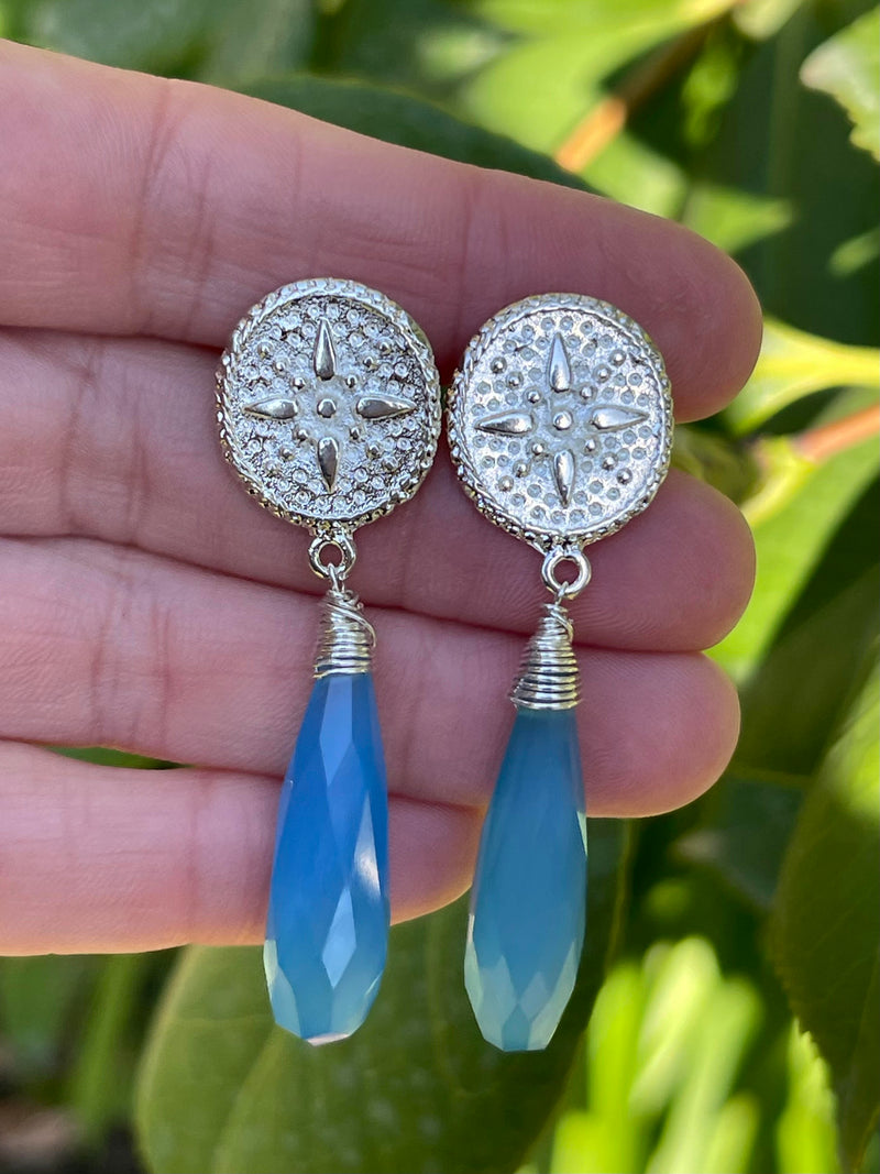 Aros Hippie Chic bañados en plata con elegante piedra Calcedonia celeste facetada embarrilada con hilo de plata. Largo 5.3 cm.