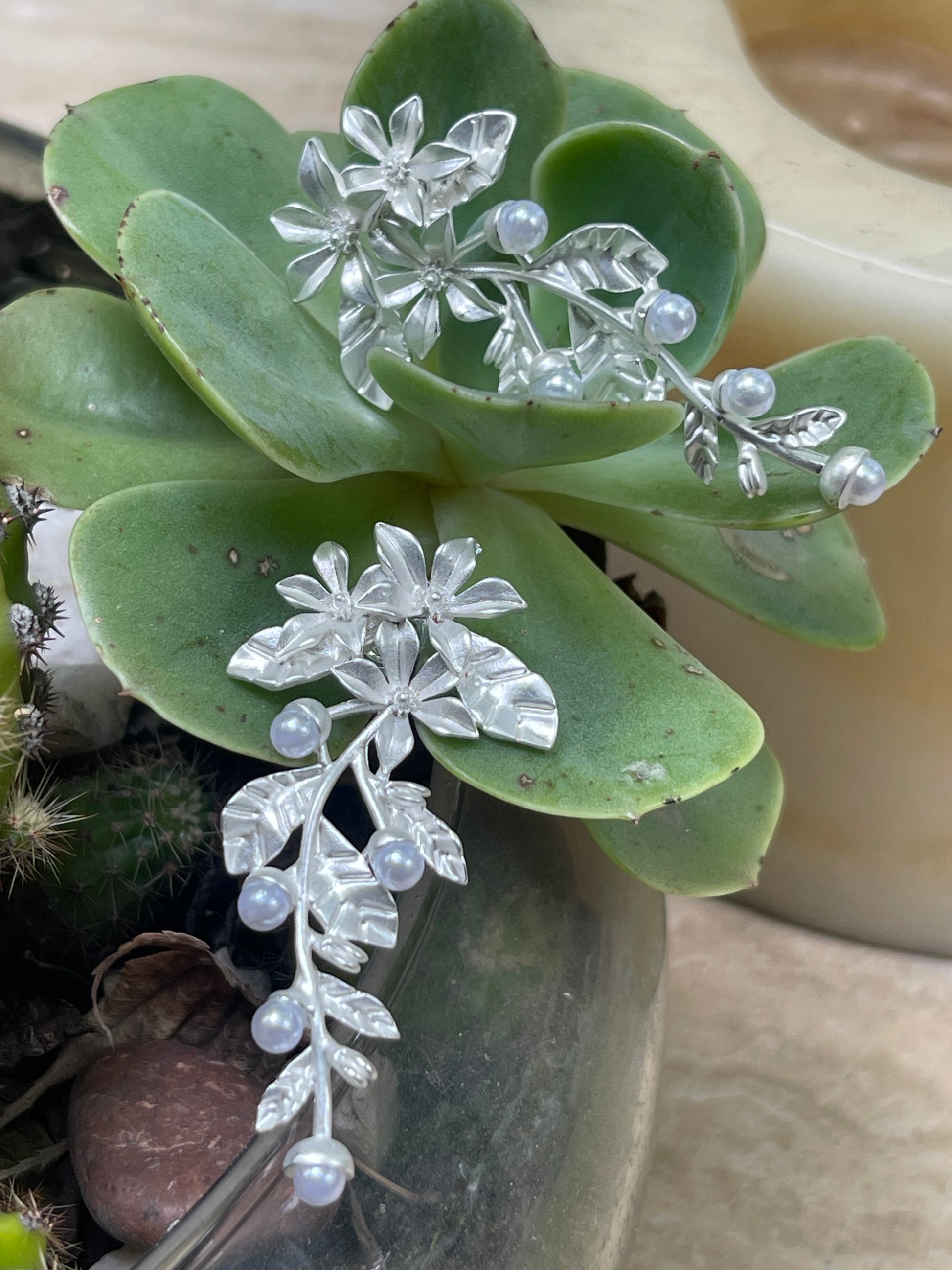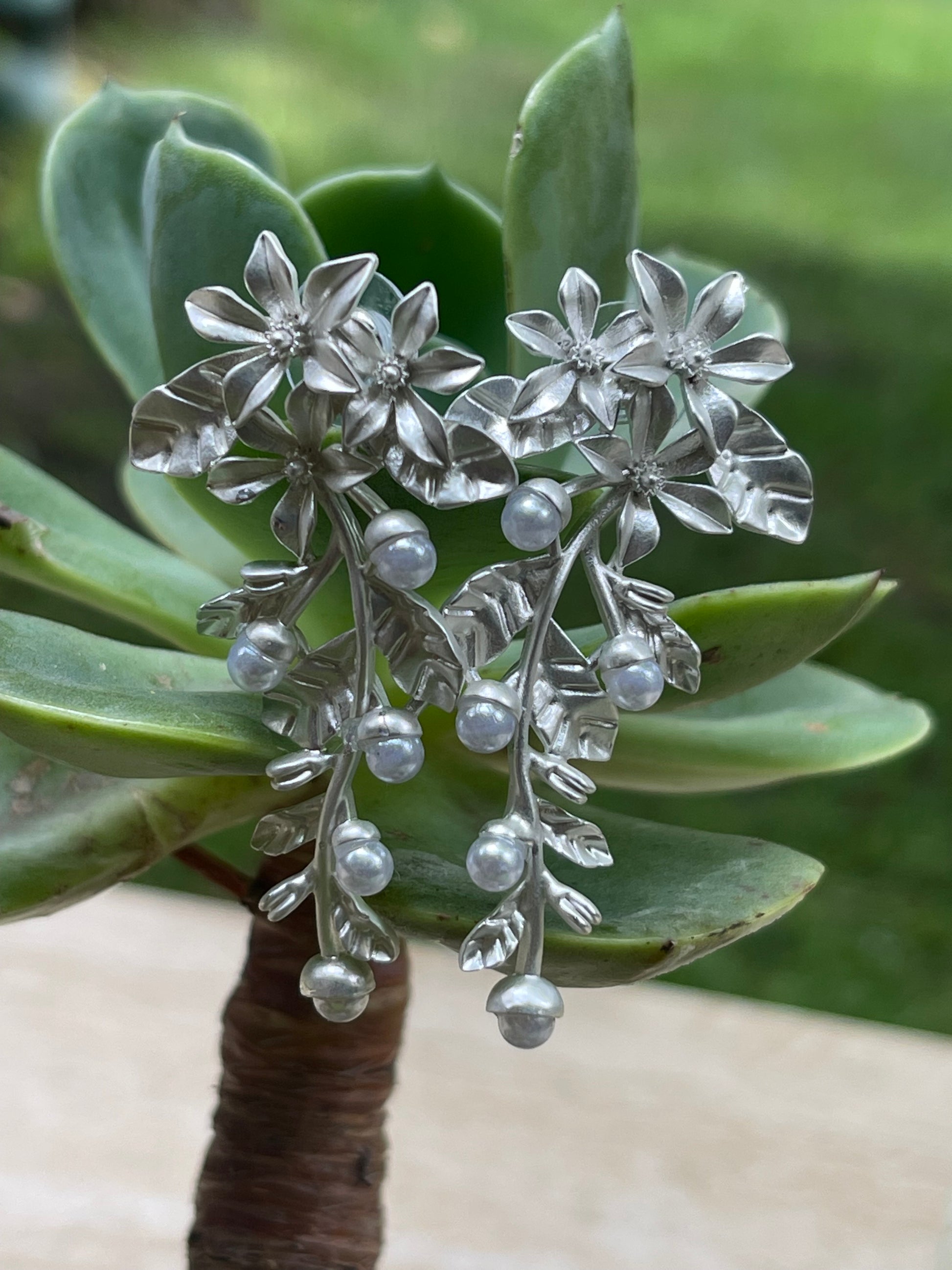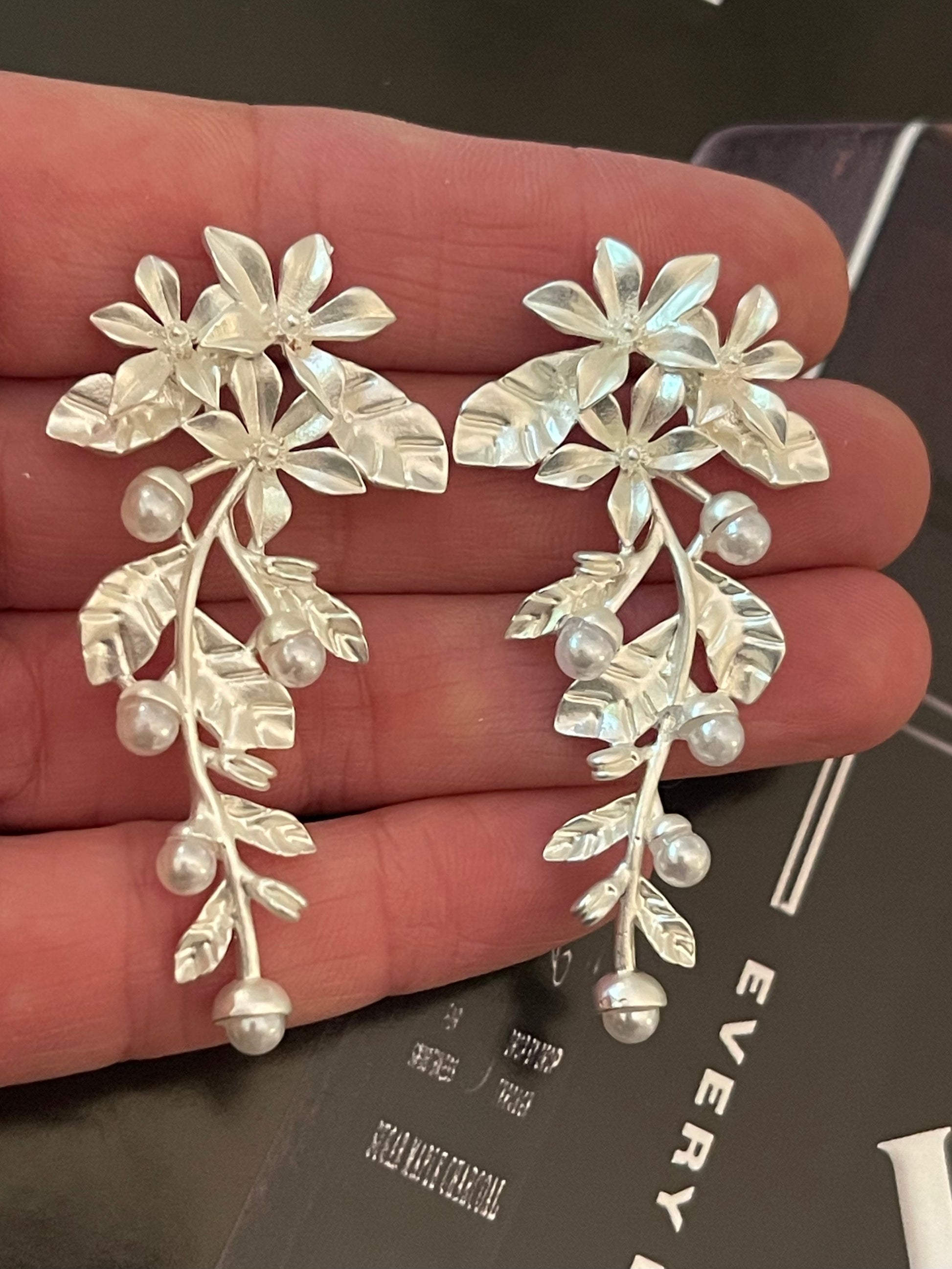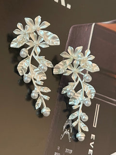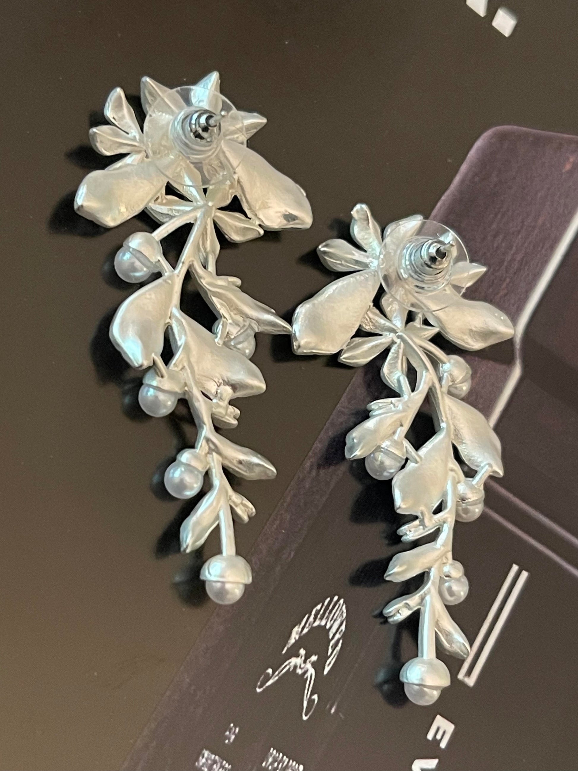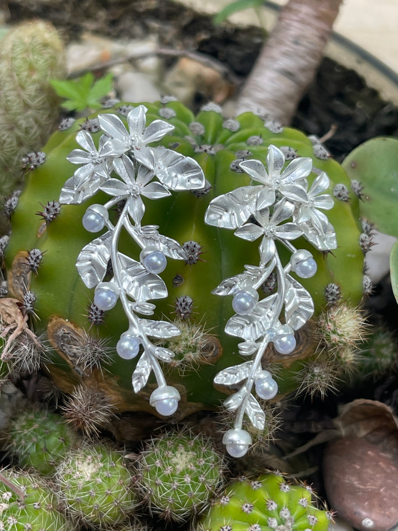 Aros Hippie Chic plateados de fantasia con preciosa forma botanica y perlitas en las puntas.