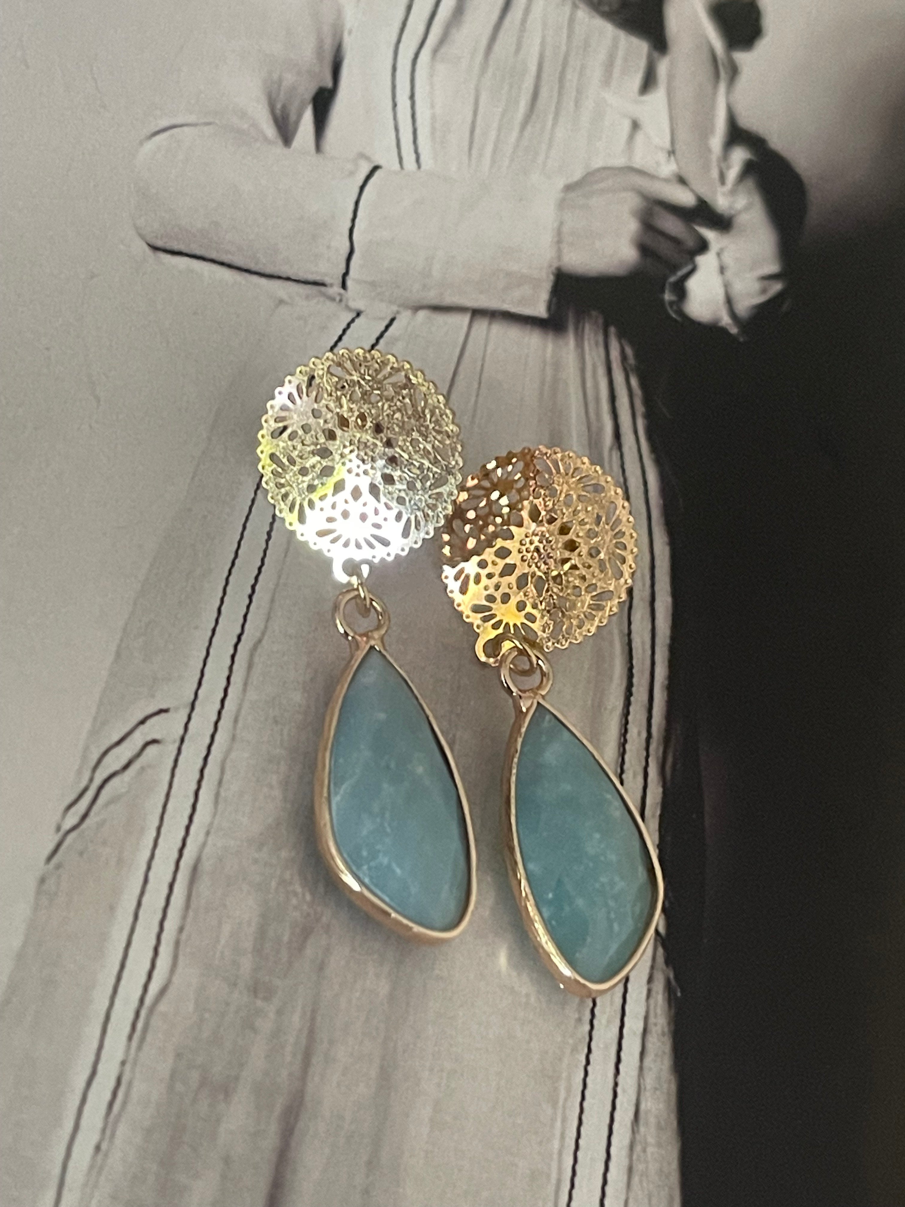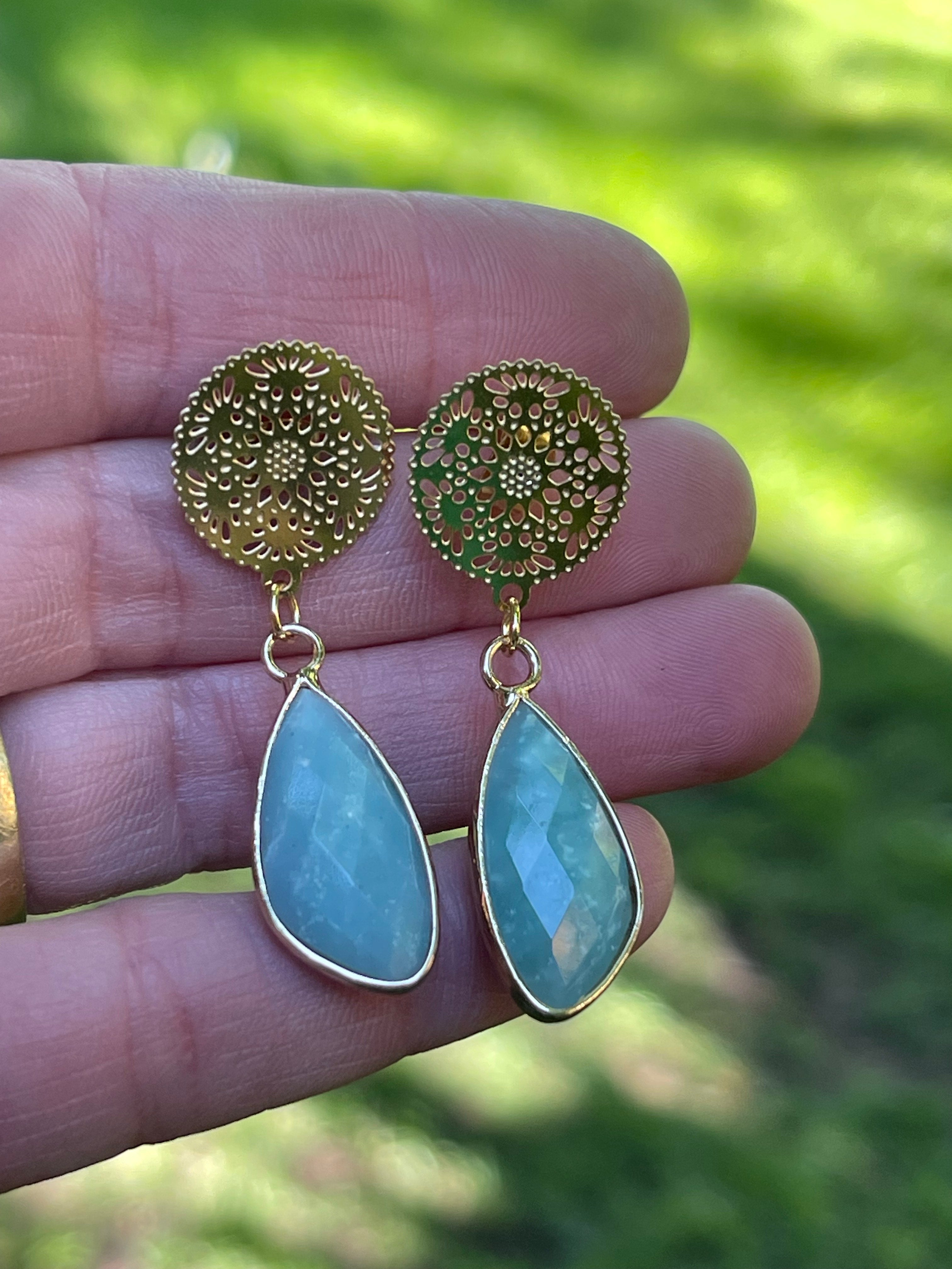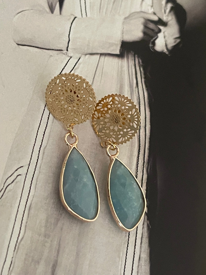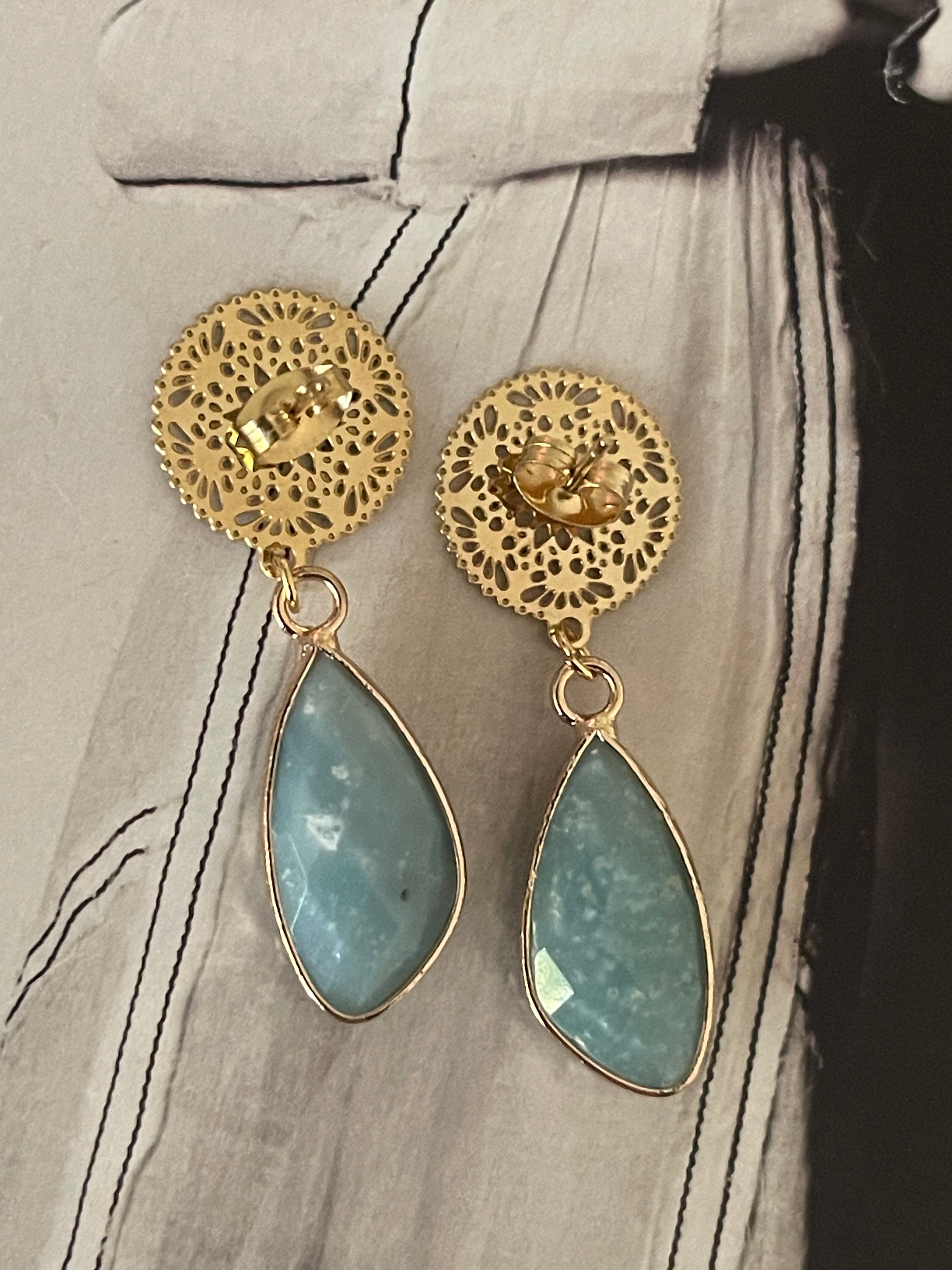 Aros Hippie Chic de acero inoxidable dorado y preciosa piedra natural color turquesa. Largo 4.2 cm.