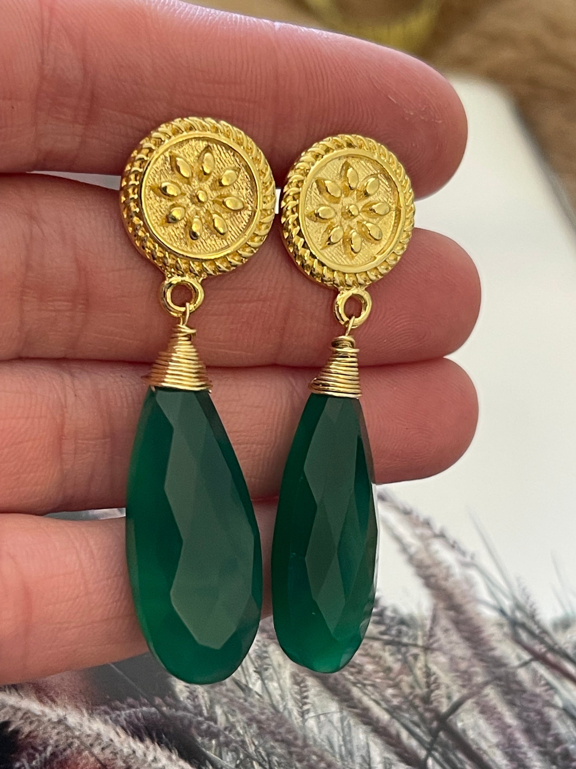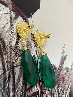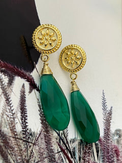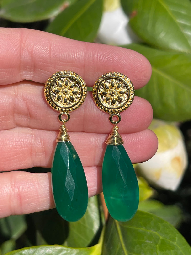 Aros Hippie Chic bañados en oro con espectacular piedra Onix verde facetada embarrilada con hilo de oro. Largo 5 cm.