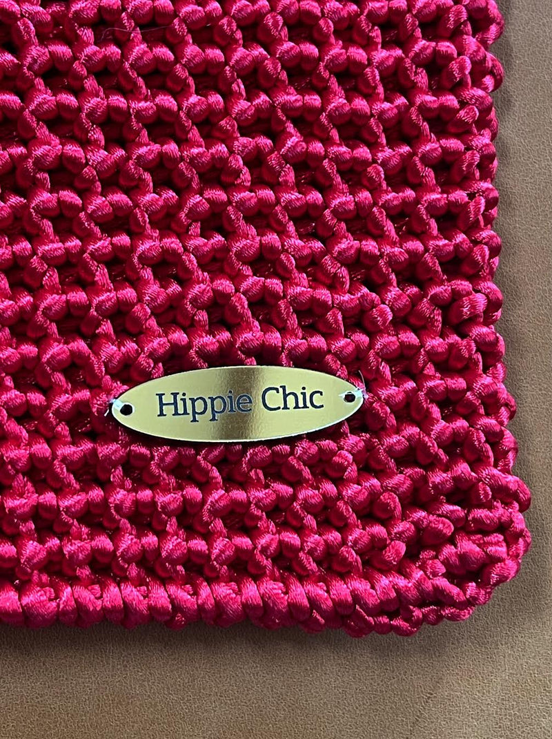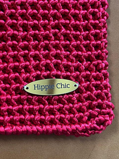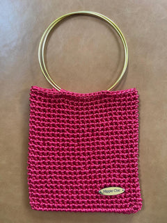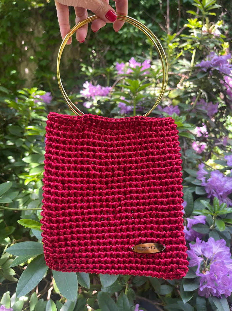 Cartera Hippie Chic en alegre color rojo tejida a crochet con mango dorado.