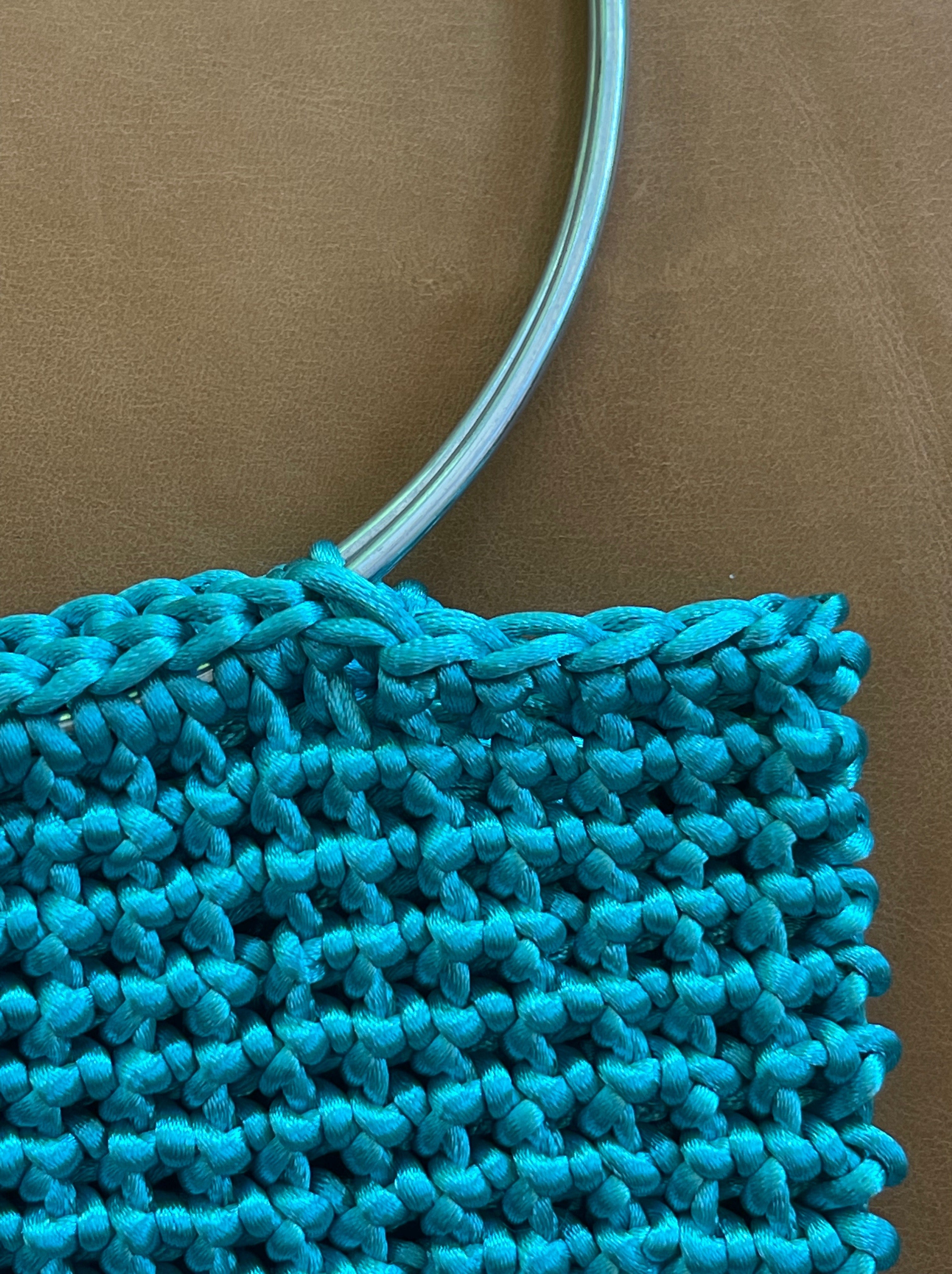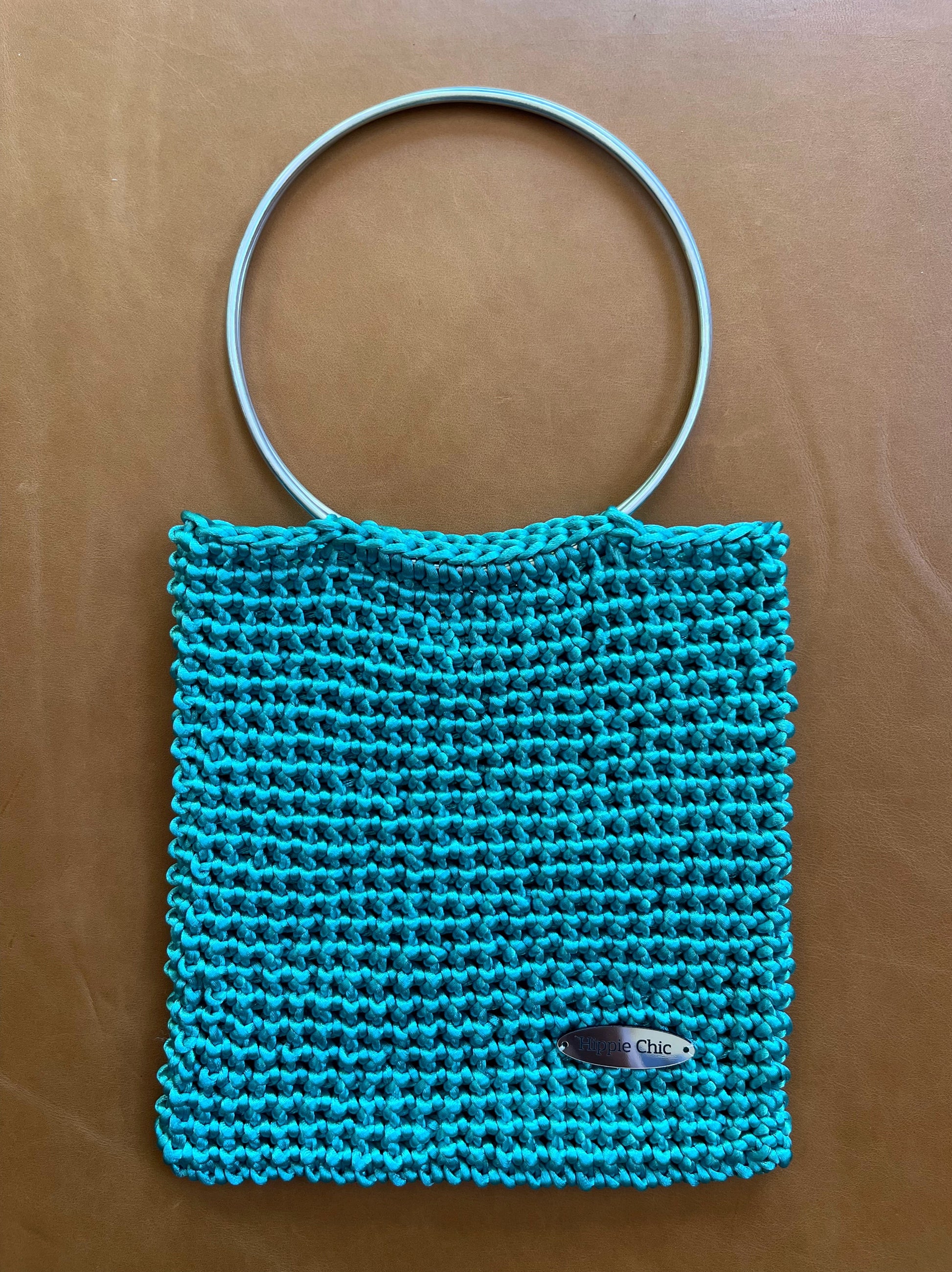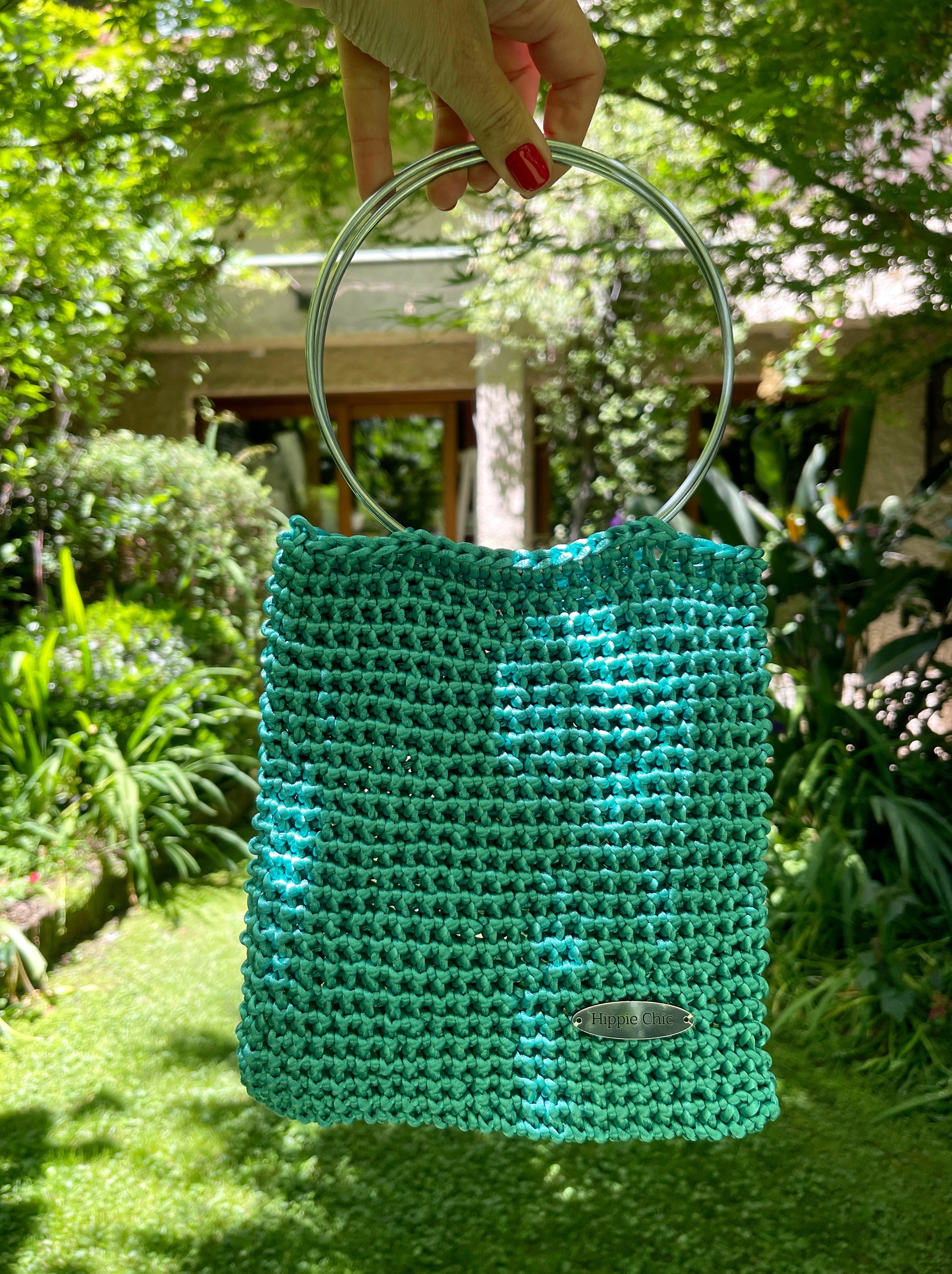 Cartera Hippie Chic tejida a crochet de precioso color turquesa con mango plateado.