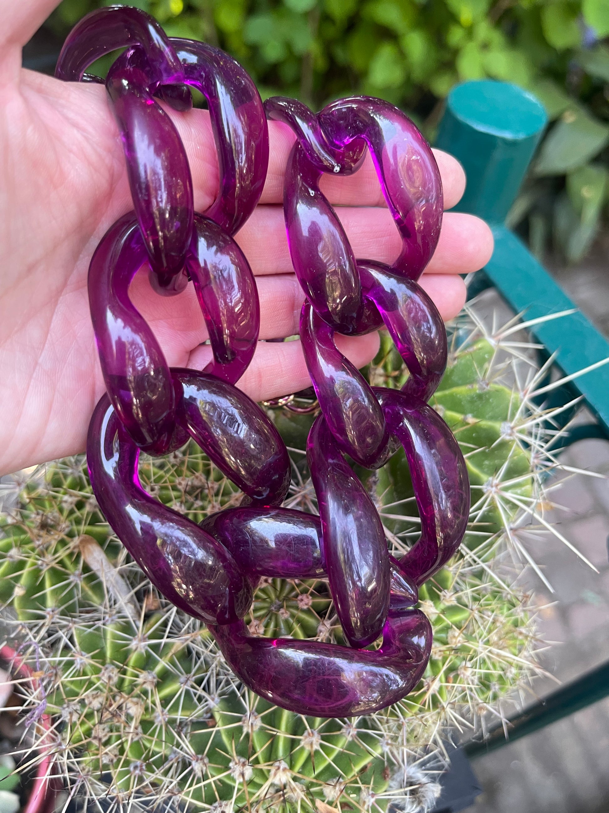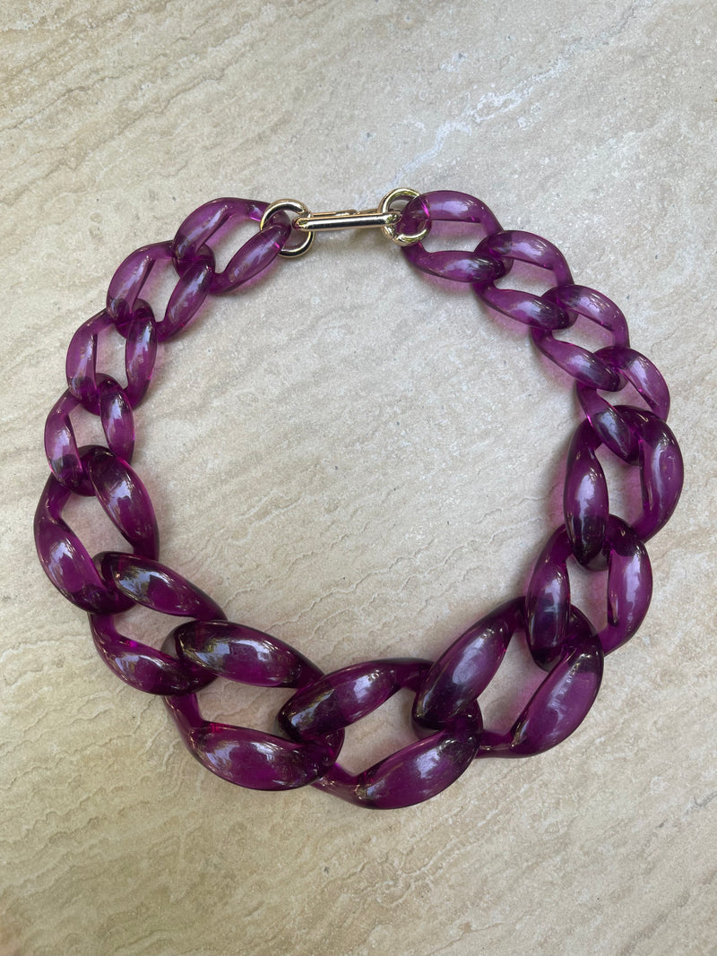 Collar Hippie Chic coro de acrilico en alegres tonos lilas y broche dorado.