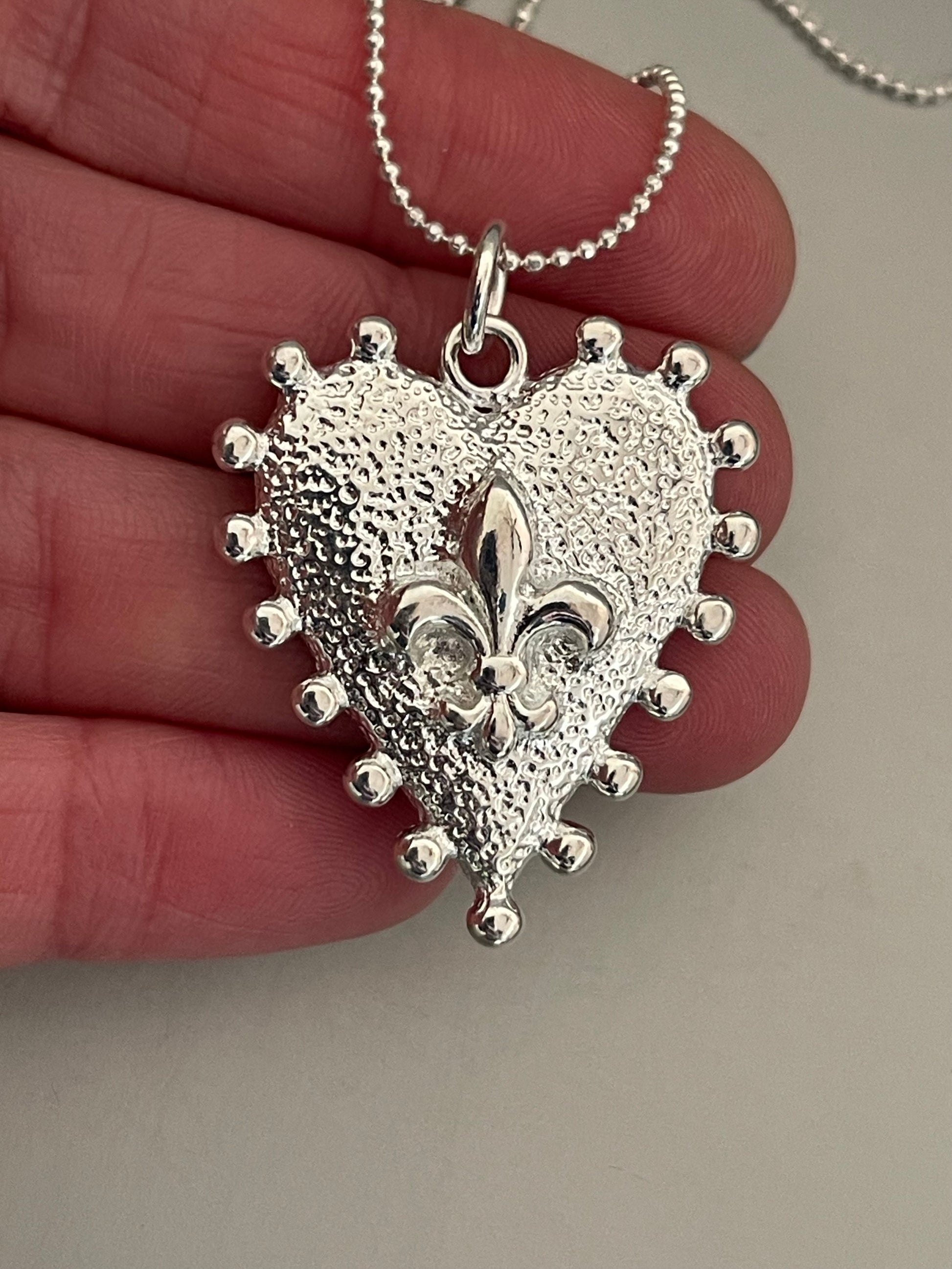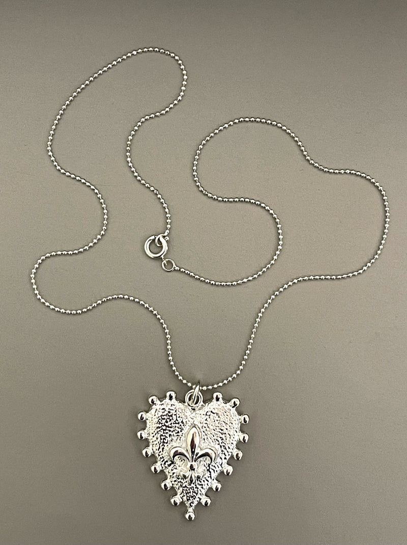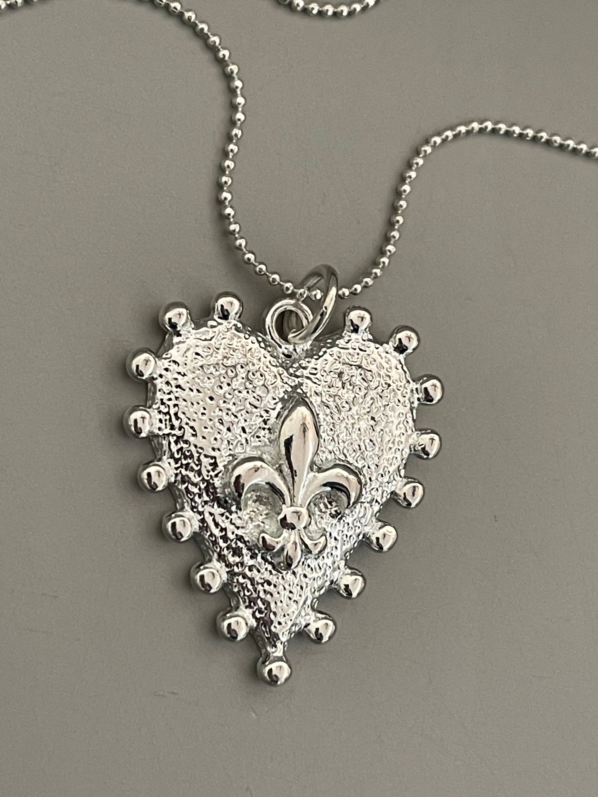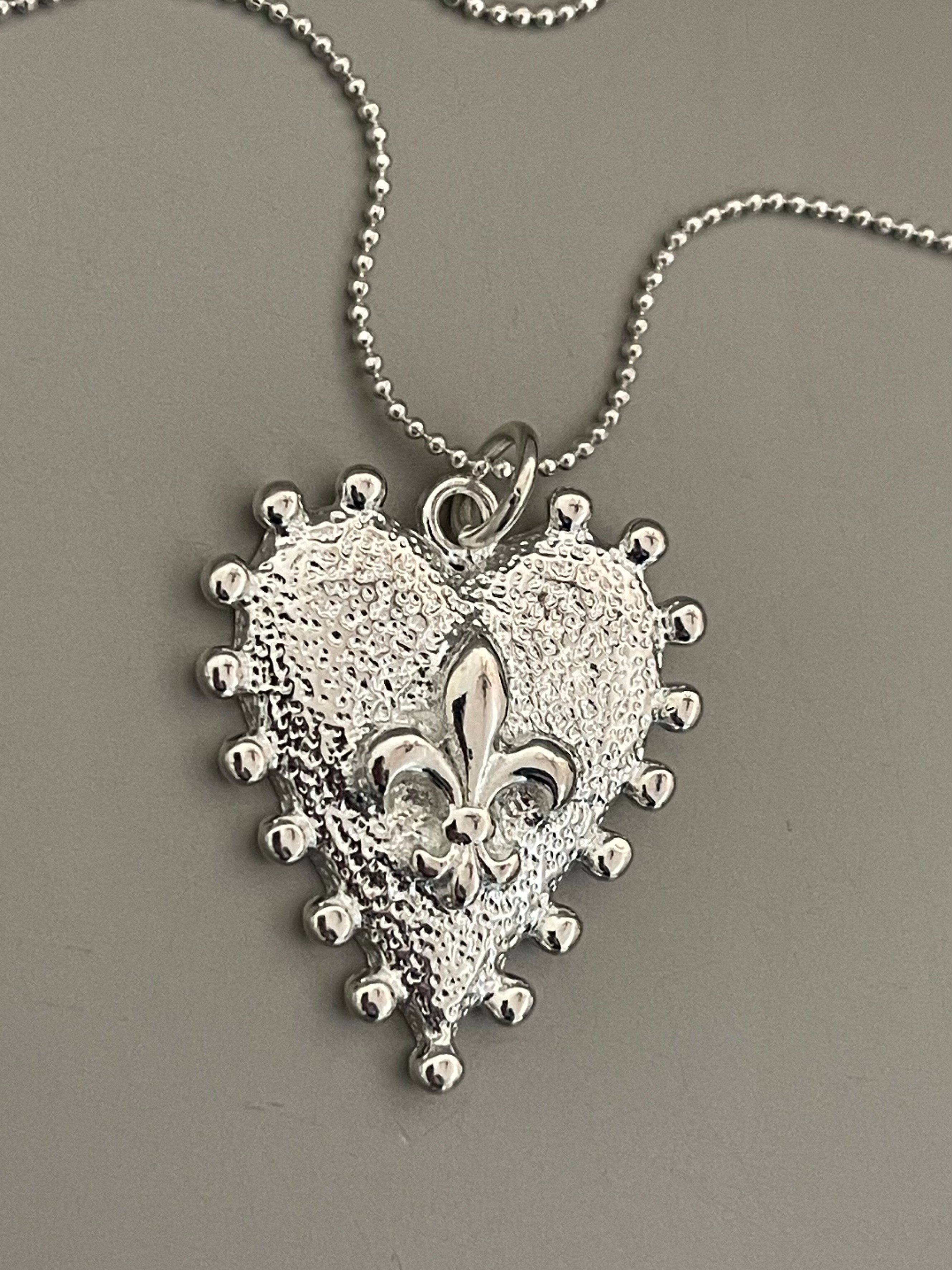 Collar Hippie Chic corto bañado en plata con espectacular corazon con flor de lis.