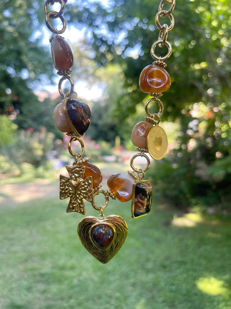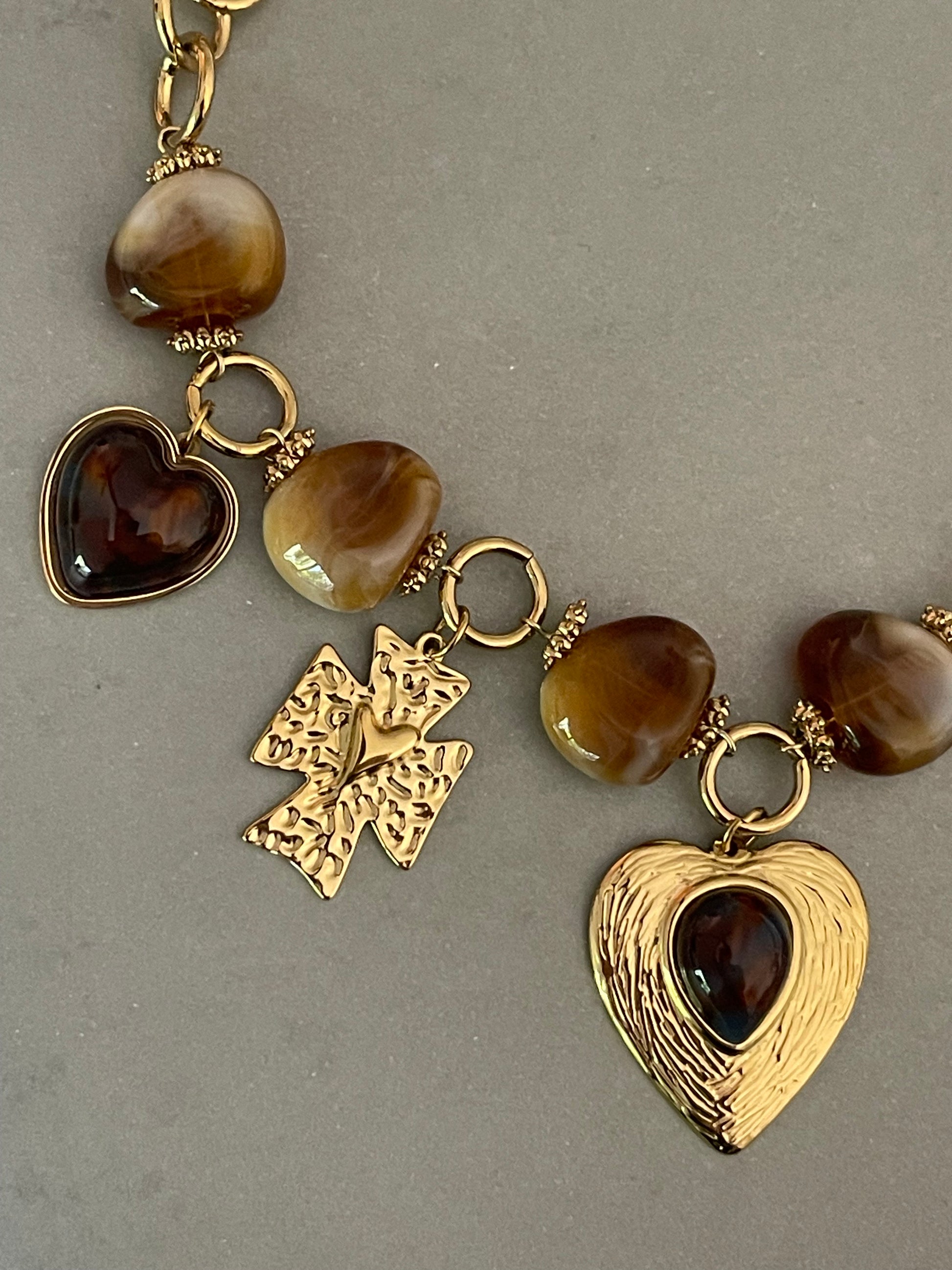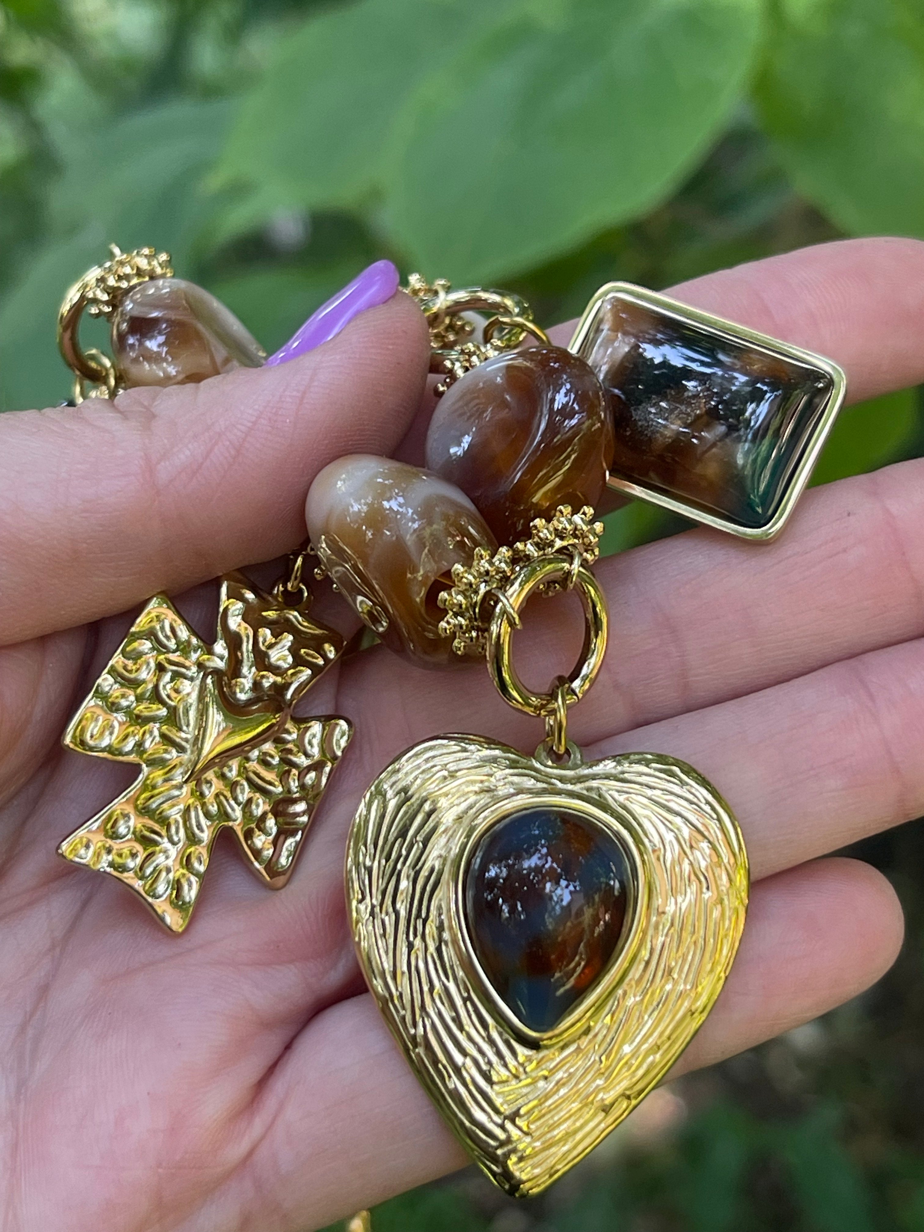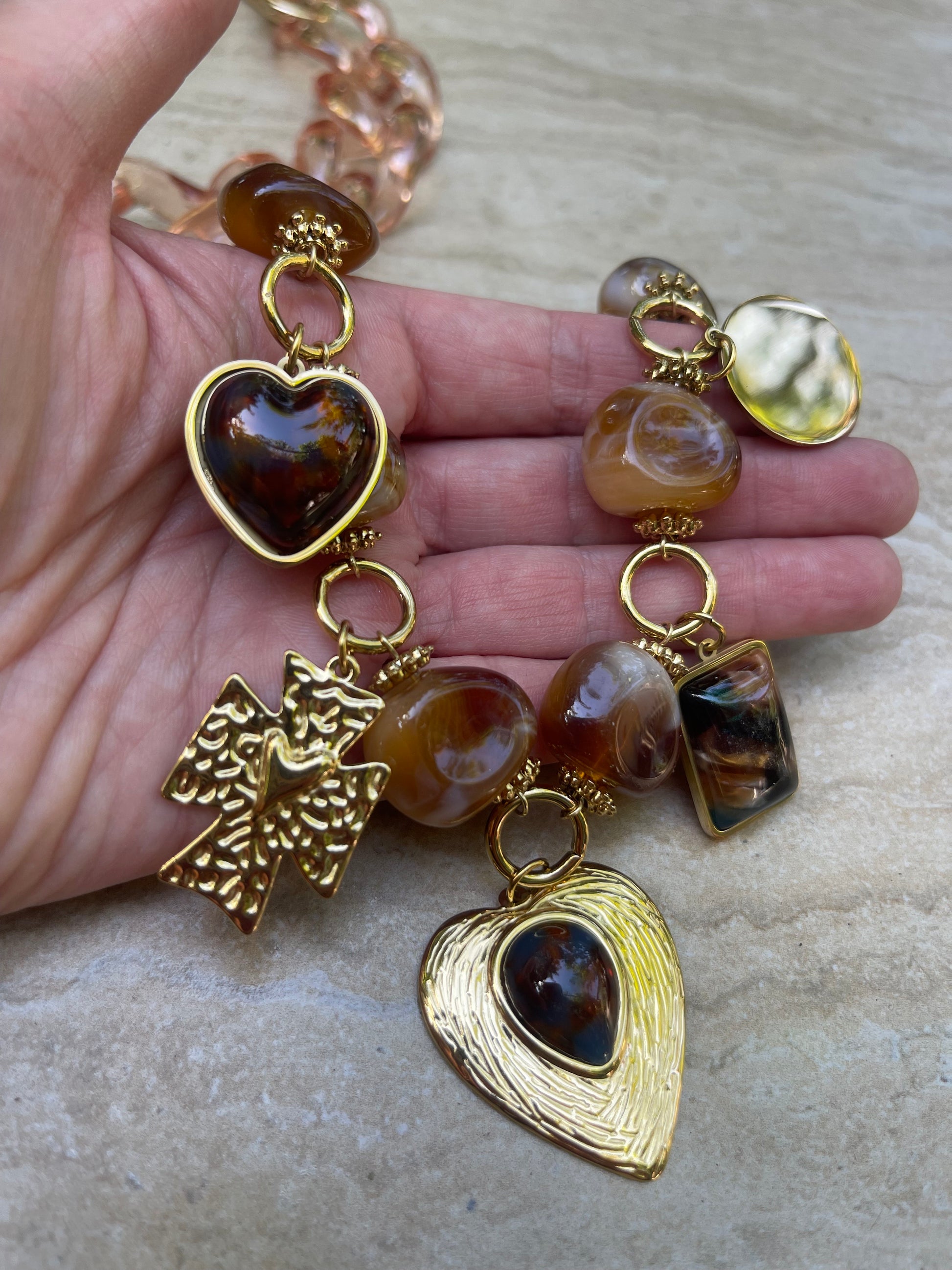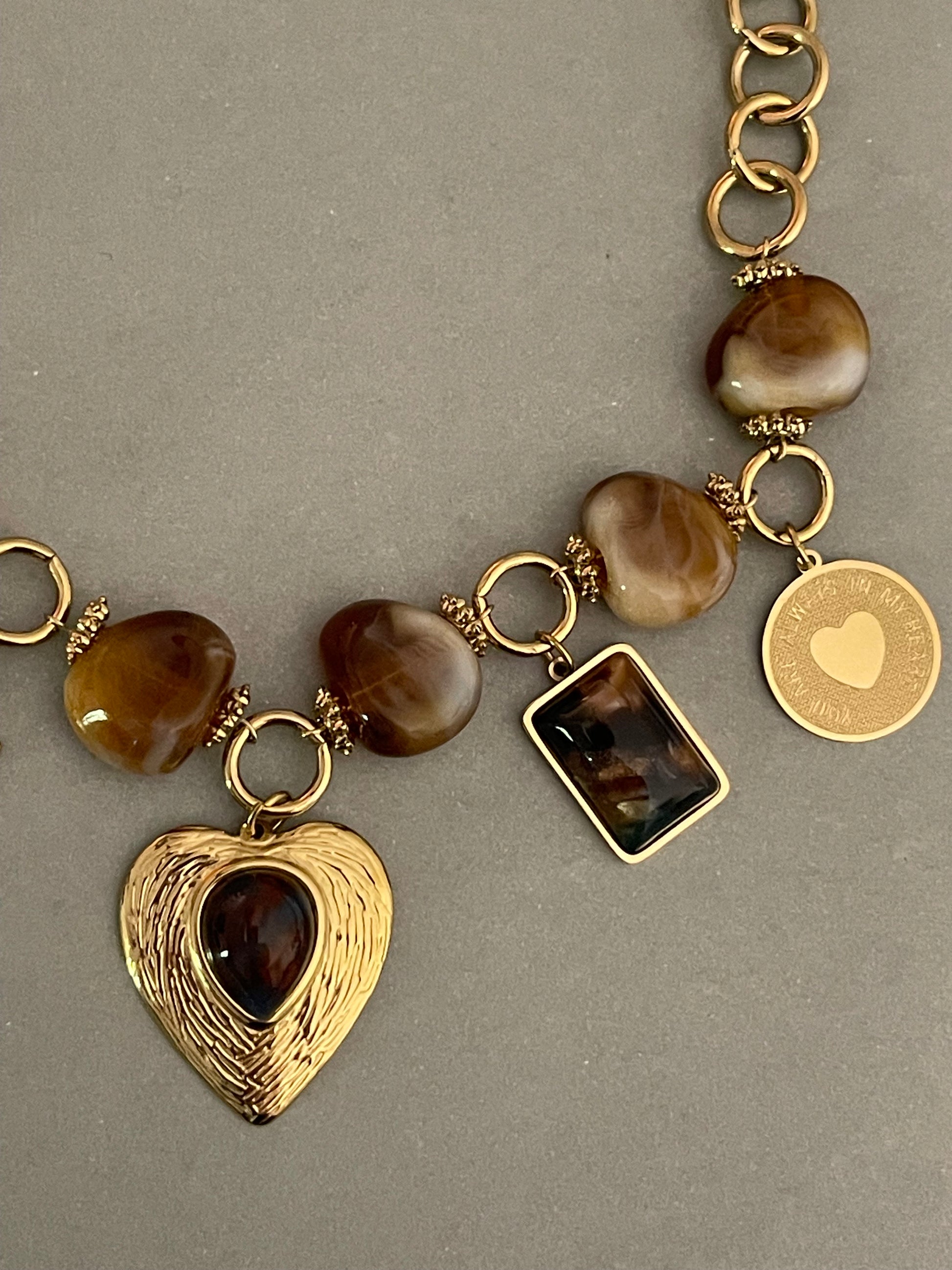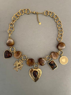 Collar Hippie Chic corto con preciosa cadena de acero inoxidable dorada y colgantes en aclico en tonos marron y acero dorado.