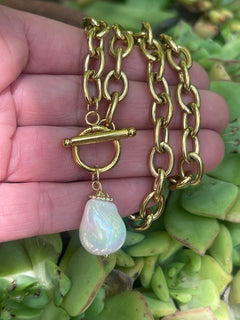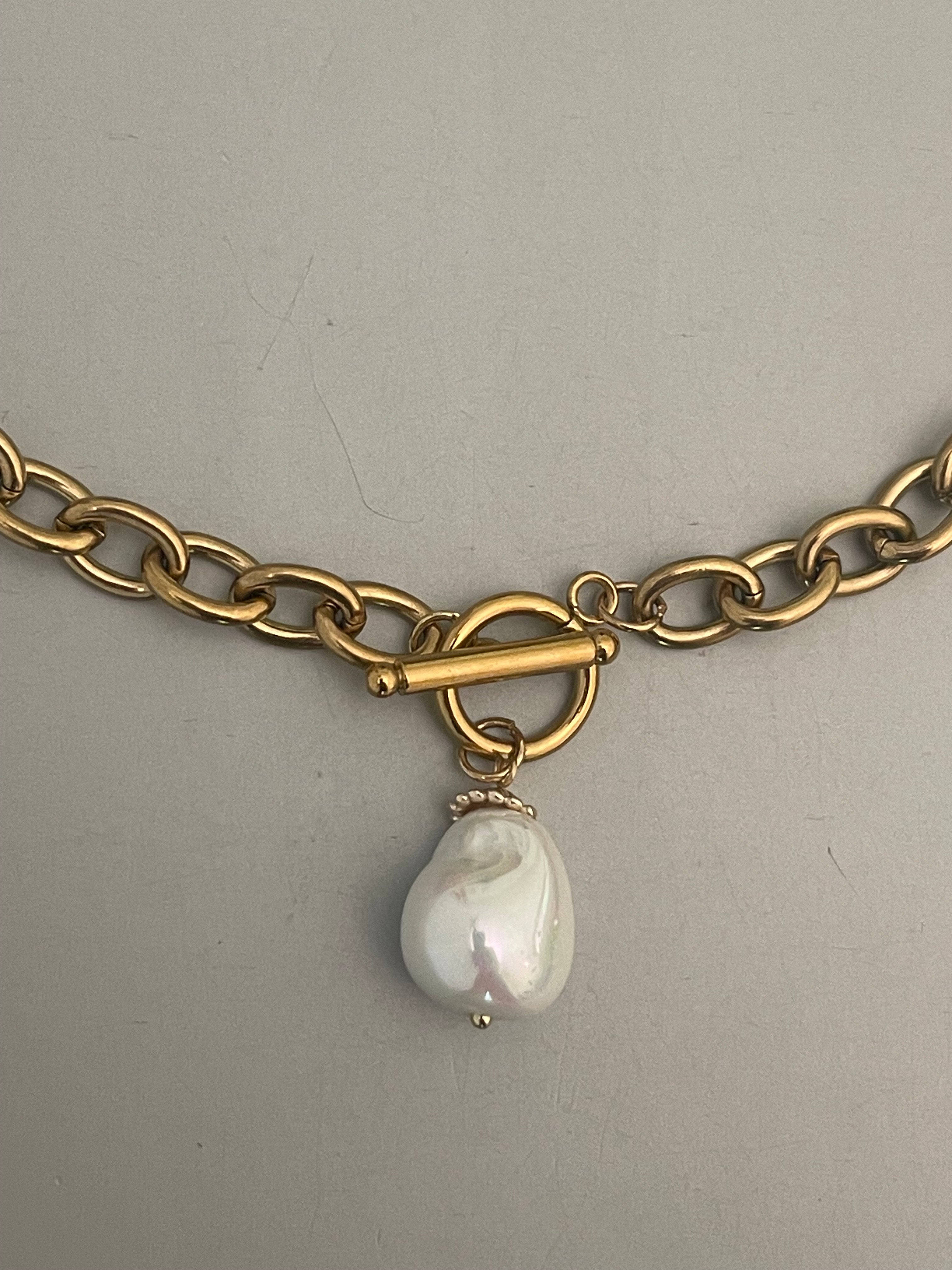 Collar Hippie Chic corto de acero inoxidable dorado con cierre OT y elegante perla barroca blanca de fantasia fina con un precioso esmaltado.