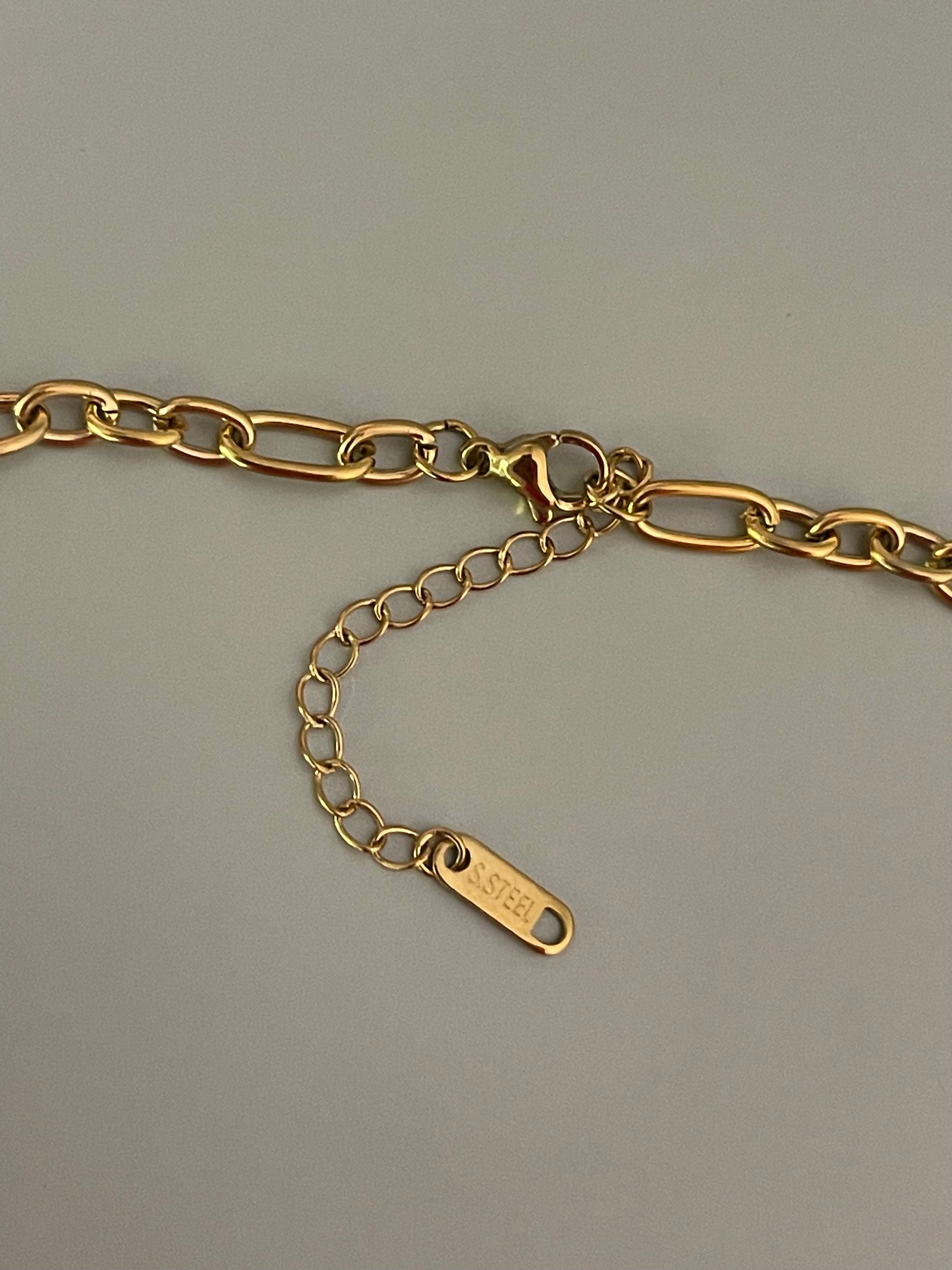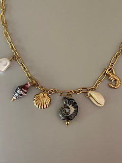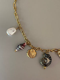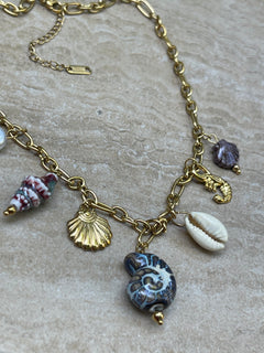 Collar Hippie Chic corto de cadena de acero inoxidable dorado y preciosos colgantes en tonos azules con motivos de mar de ceramica, acero, concha natural y perla de fantasia.