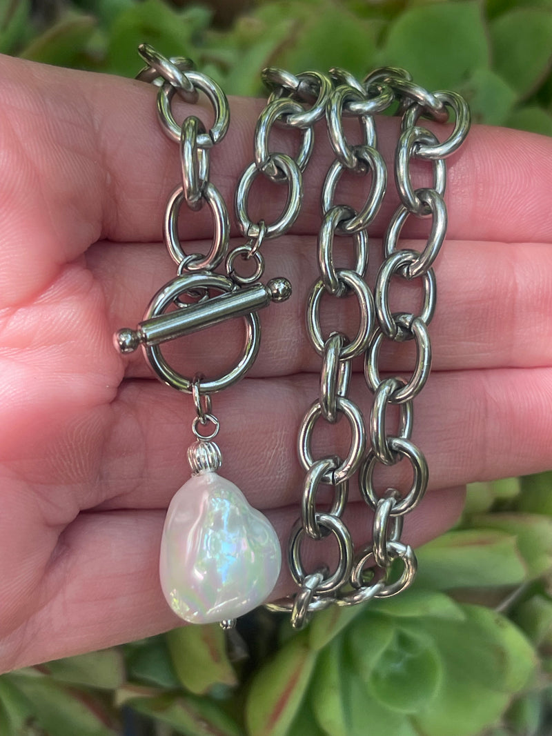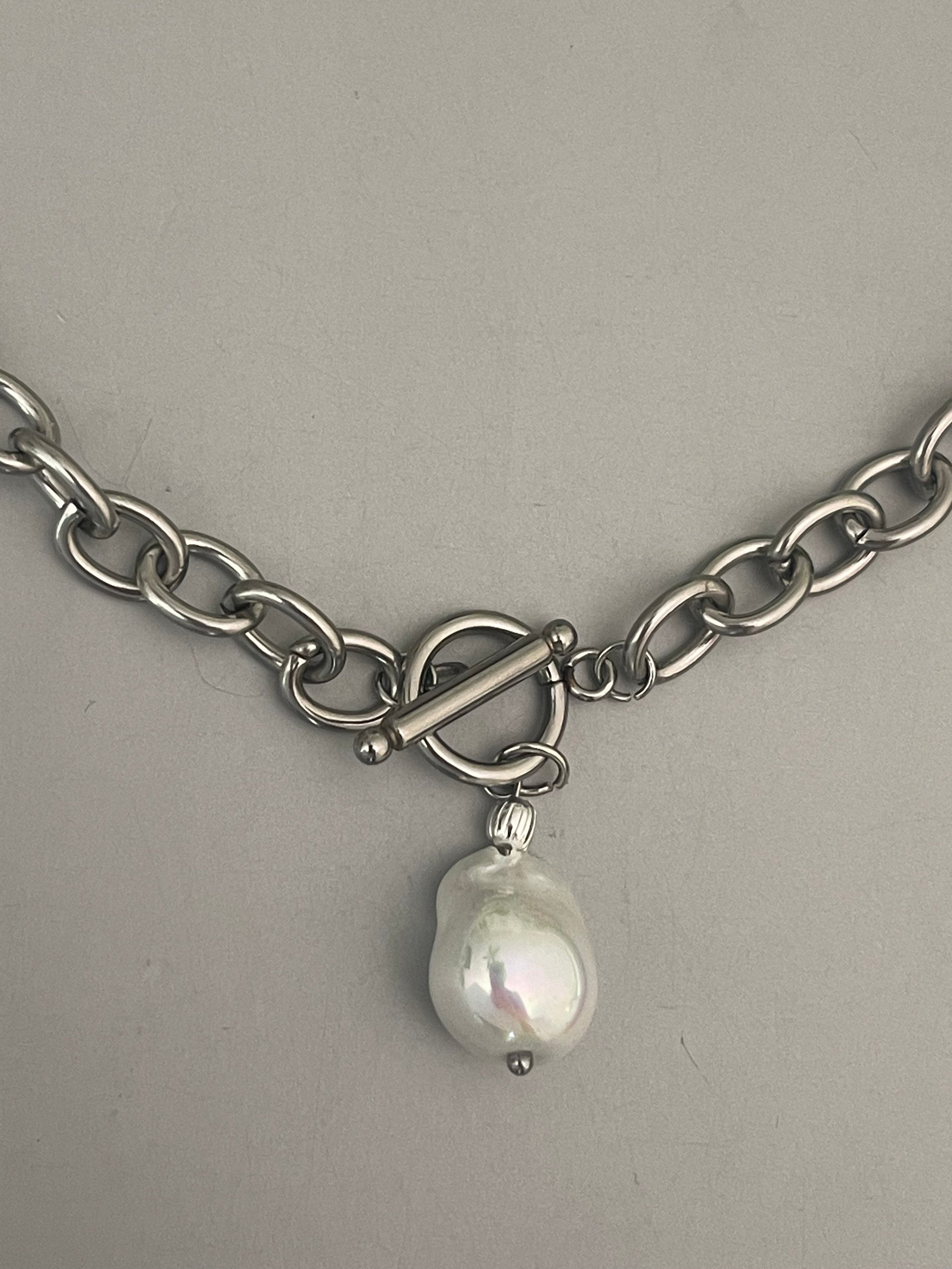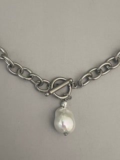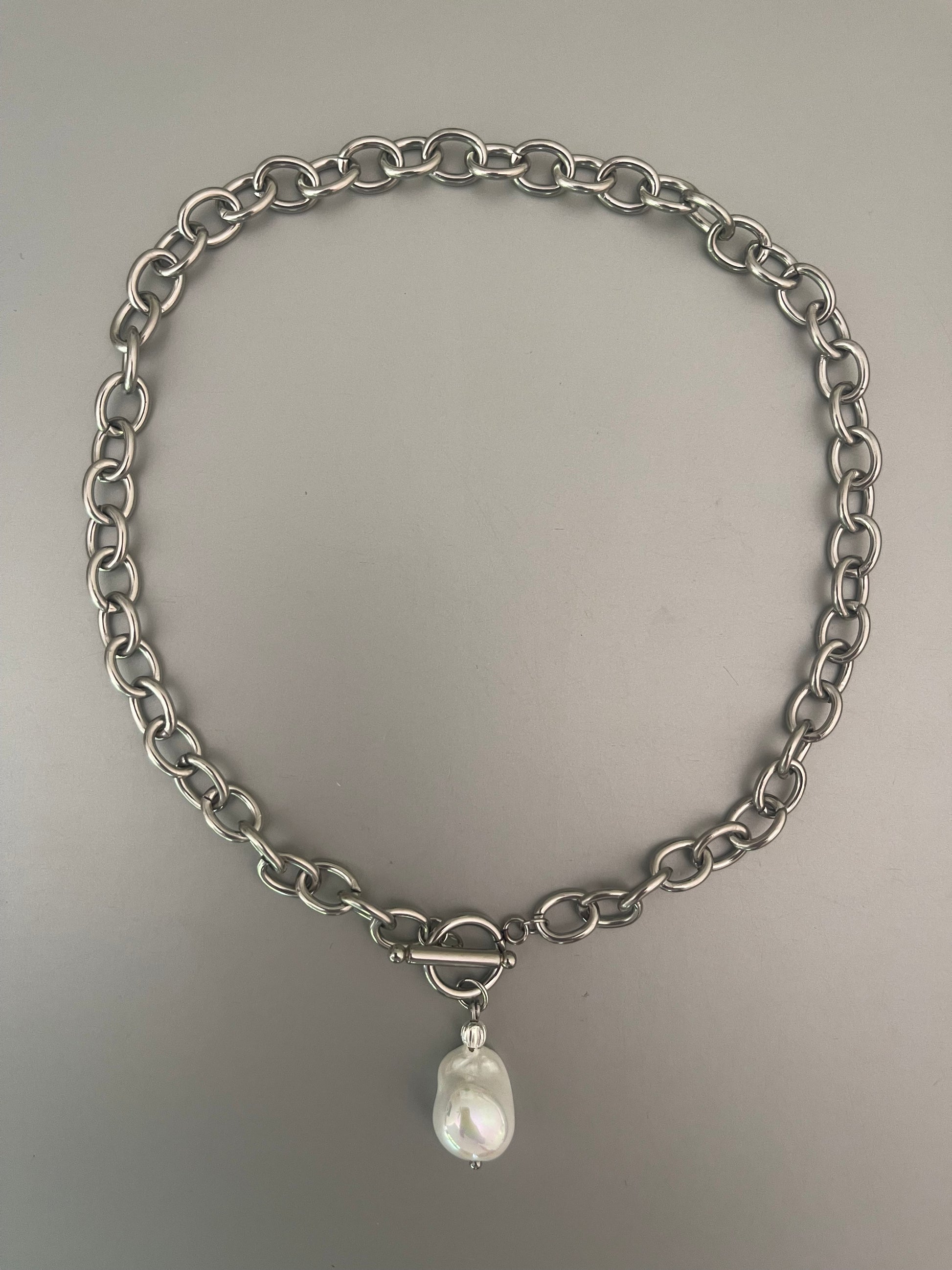 Collar Hippie Chic corto de cadena de acero inoxidable plateado con cierre OT y preciosa perla barroca blanca de fantasia con un elegante esmaltado.