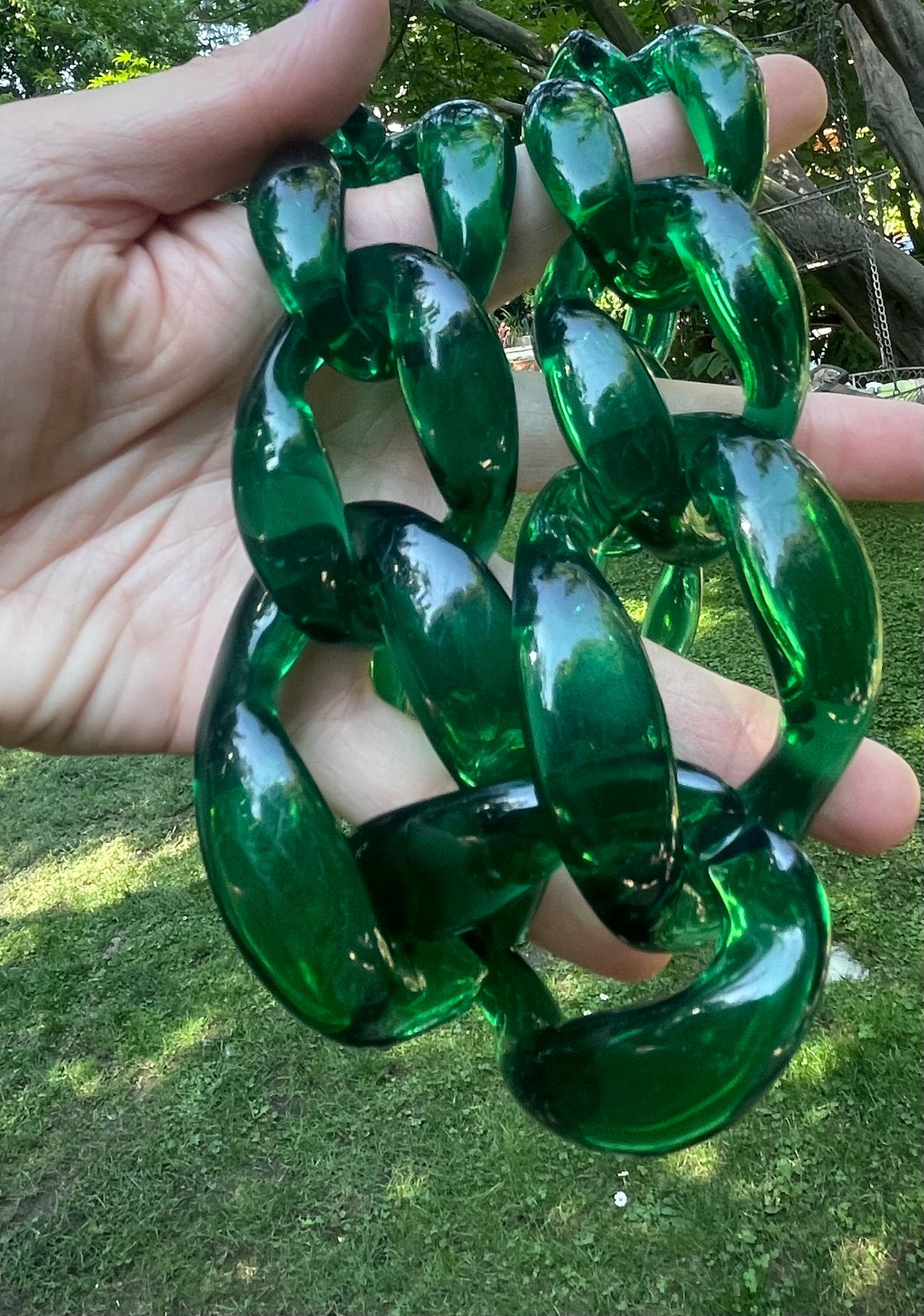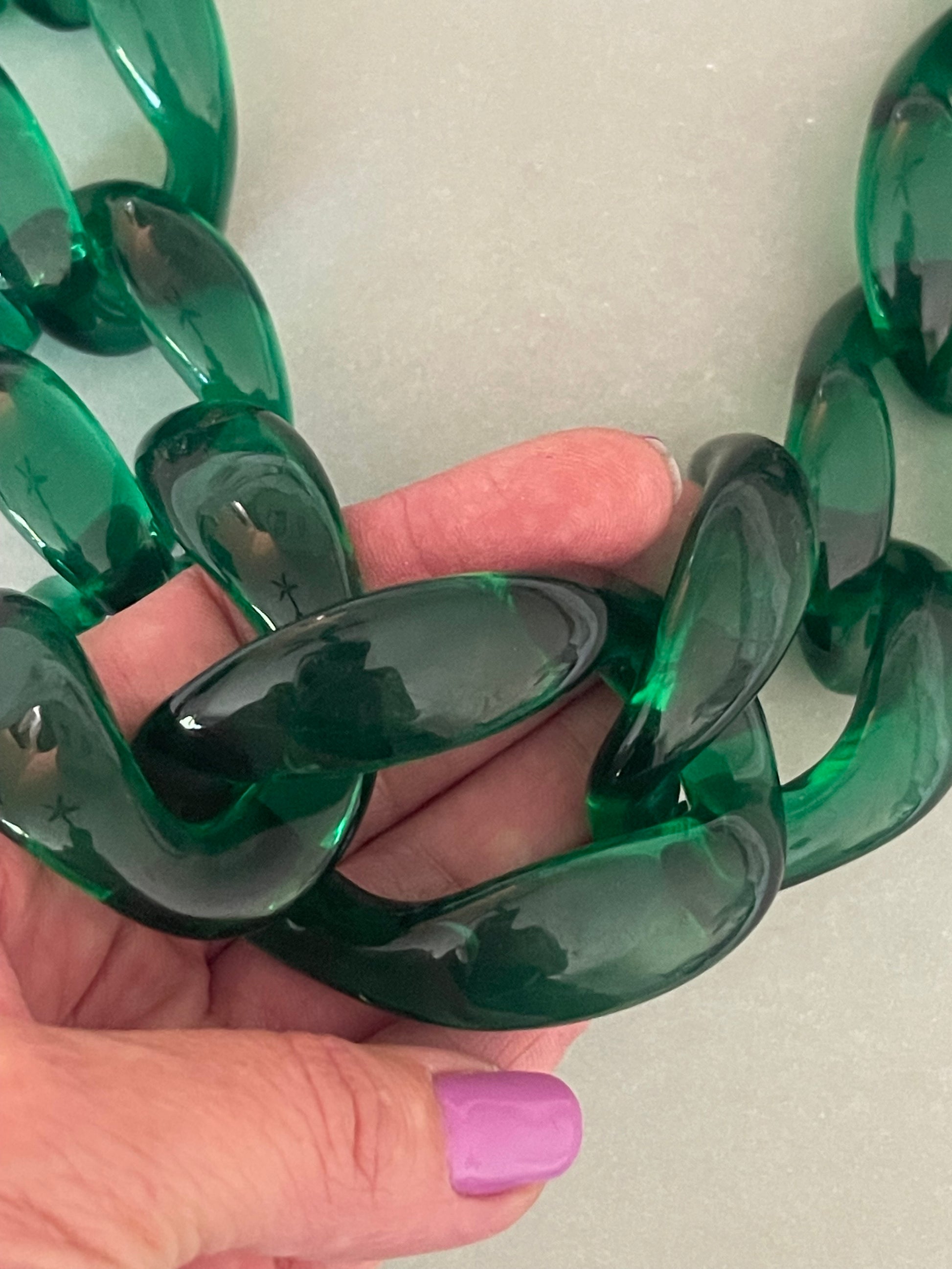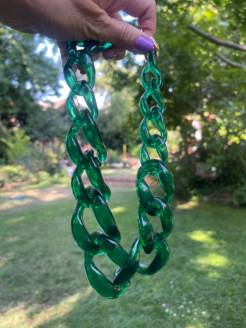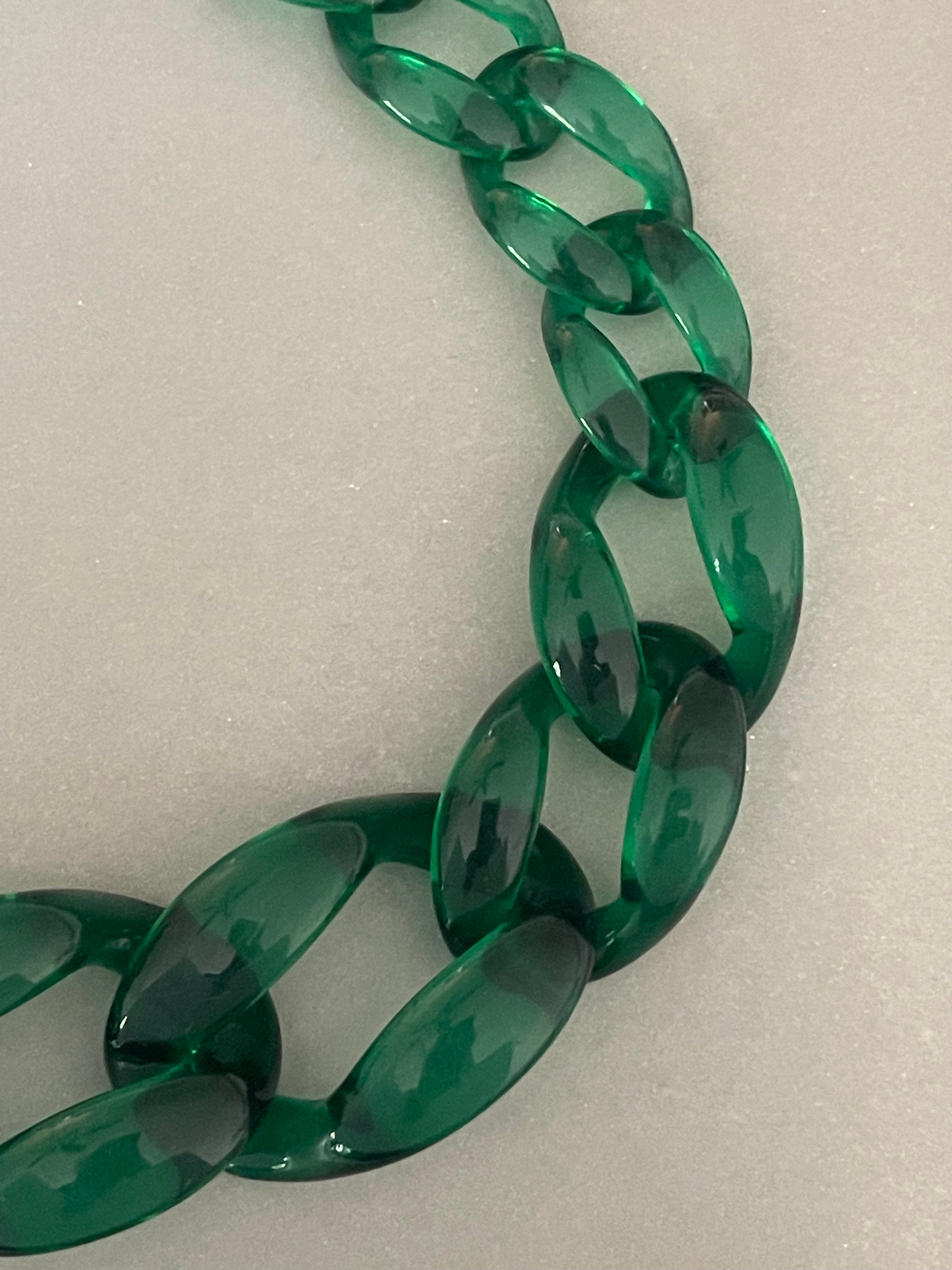 Collar Hippie Chic de acrilico en espectacular color verde ingles translusido y broche dorado.