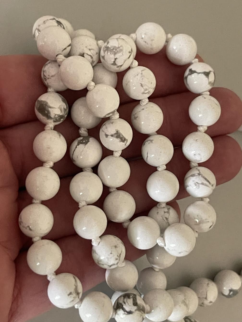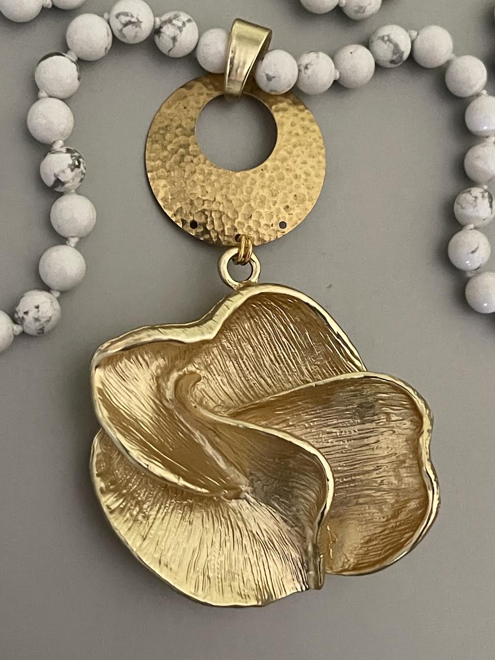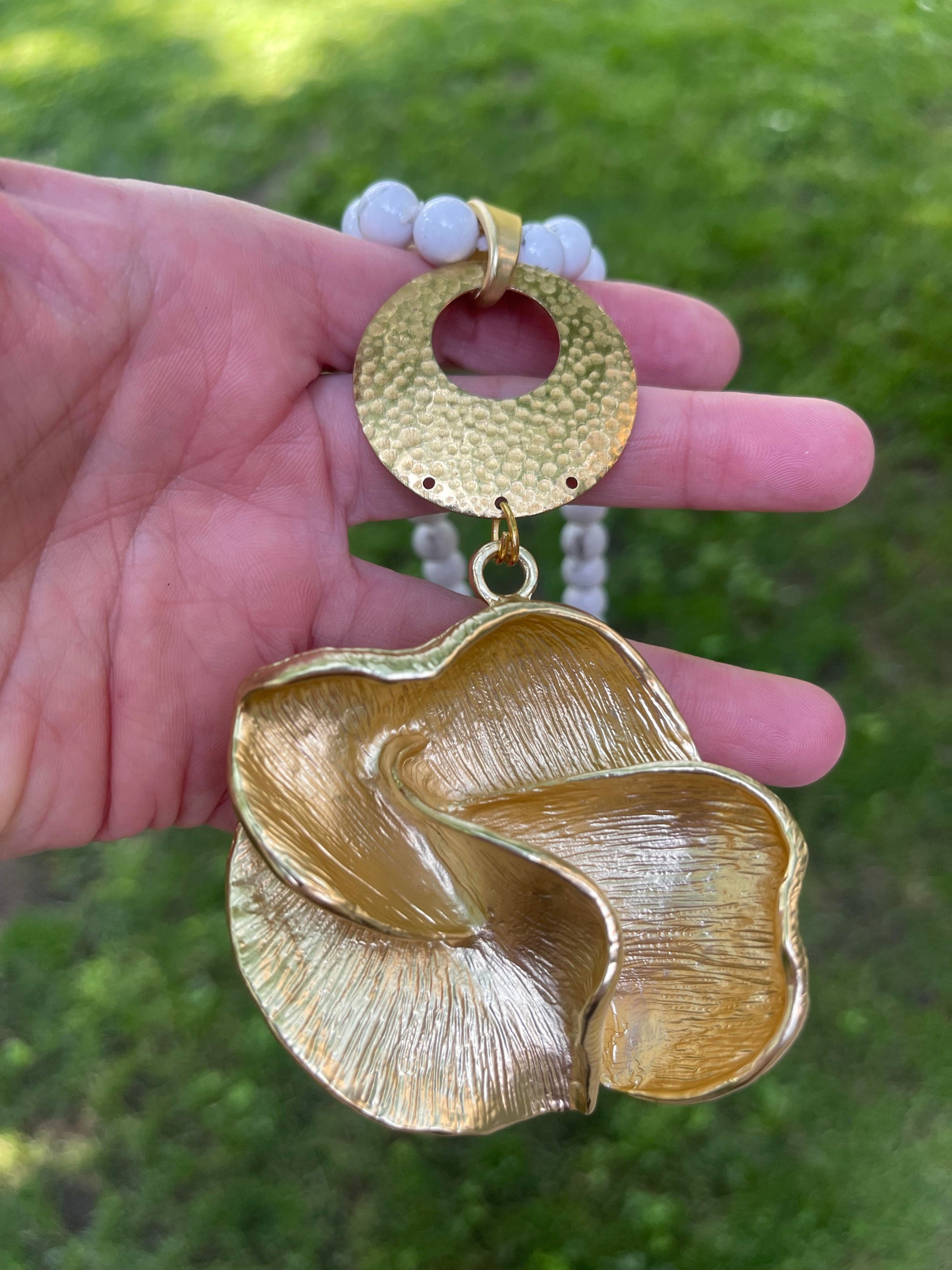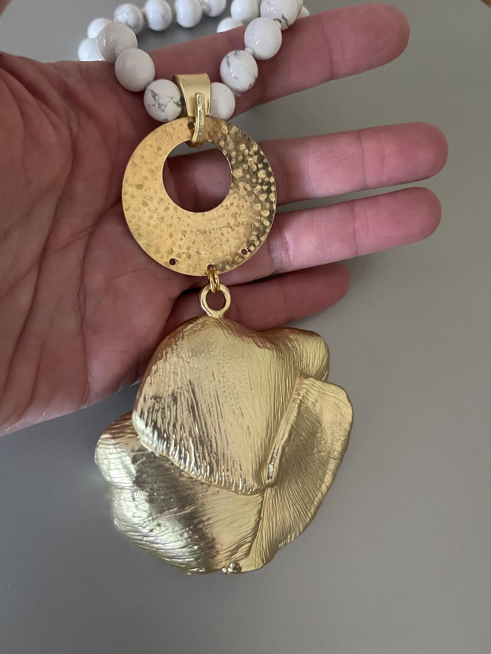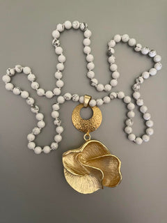 Collar Hippie Chic largo con preciosa flor dorado opaco y piedras naturales blancas anudadas con leves vetas grises.