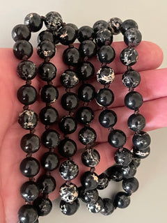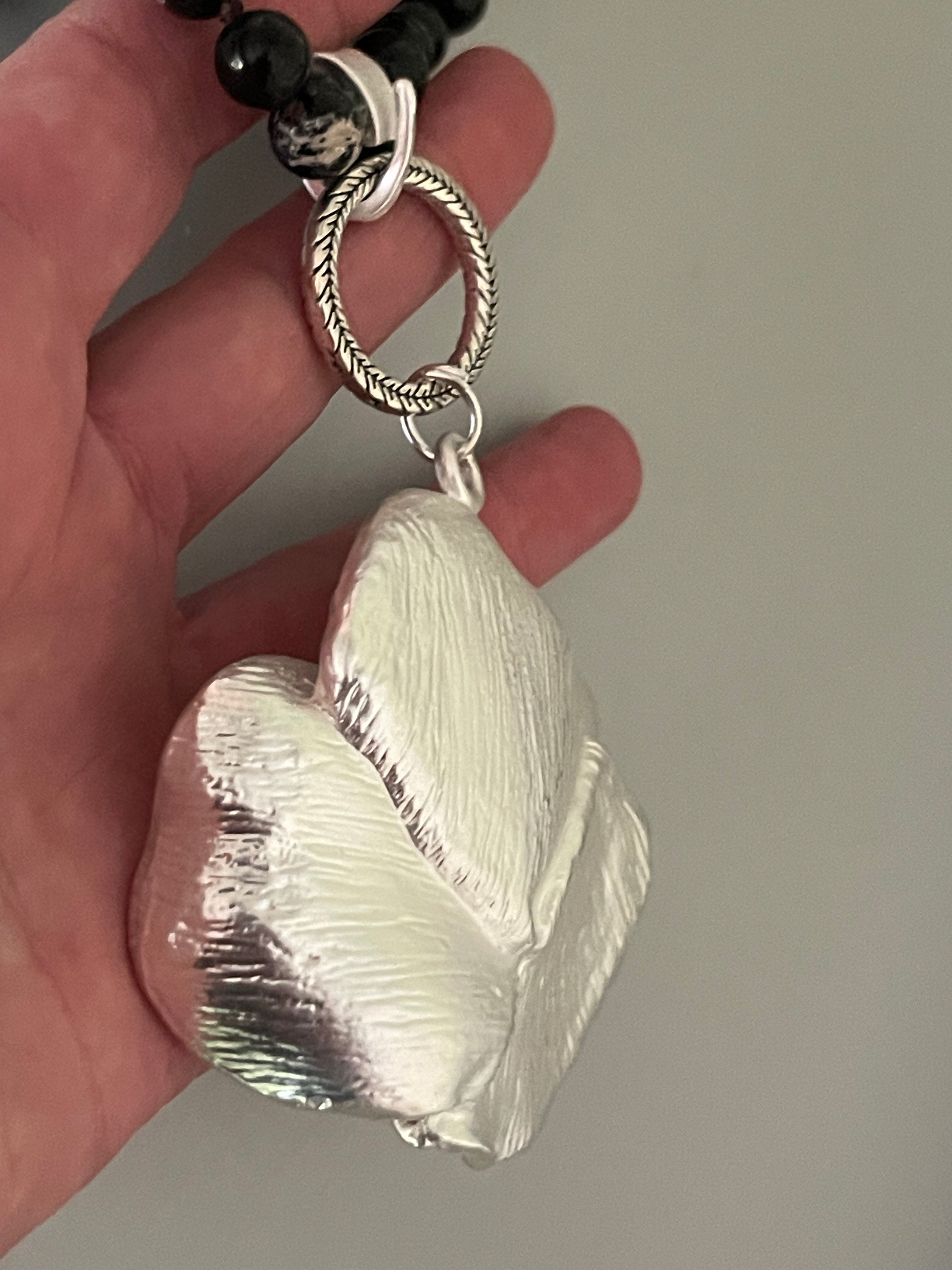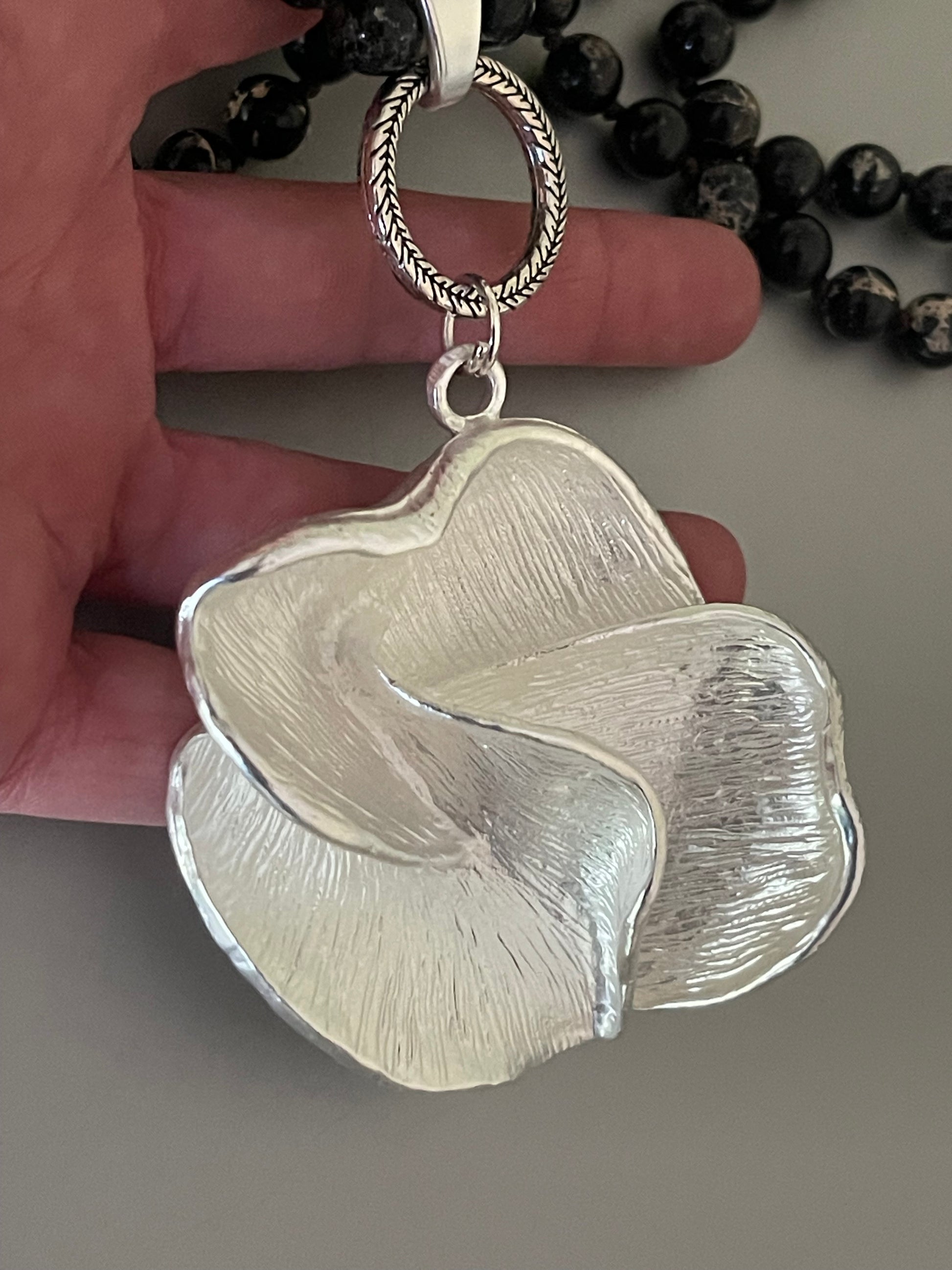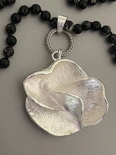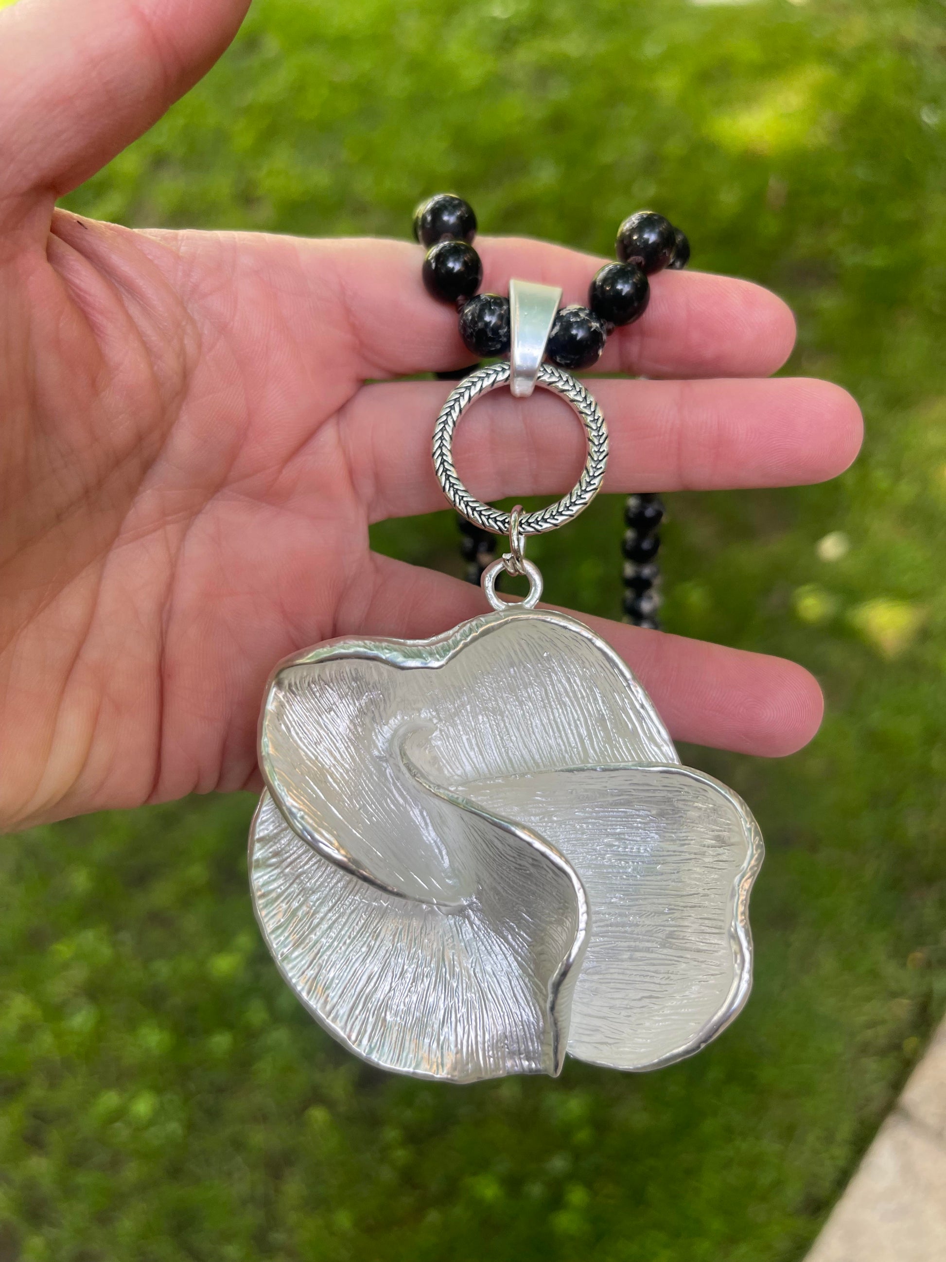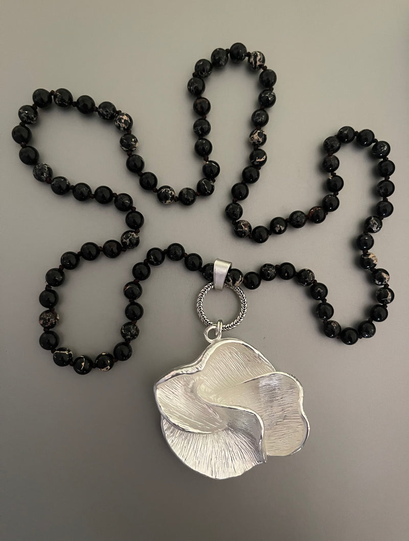 Collar Hippie Chic largo con precioso colgante de flor plateado opaco y piedras naturales anudadas negras con leves vetas blancas.