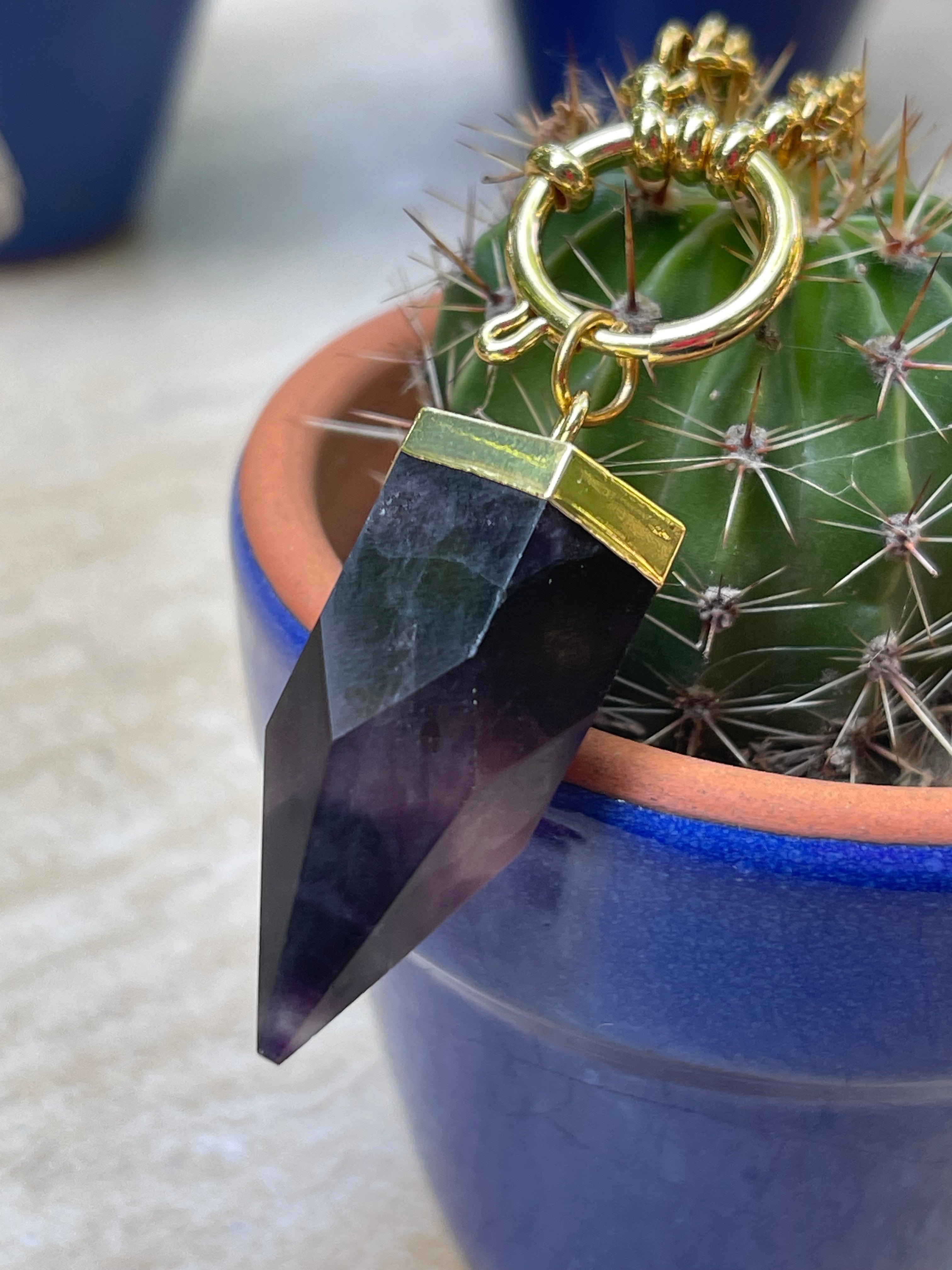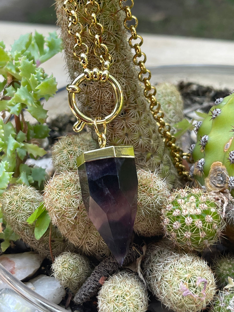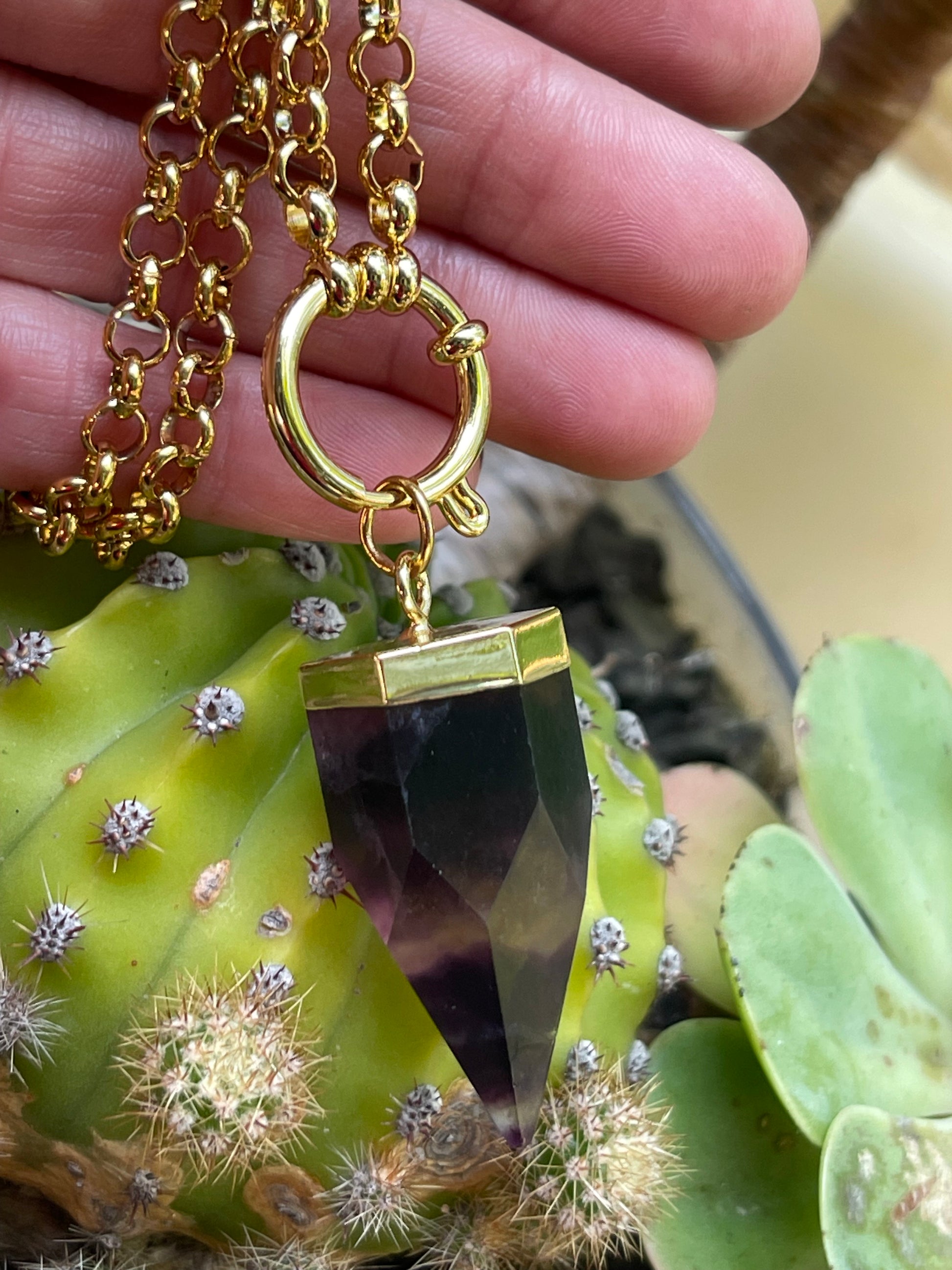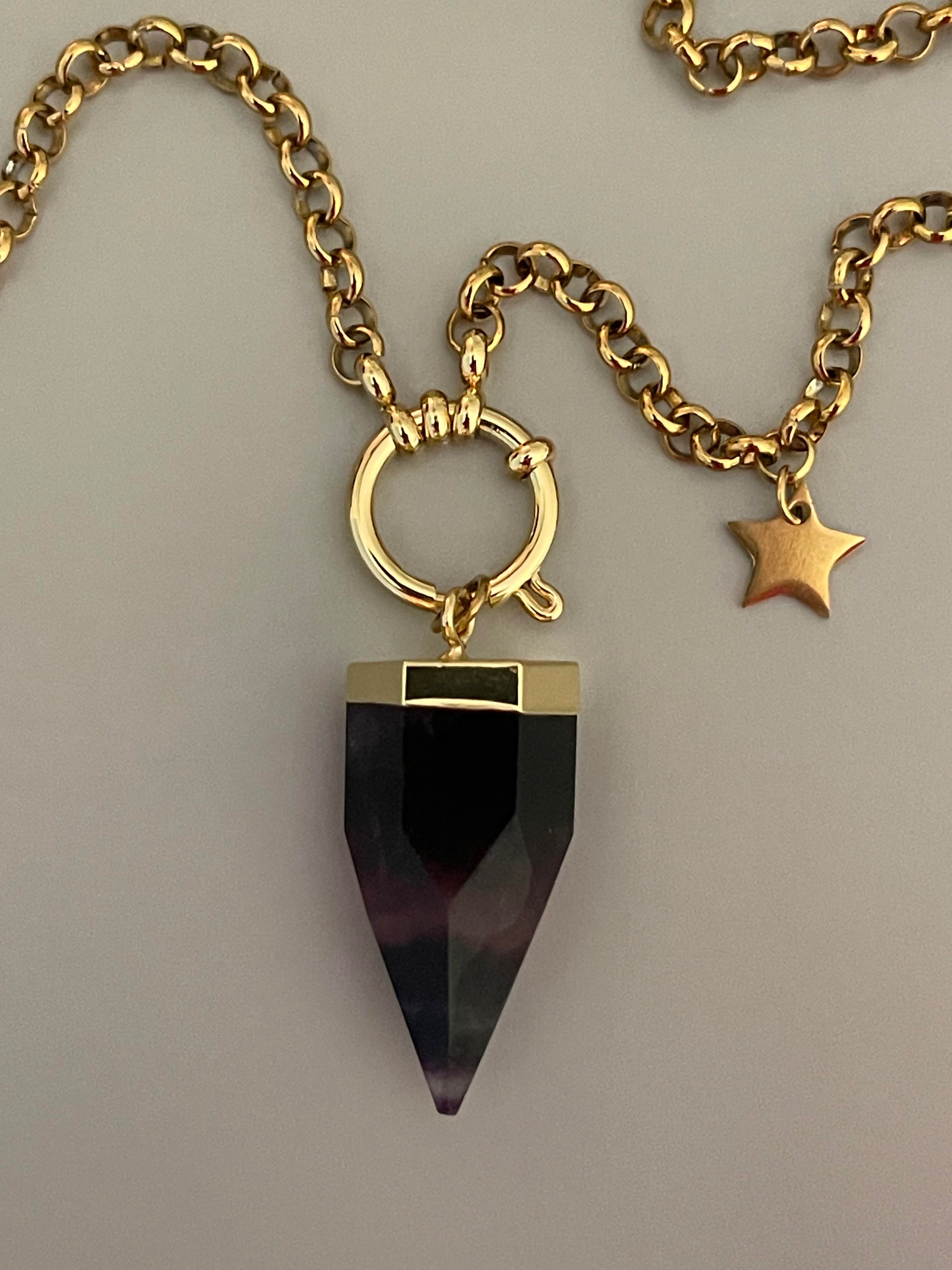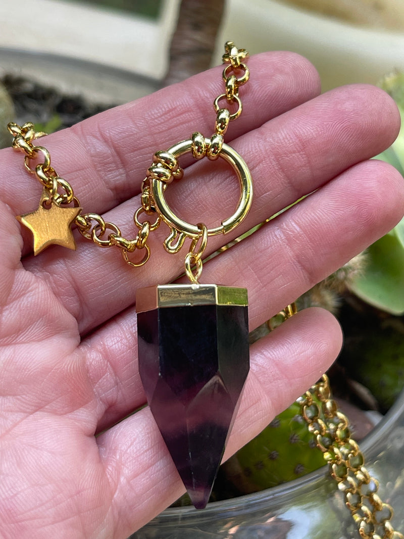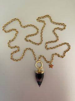 Collar Hippie Chic largo de cadena de acero inoxidable dorado y preciosa piedra natural en tonalidades lilas. Lleva un cierre tipo timón y una estrellita.