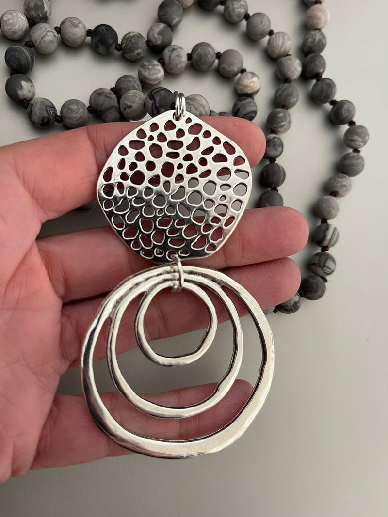 Collar Hippie Chic largo de piedras anudadas en tonos grises y elegante colgante en tonos pateados.
