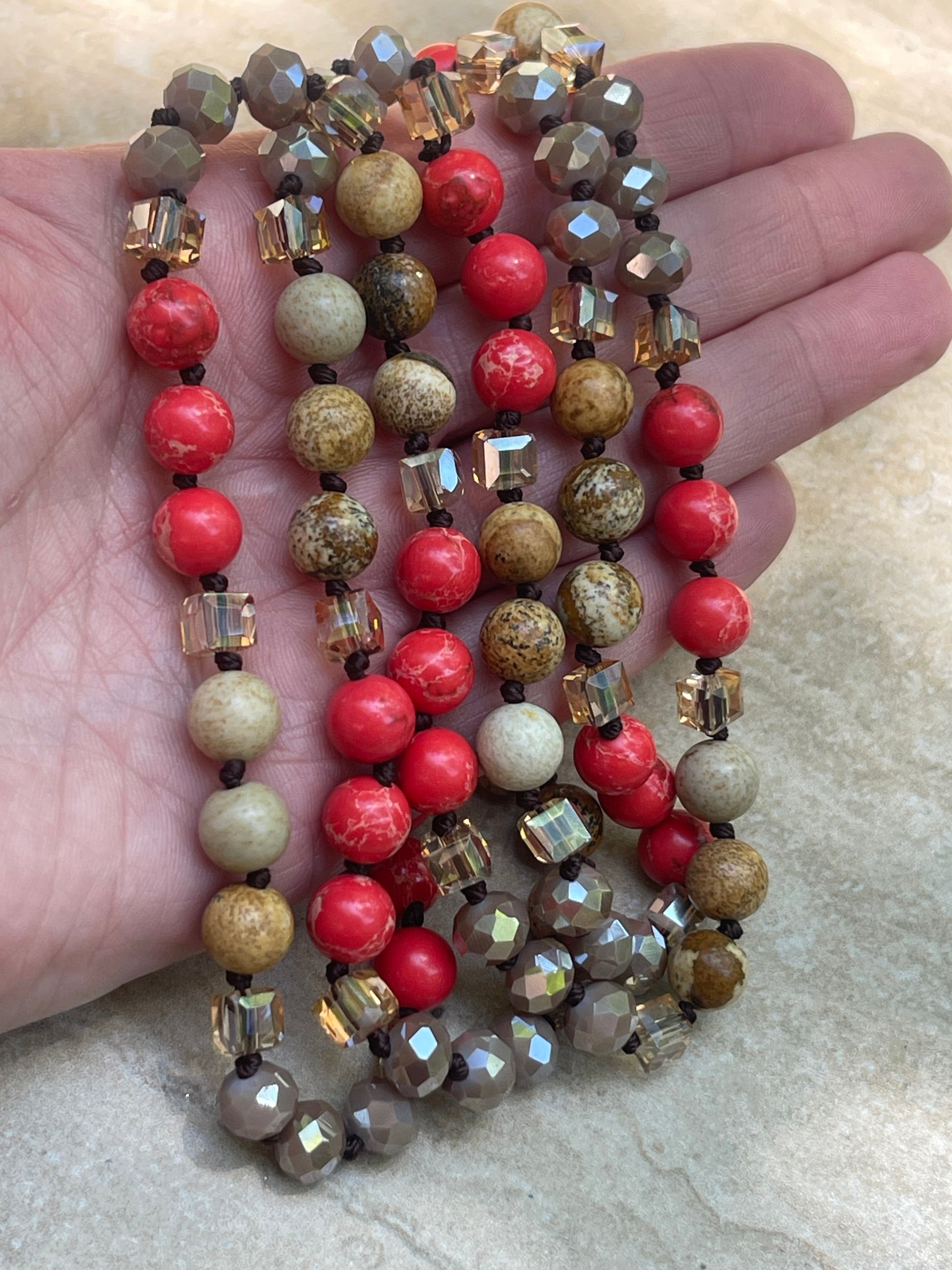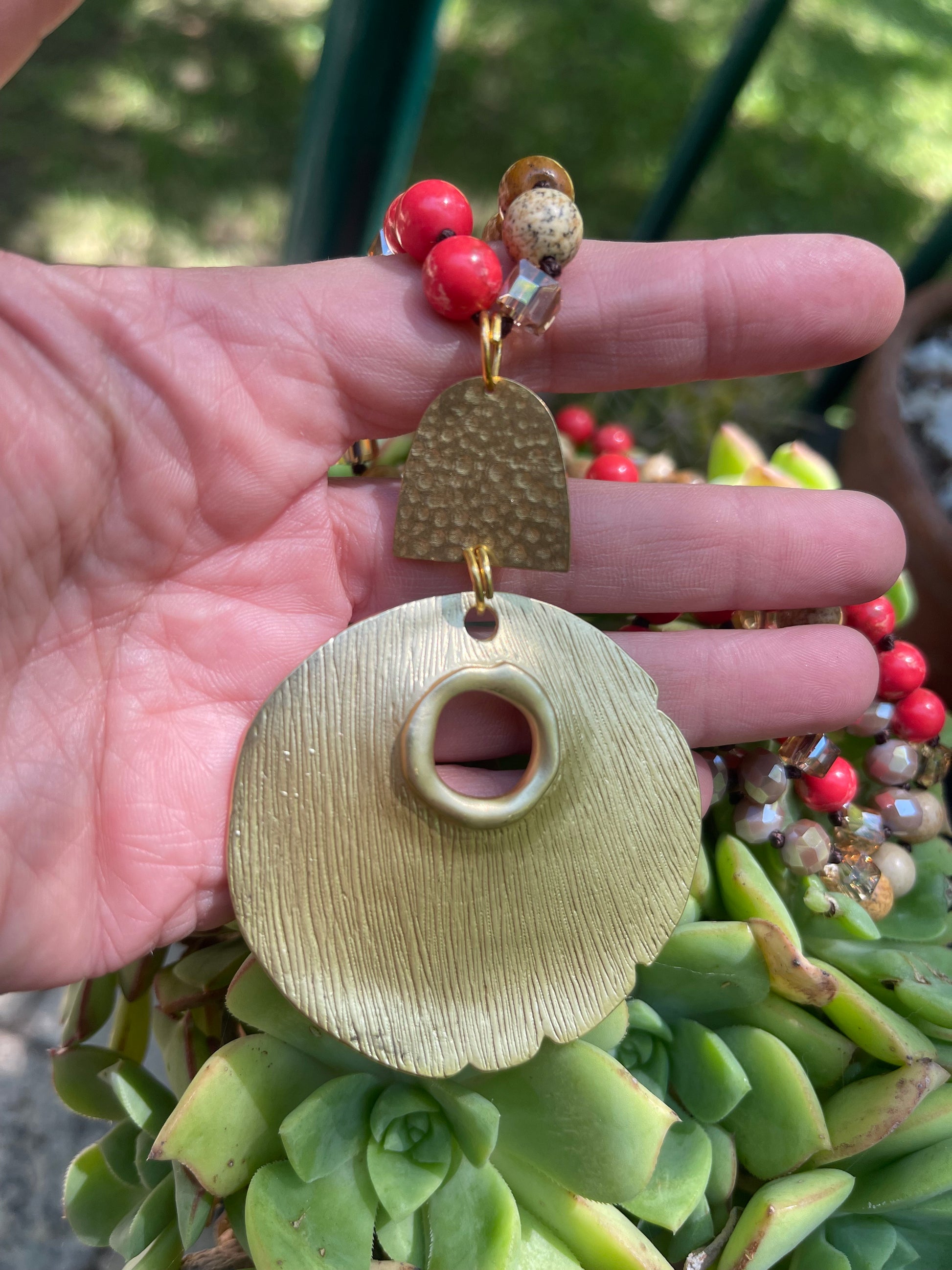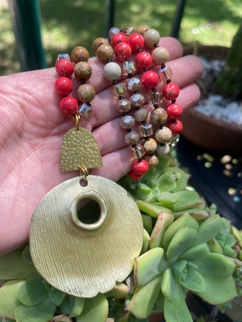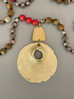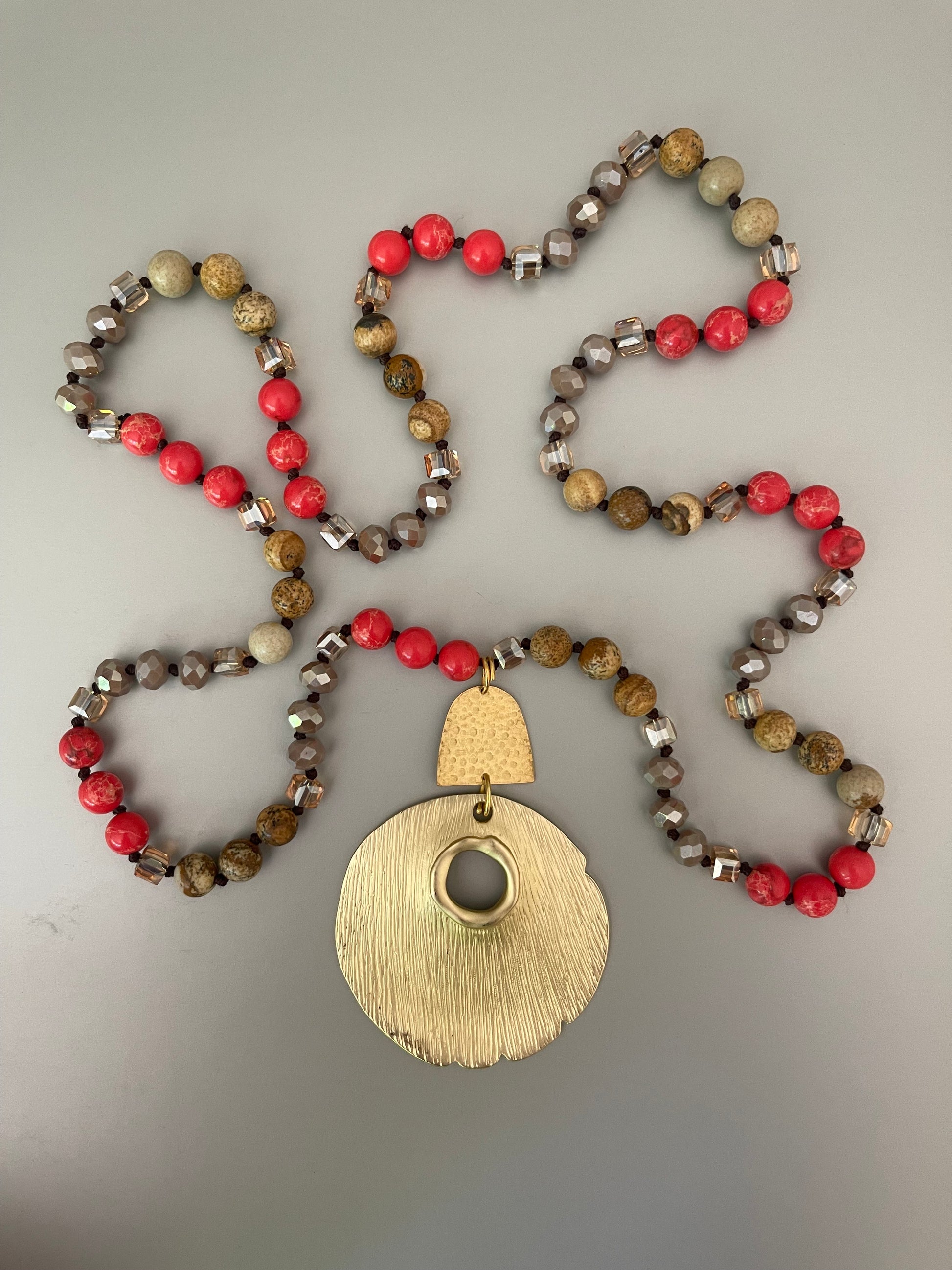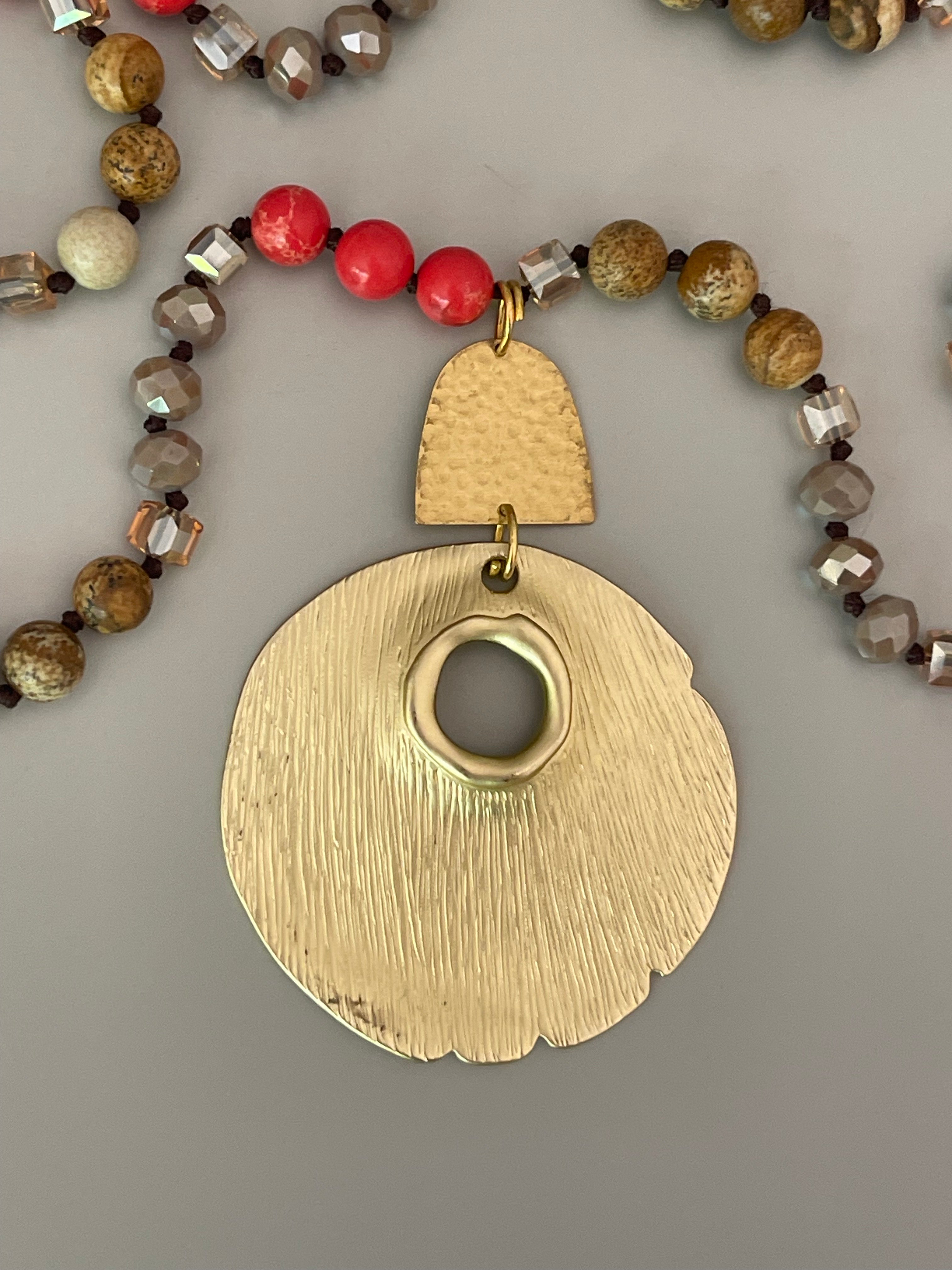 Collar Hippie Chic largo de piedras y cristales anudados en tonos naranjos y beige con elegante colgante dorado.