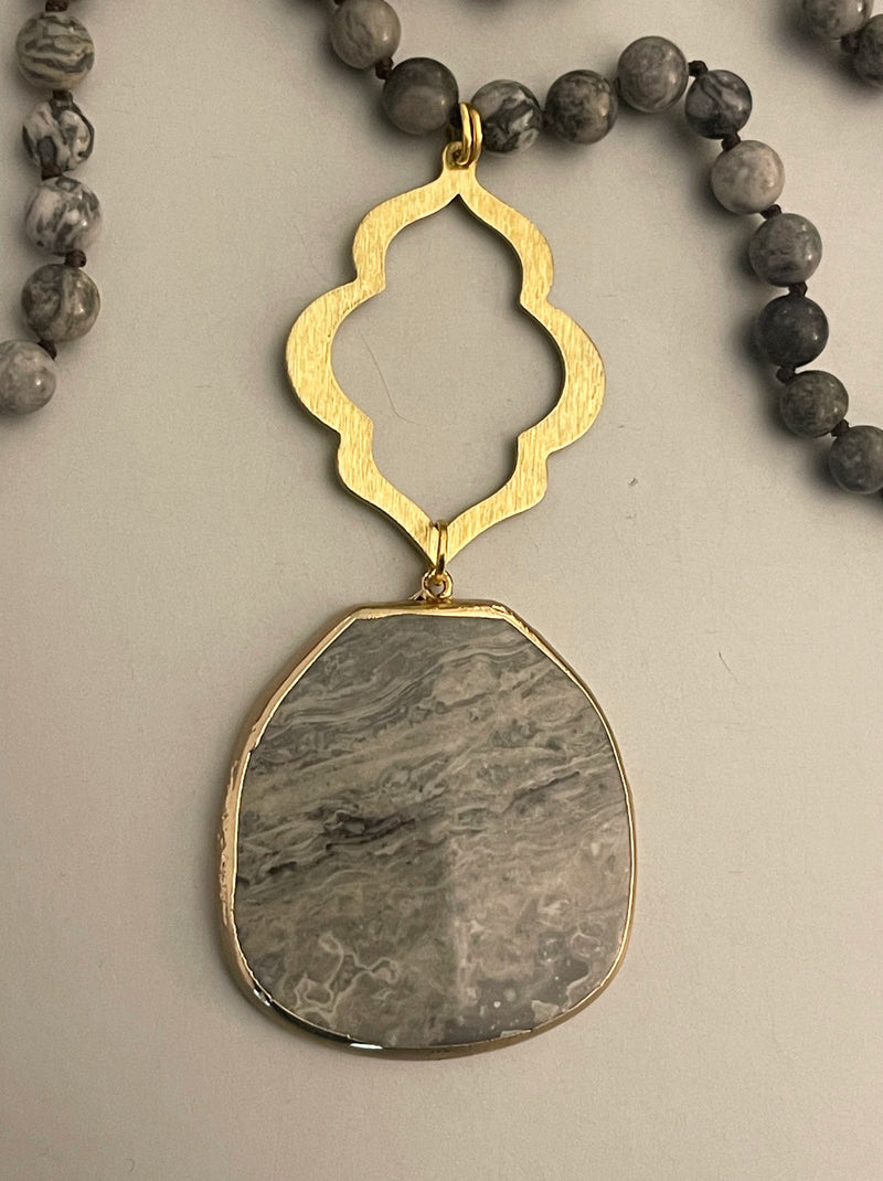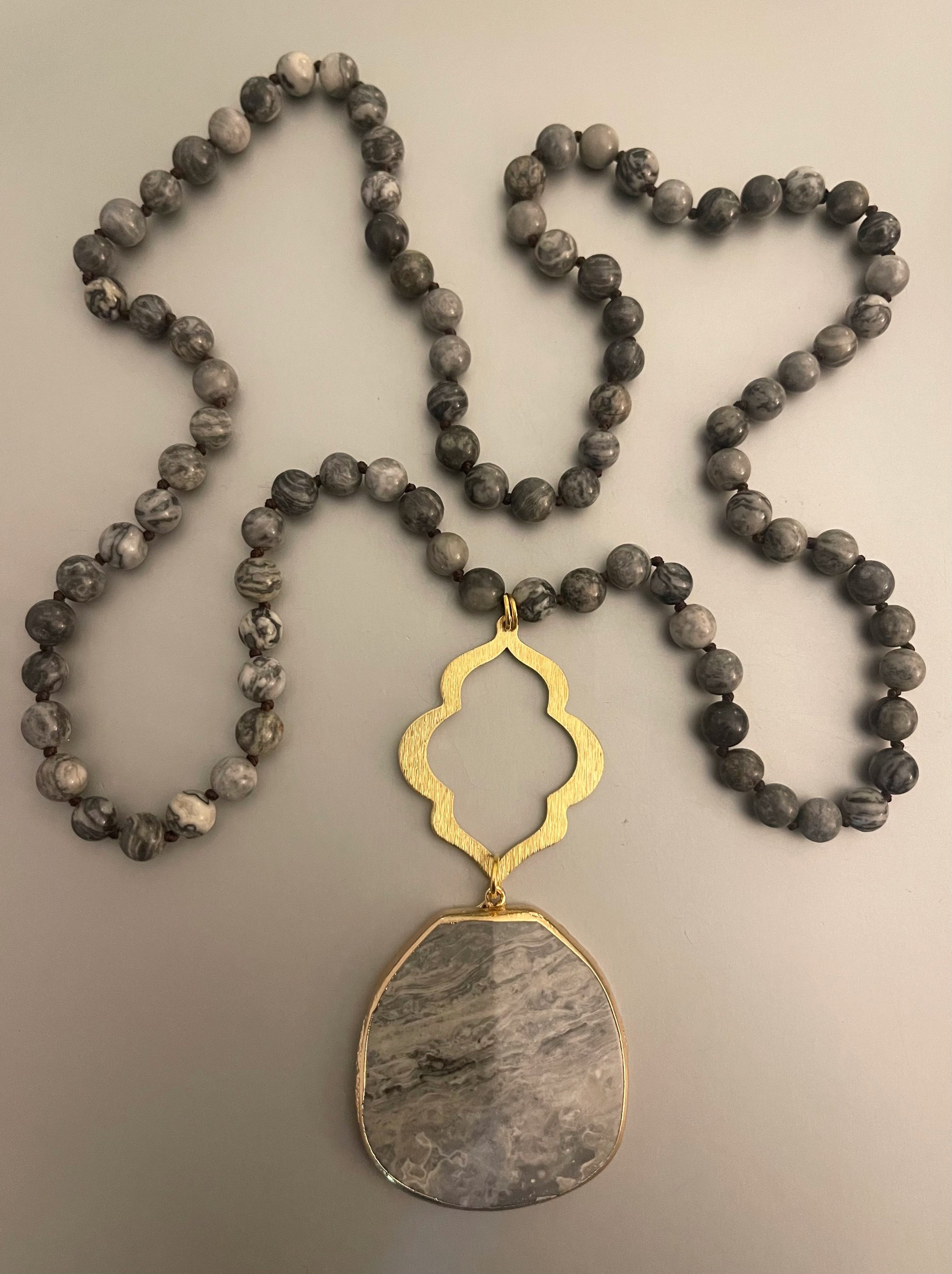 Collar Hippie Chic largo de elegantes piedras en tonos grises anudadas y conector dorado.