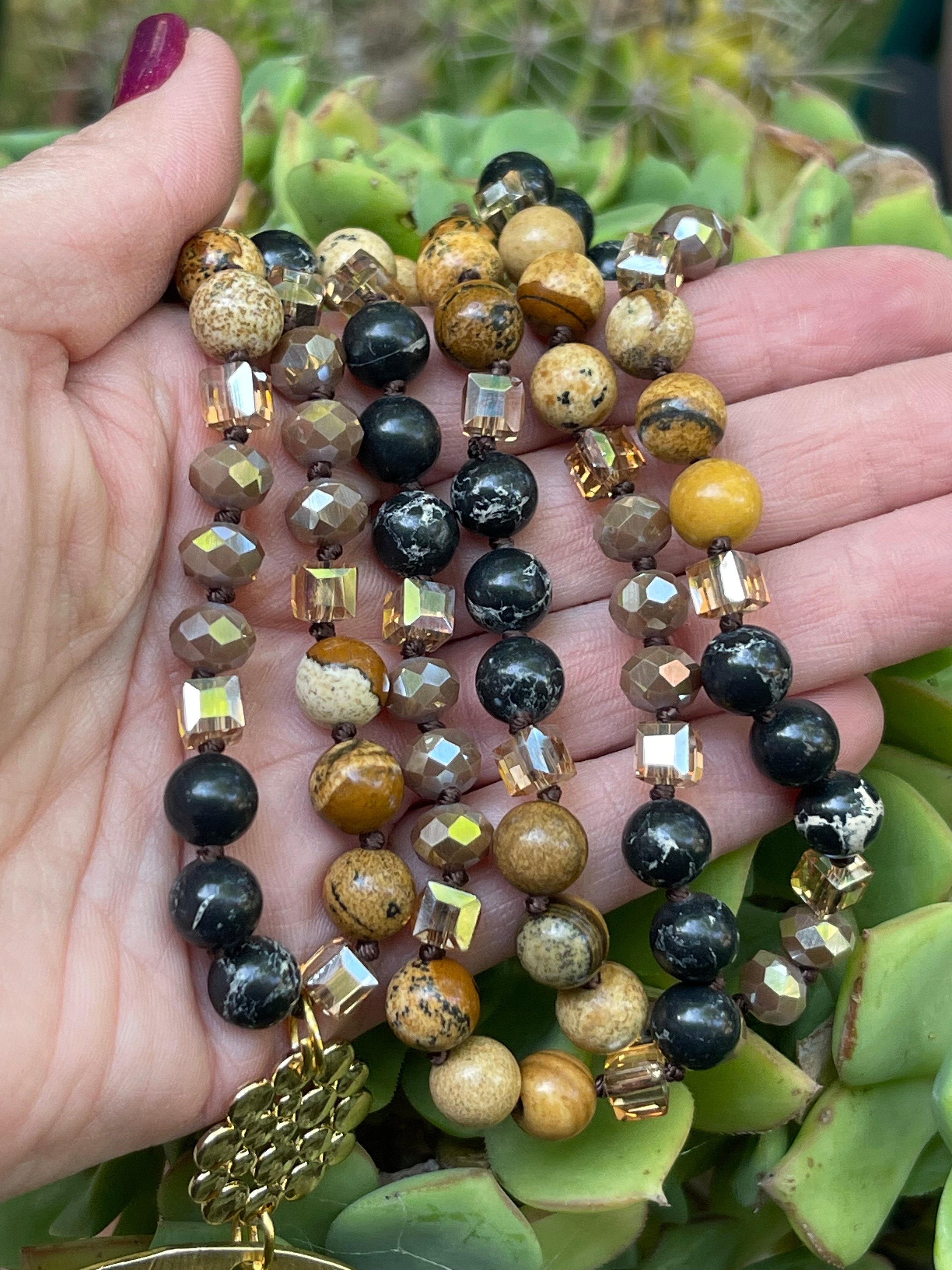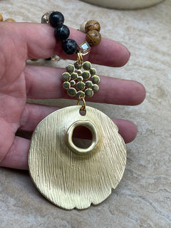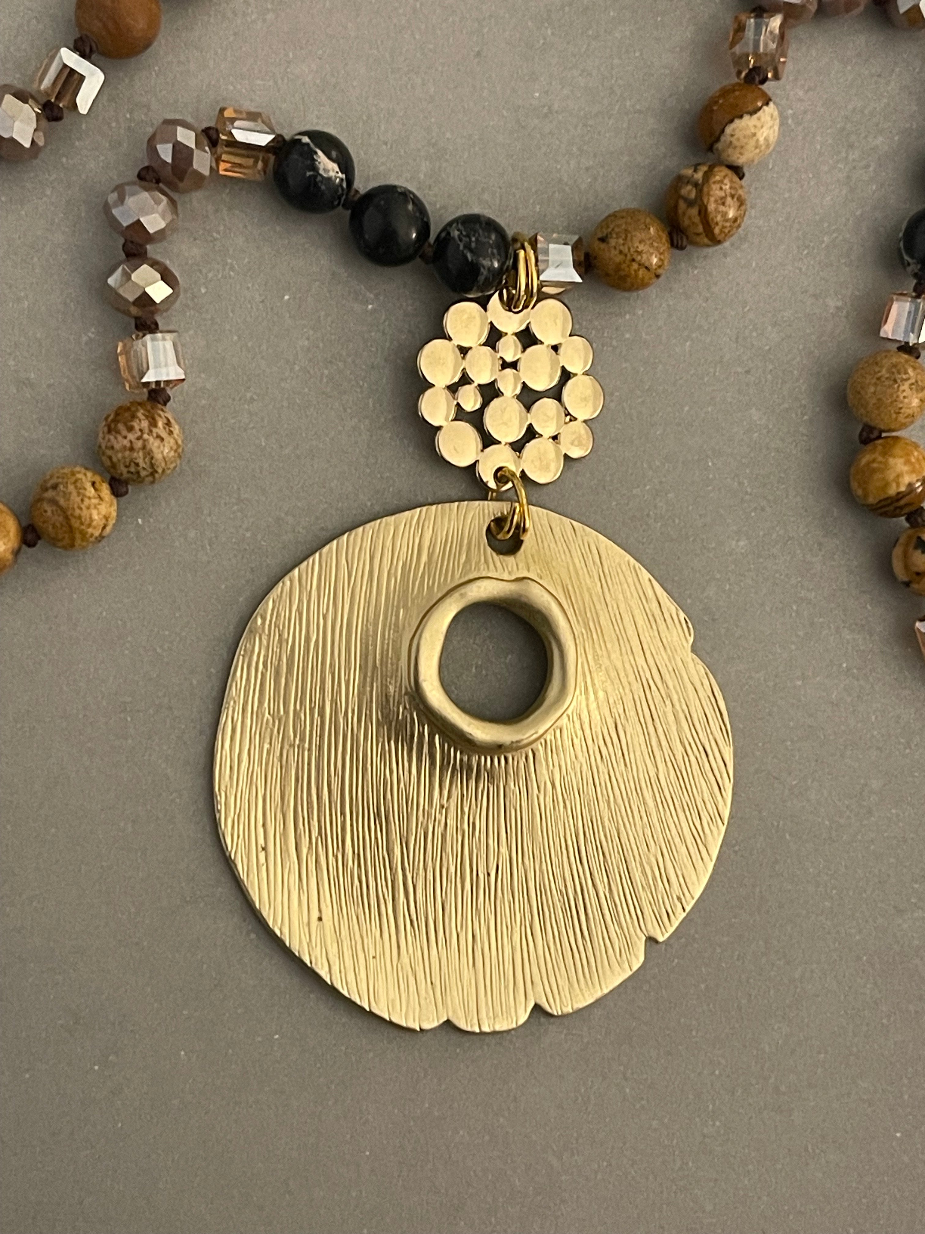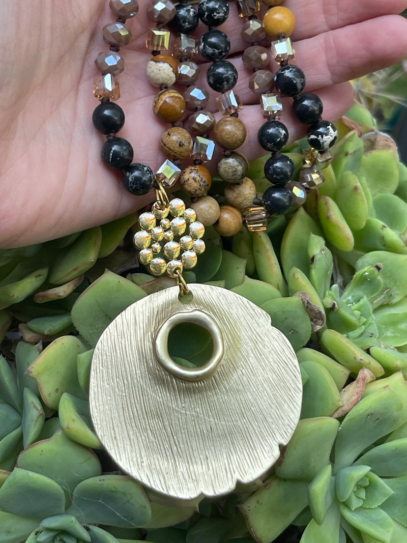 Collar Hippie Chic largo de piedras naturales y cristales anudados en tonos beige y negro con maravilloso colgante dorado.