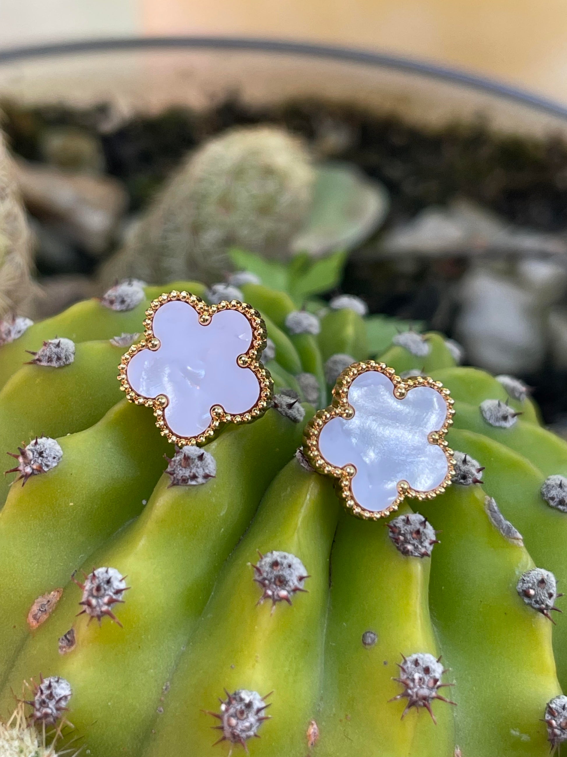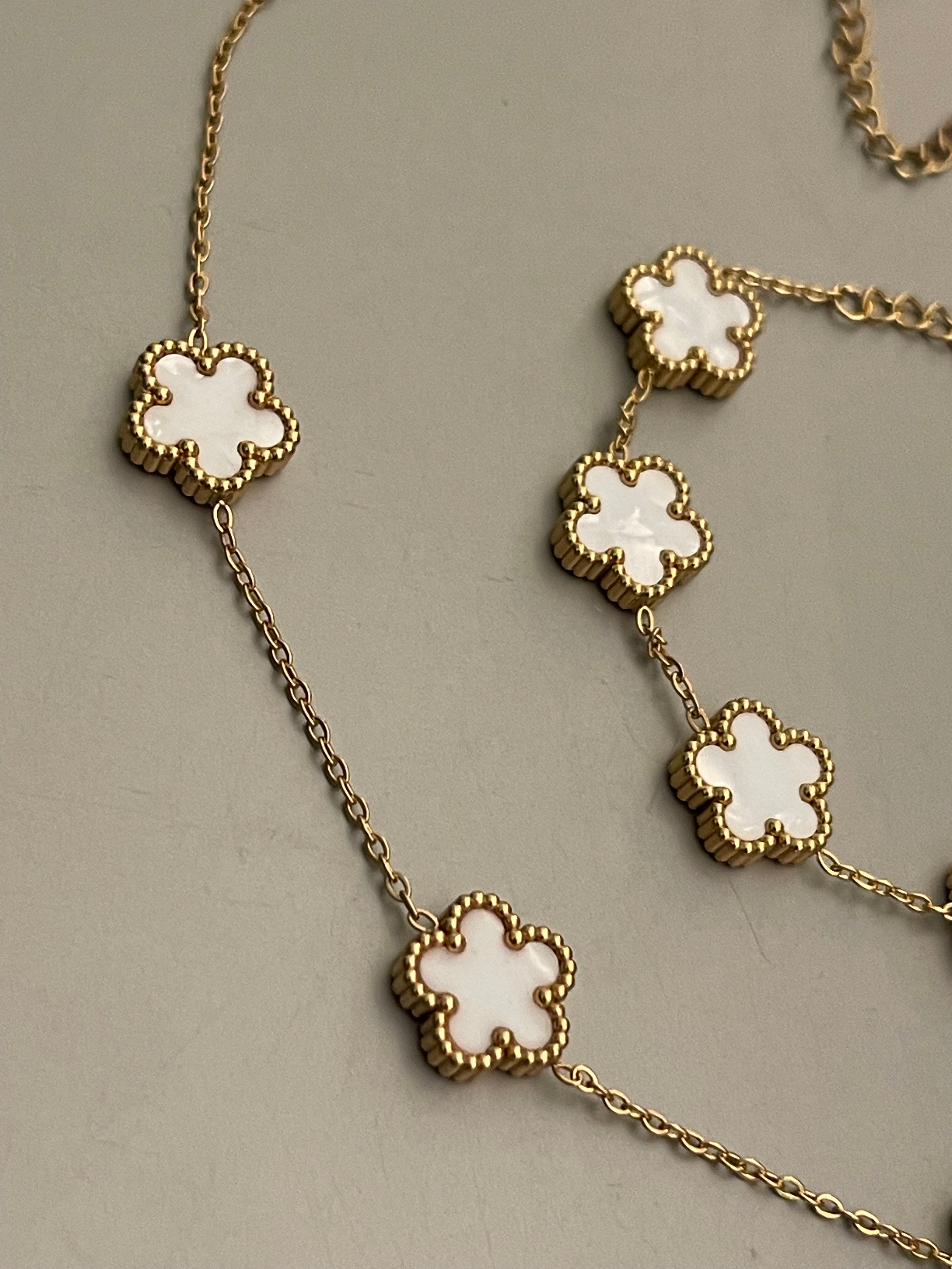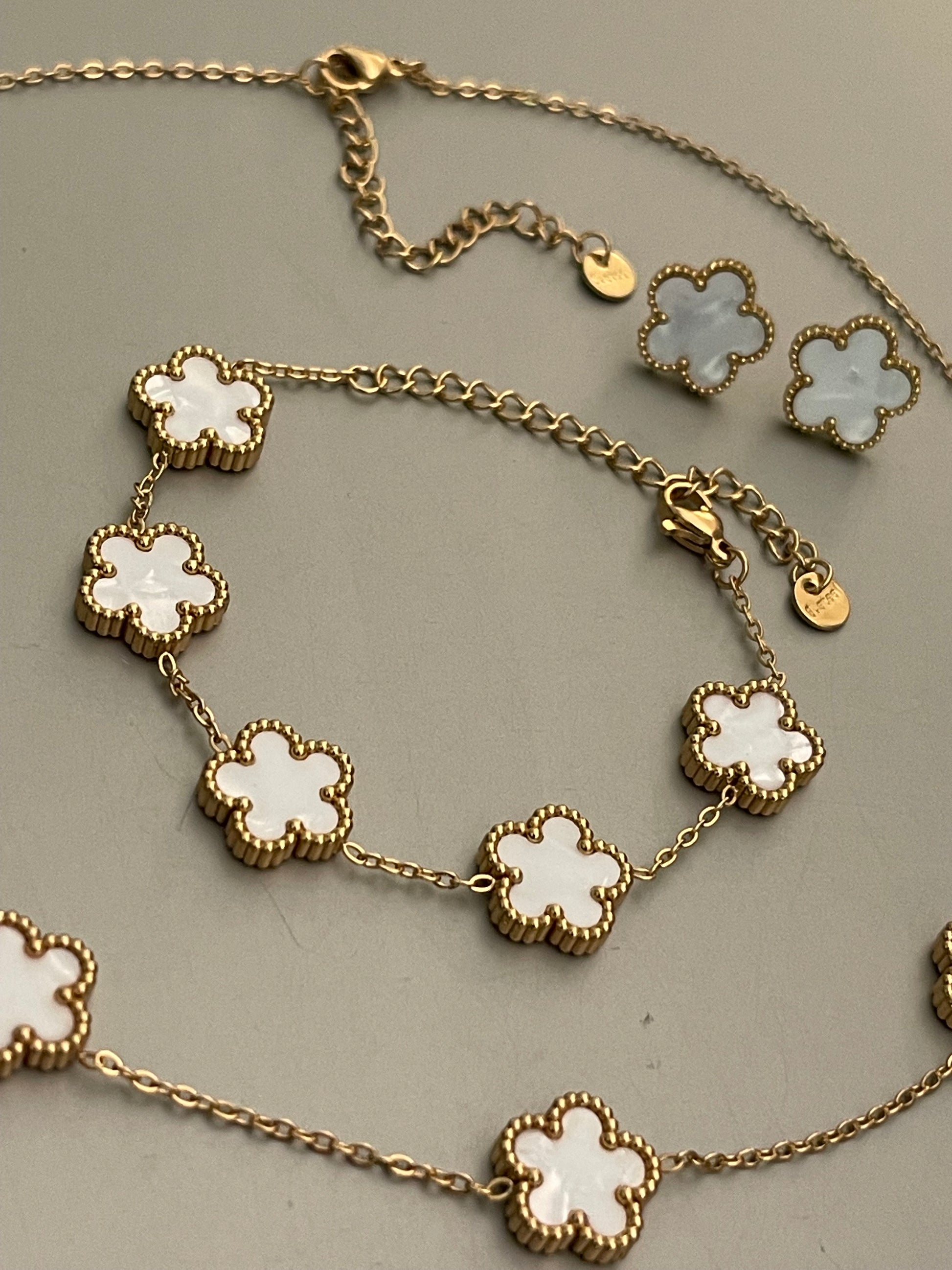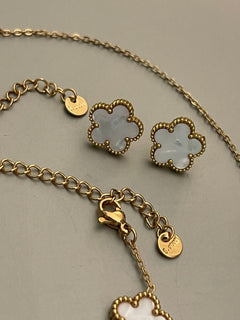 Conjunto Hippie Chic de acero inoxidable dorado y acrilico blanco, compuesto por un precioso collar corto, pulsera y aros.