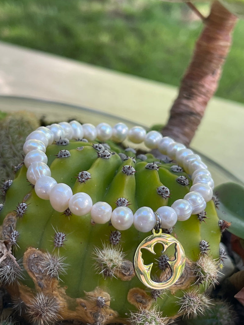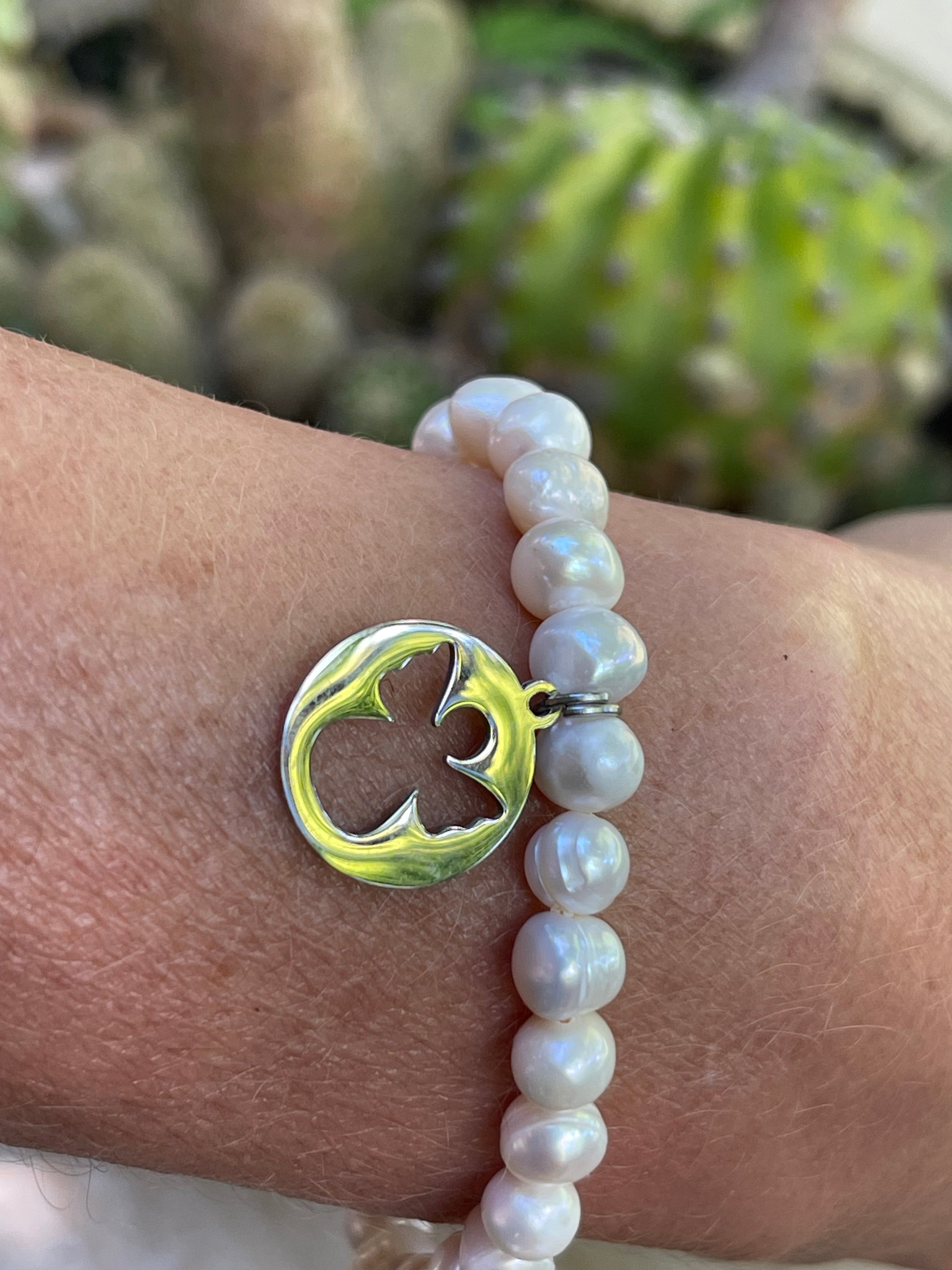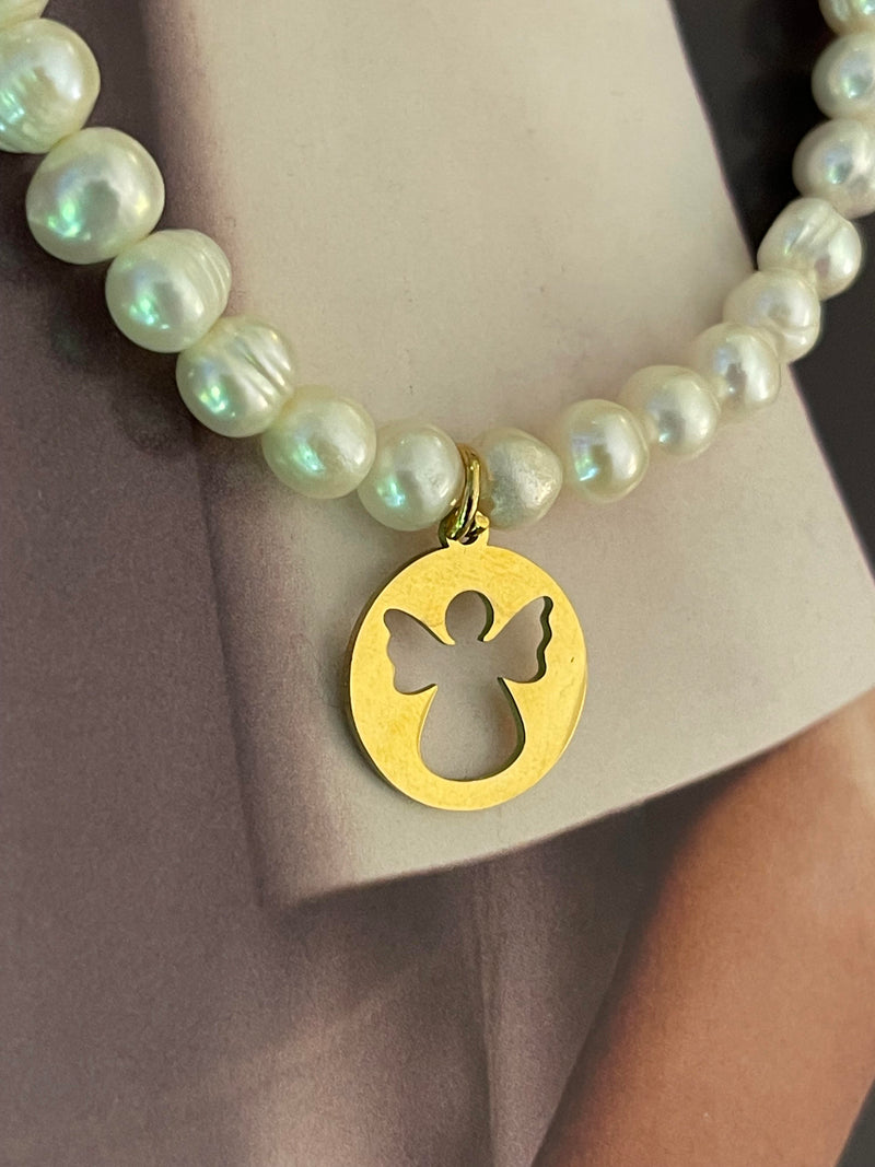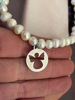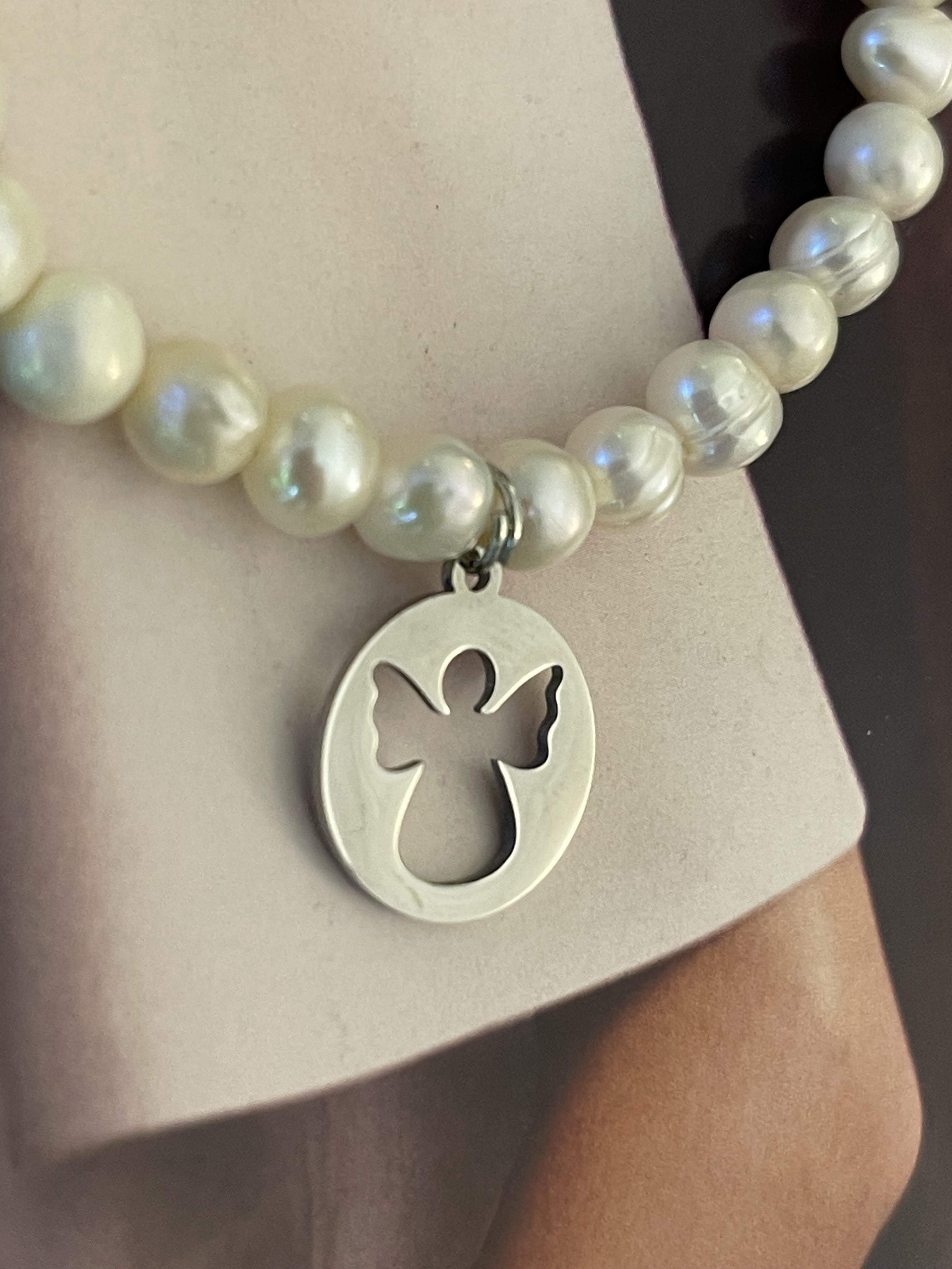 Pulsera Hippie Chic elasticada de elegantes perlas naturales blancas y colgante de angelito en acero inoxidable plateado.