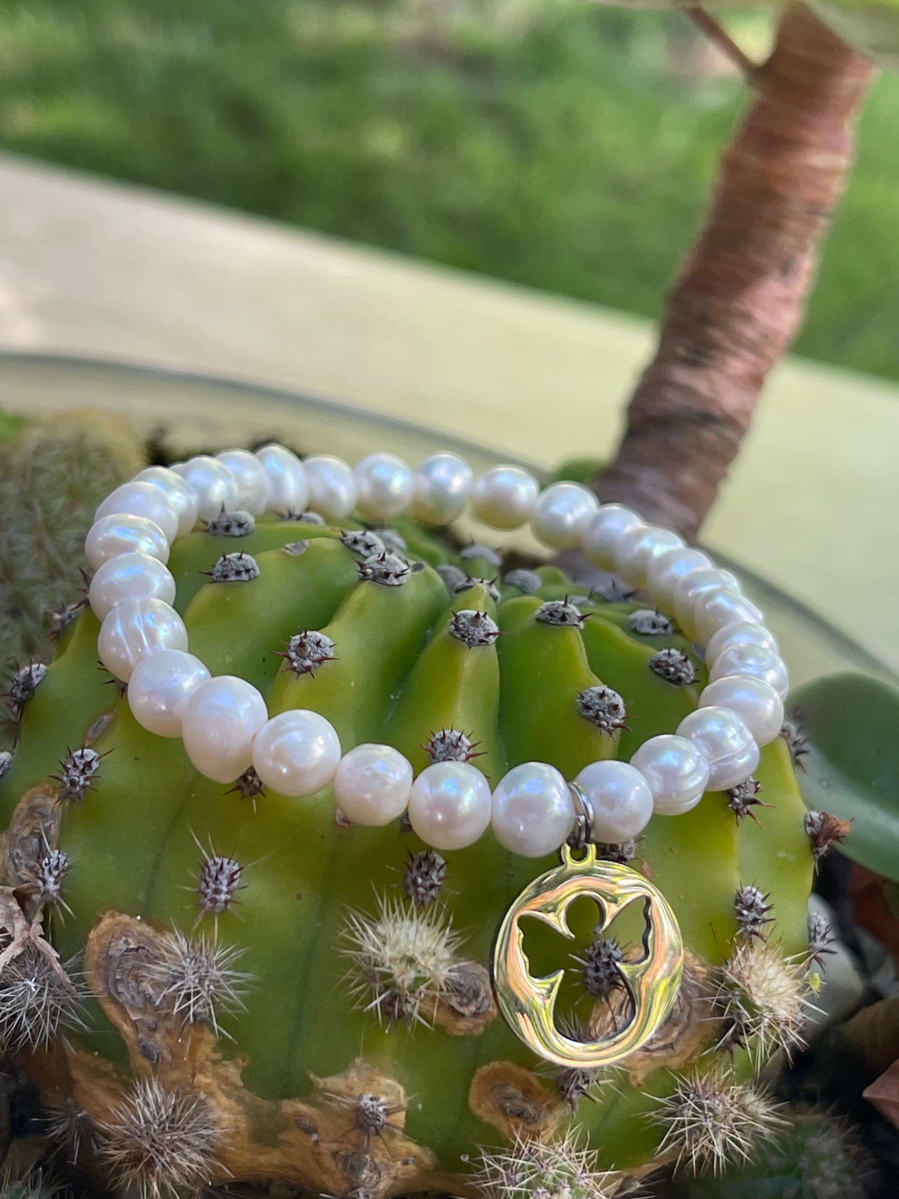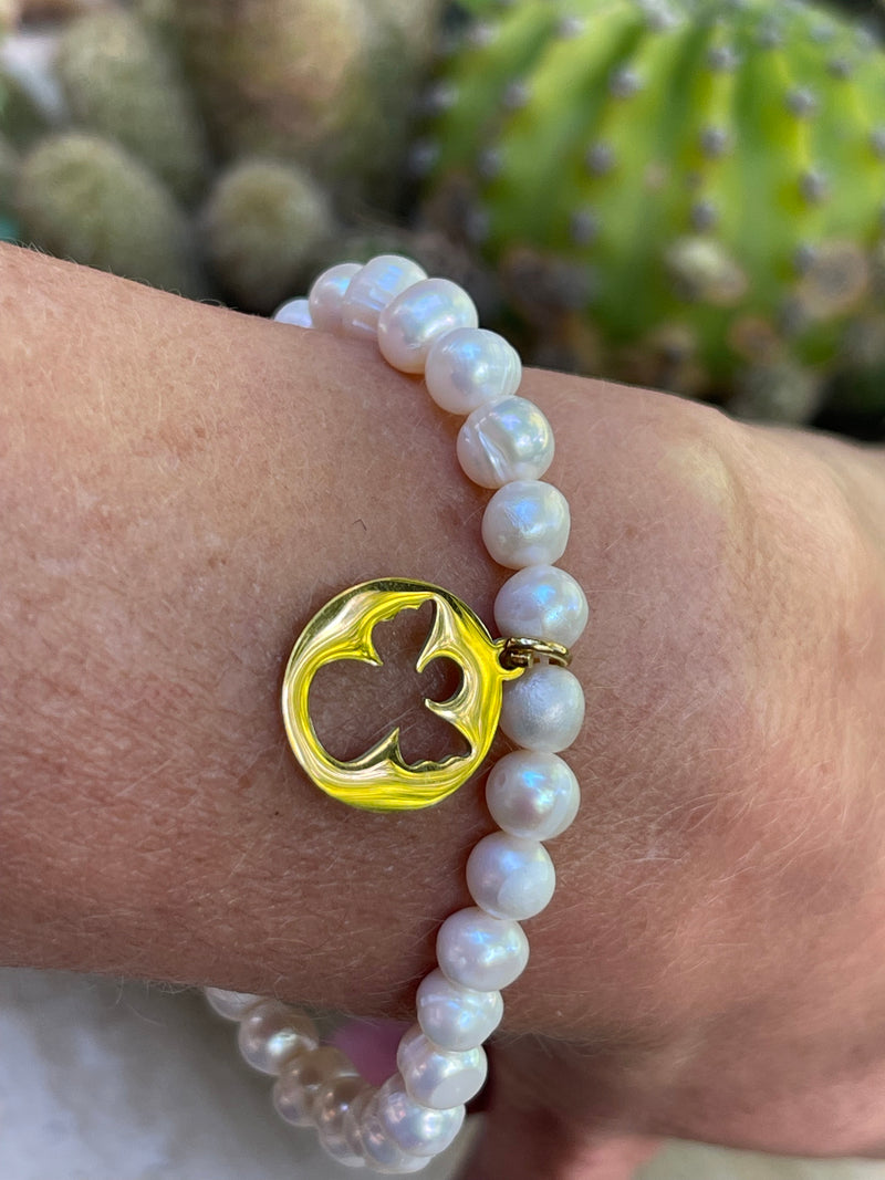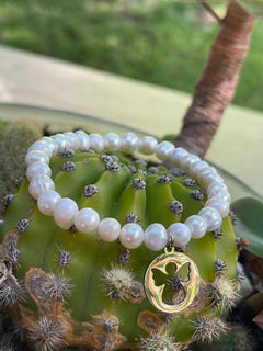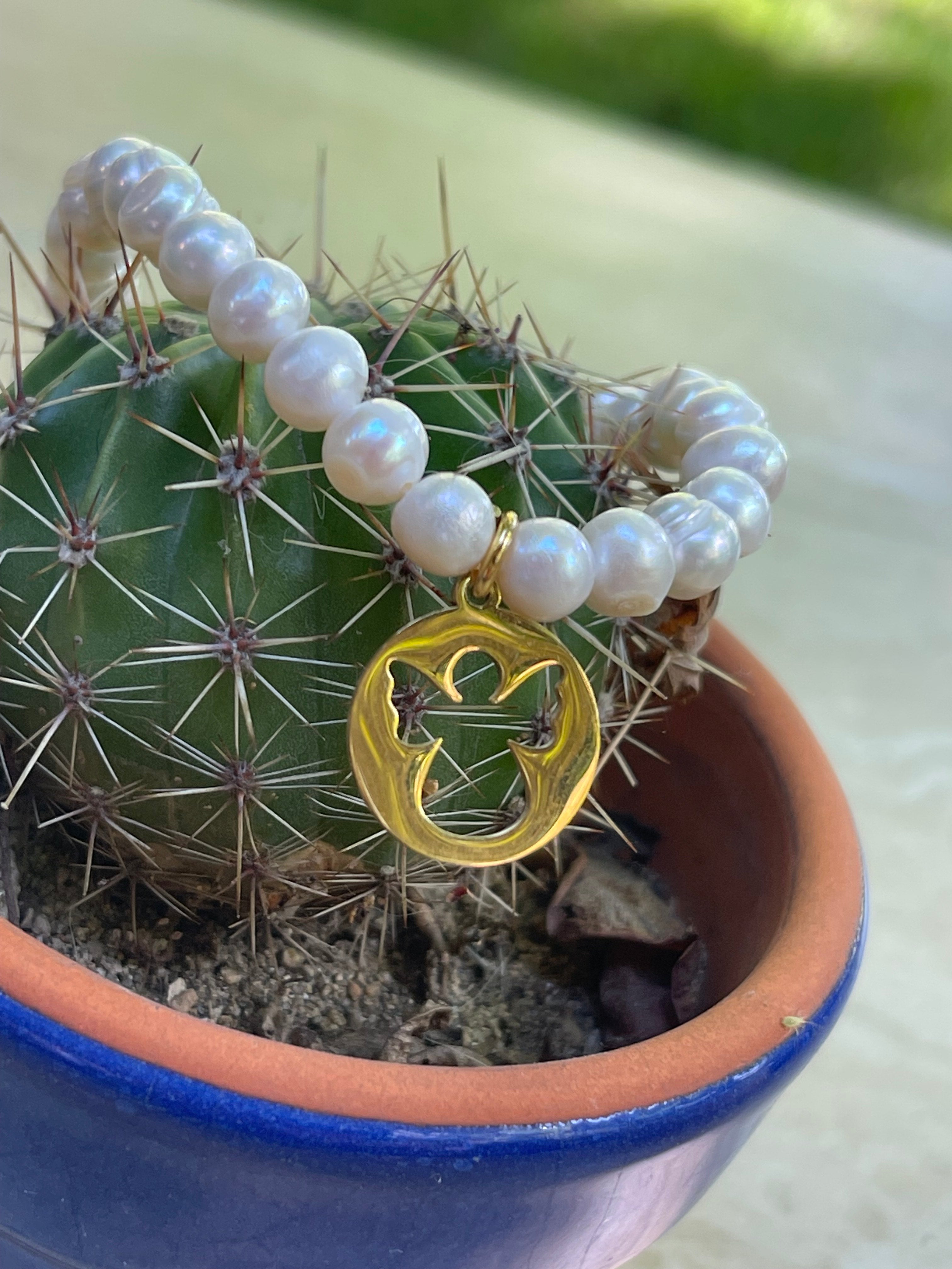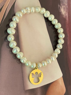 Pulsera Hippie Chic elasticada de finas perlas naturales blancas y colgante de Angelito en acero inoxidable dorado.