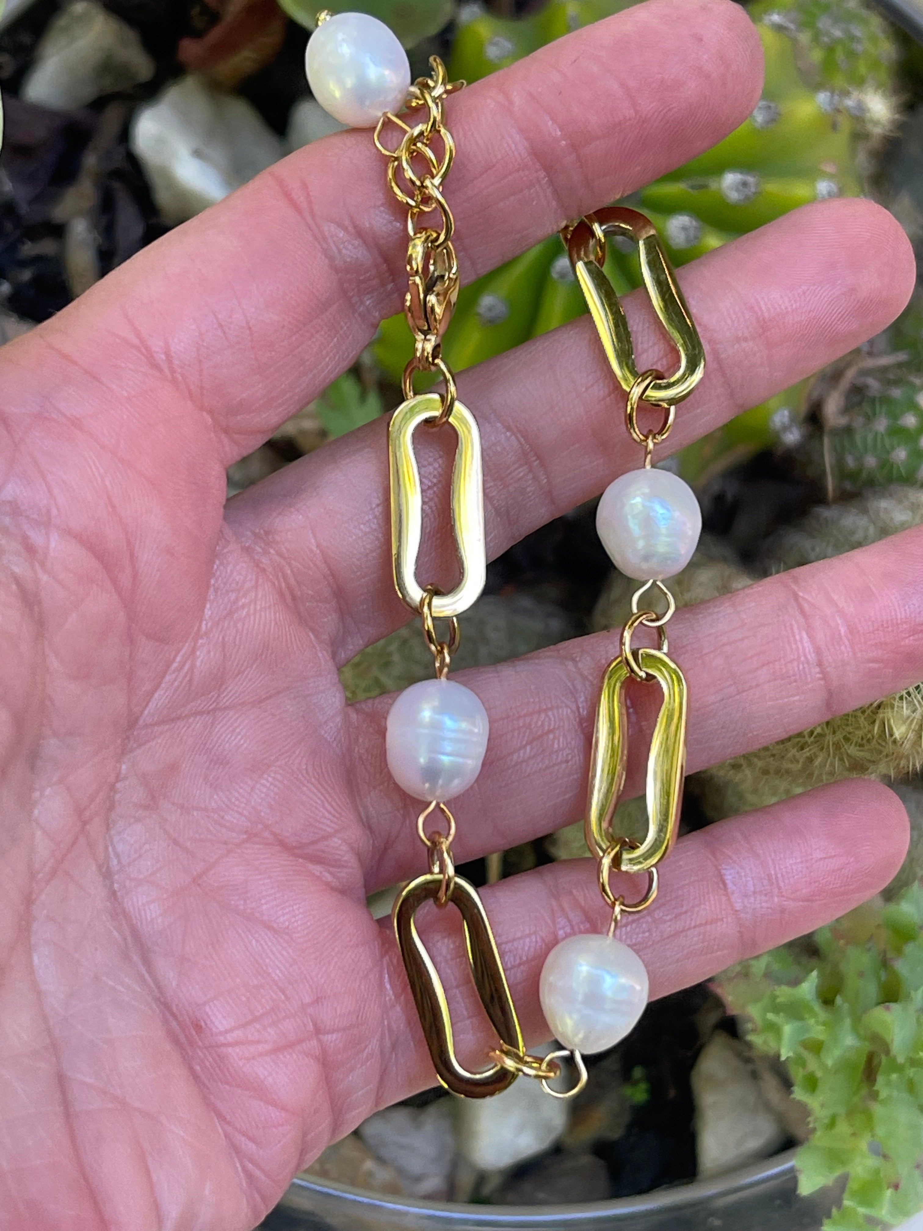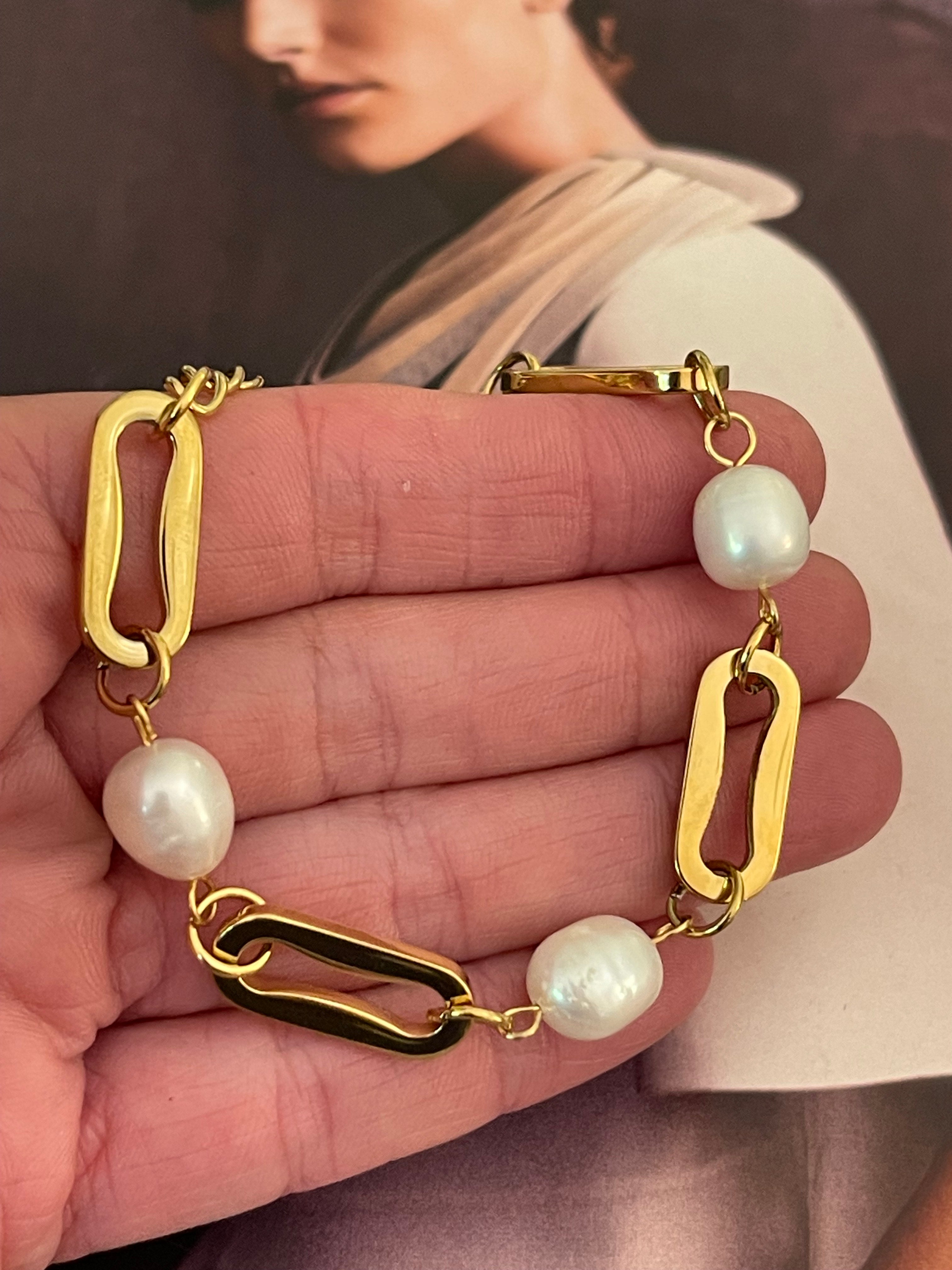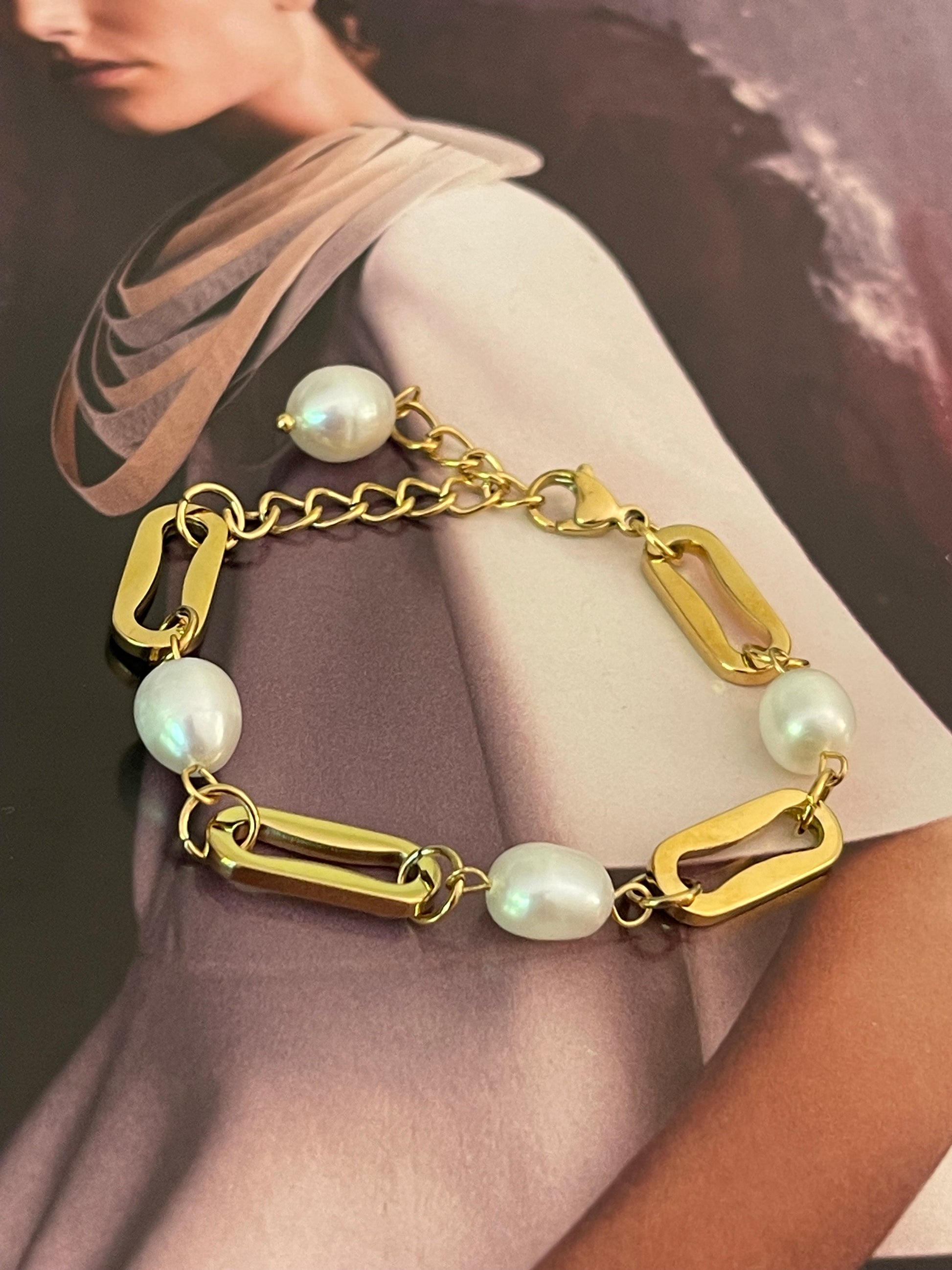 Pulsera Hippie Chic acero inoxidable dorado de eslabones gruesos, con perlas naturales de agua dulce