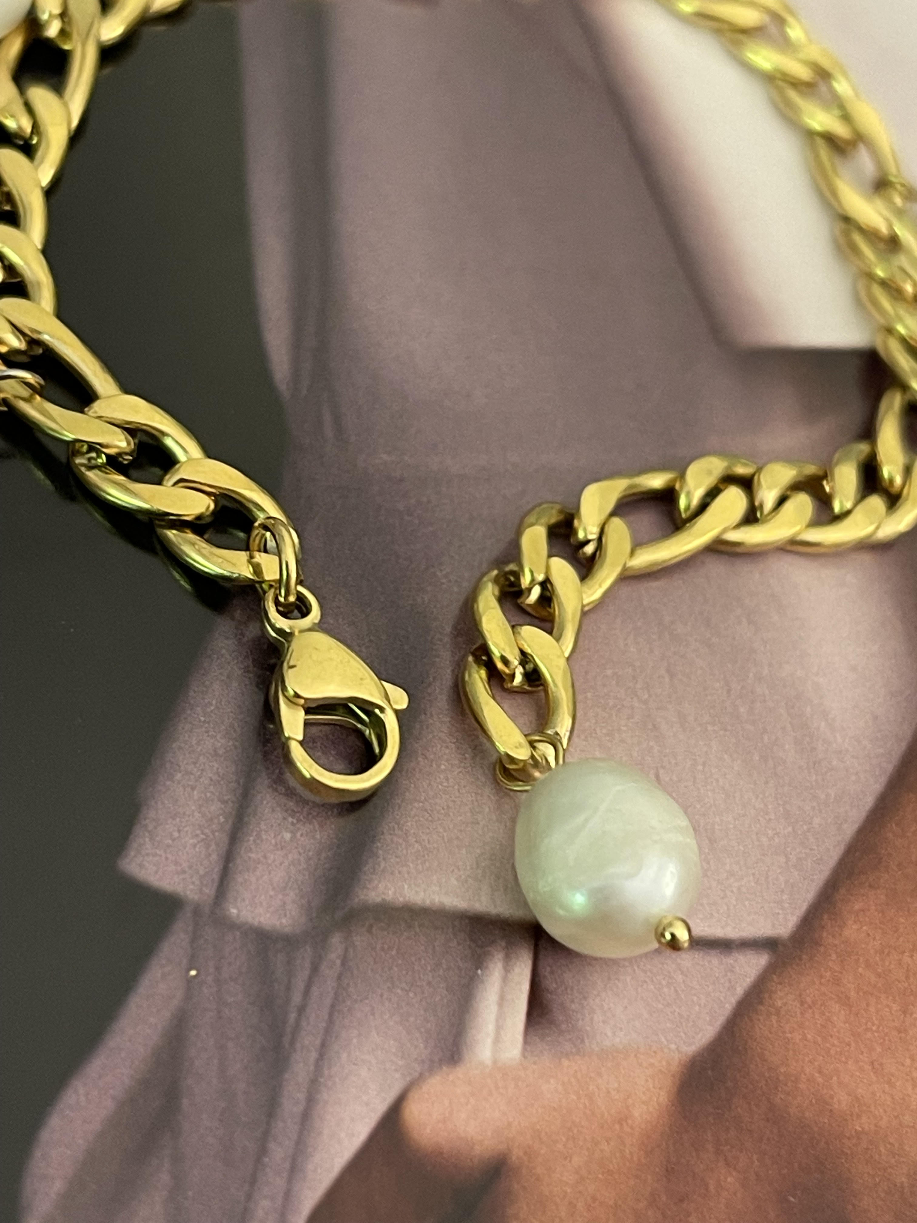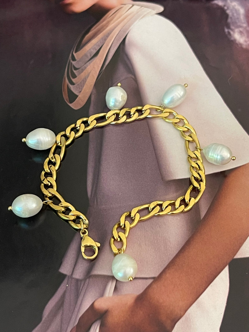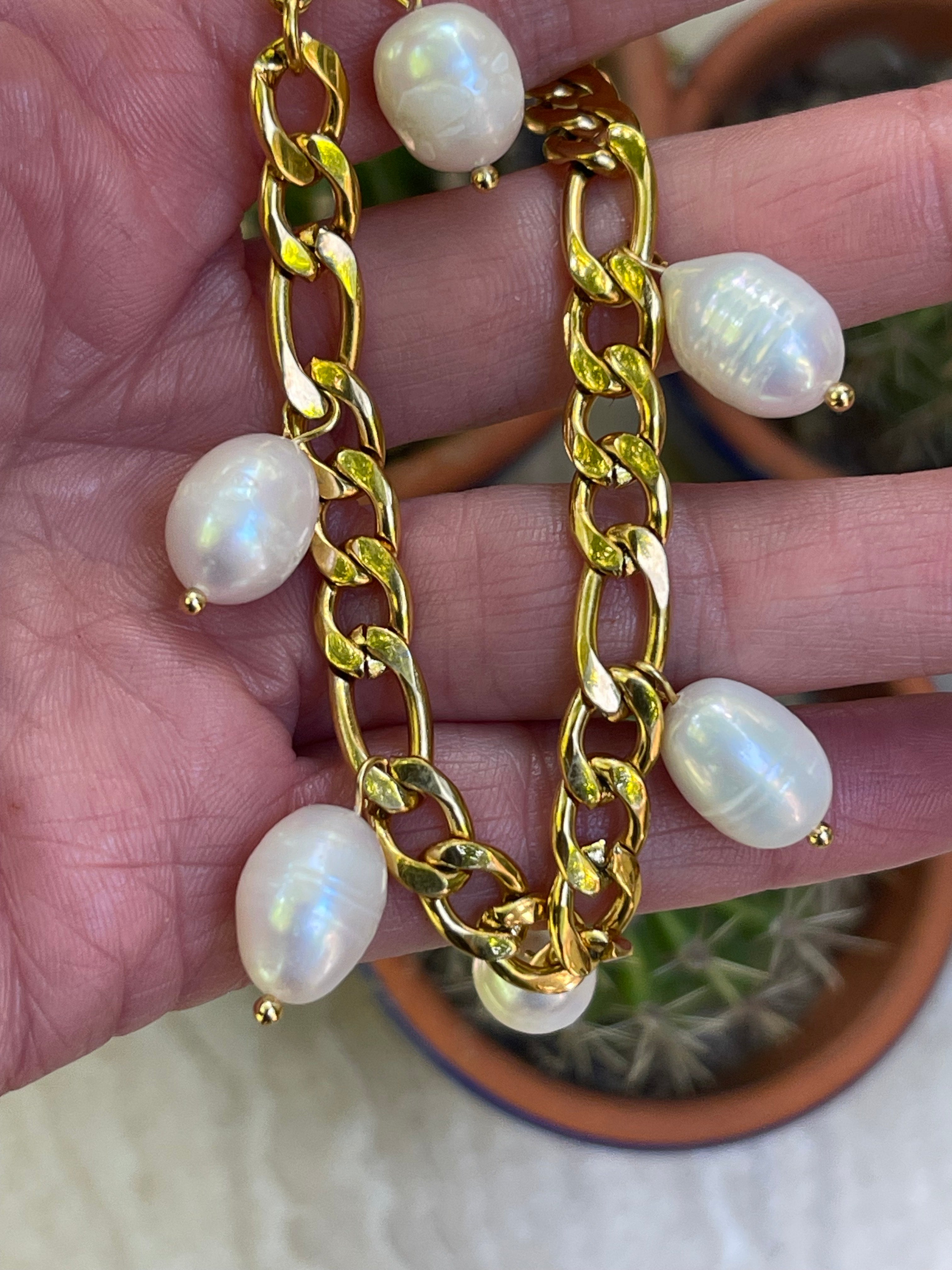 Pulsera Hippie Chic de cadena gruesa de acero inoxidable dorado y preciosas perlas naturales blancas